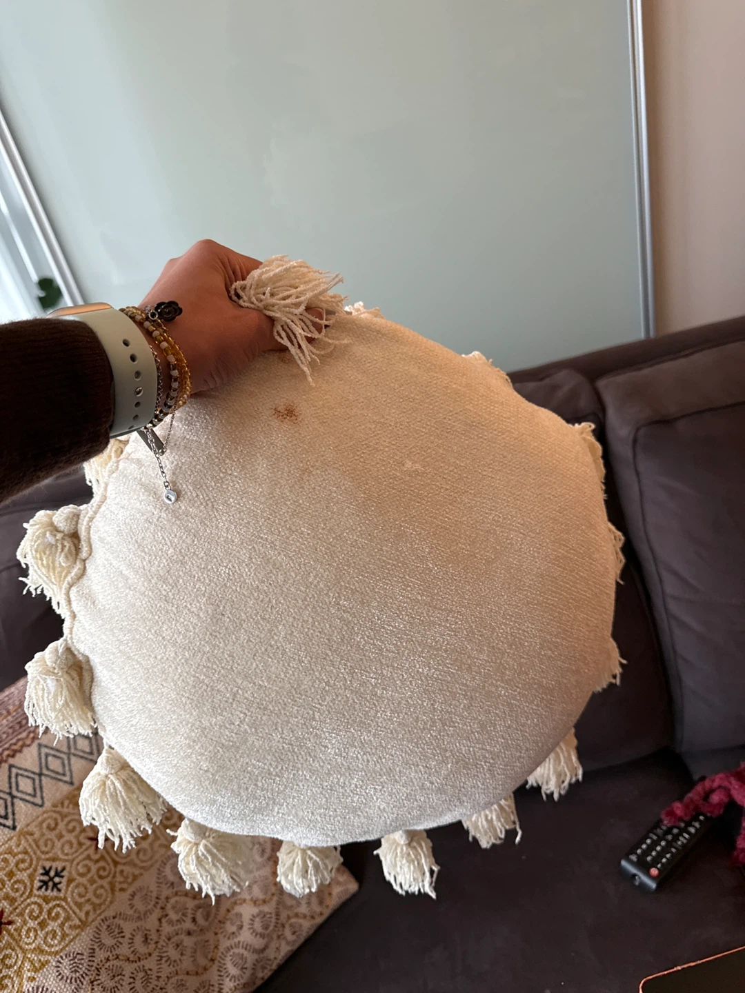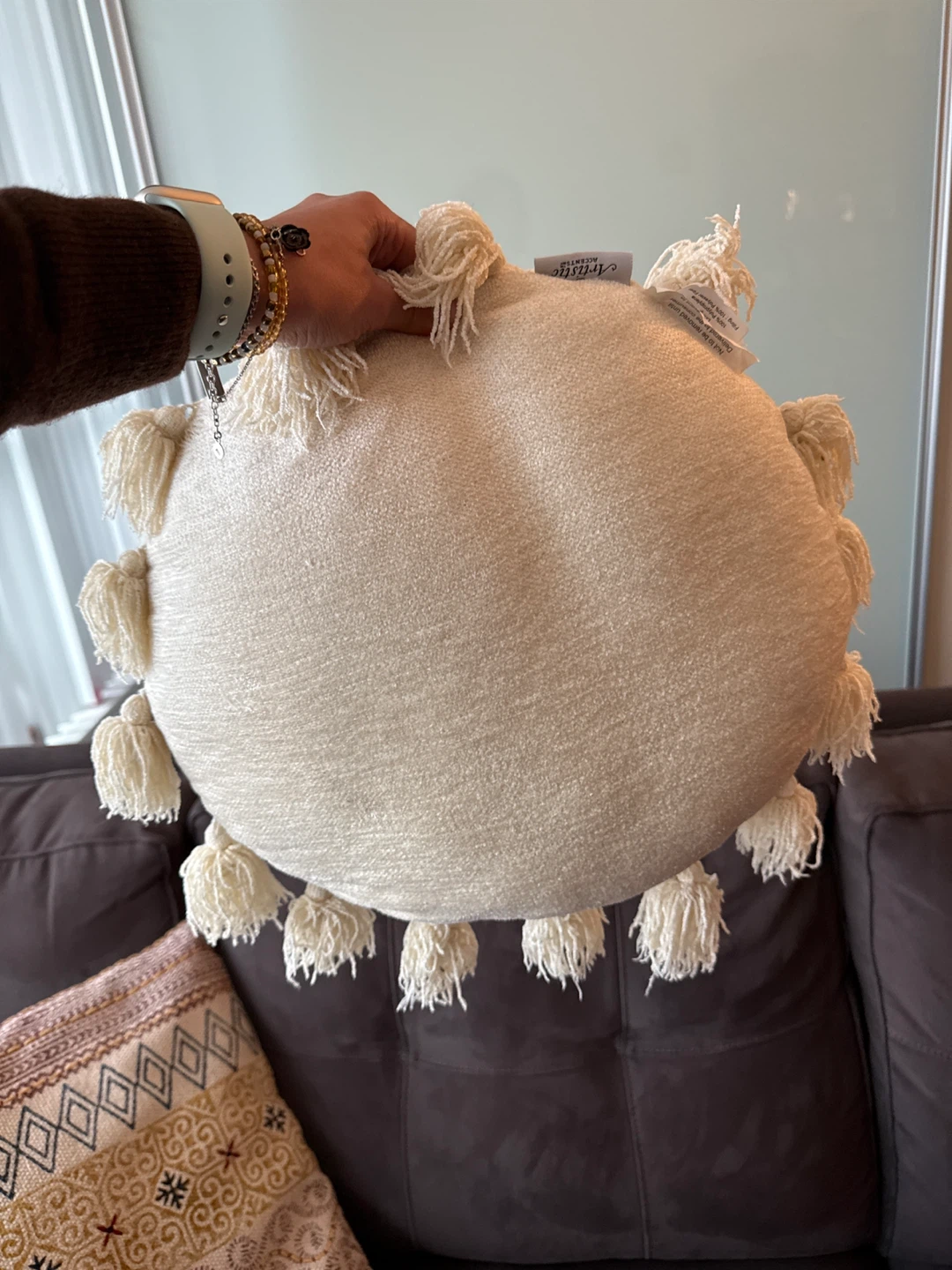 Selling a round pillow with tassel details! It's a cute accent piece for any living room or bedroom. It is in okay condition.