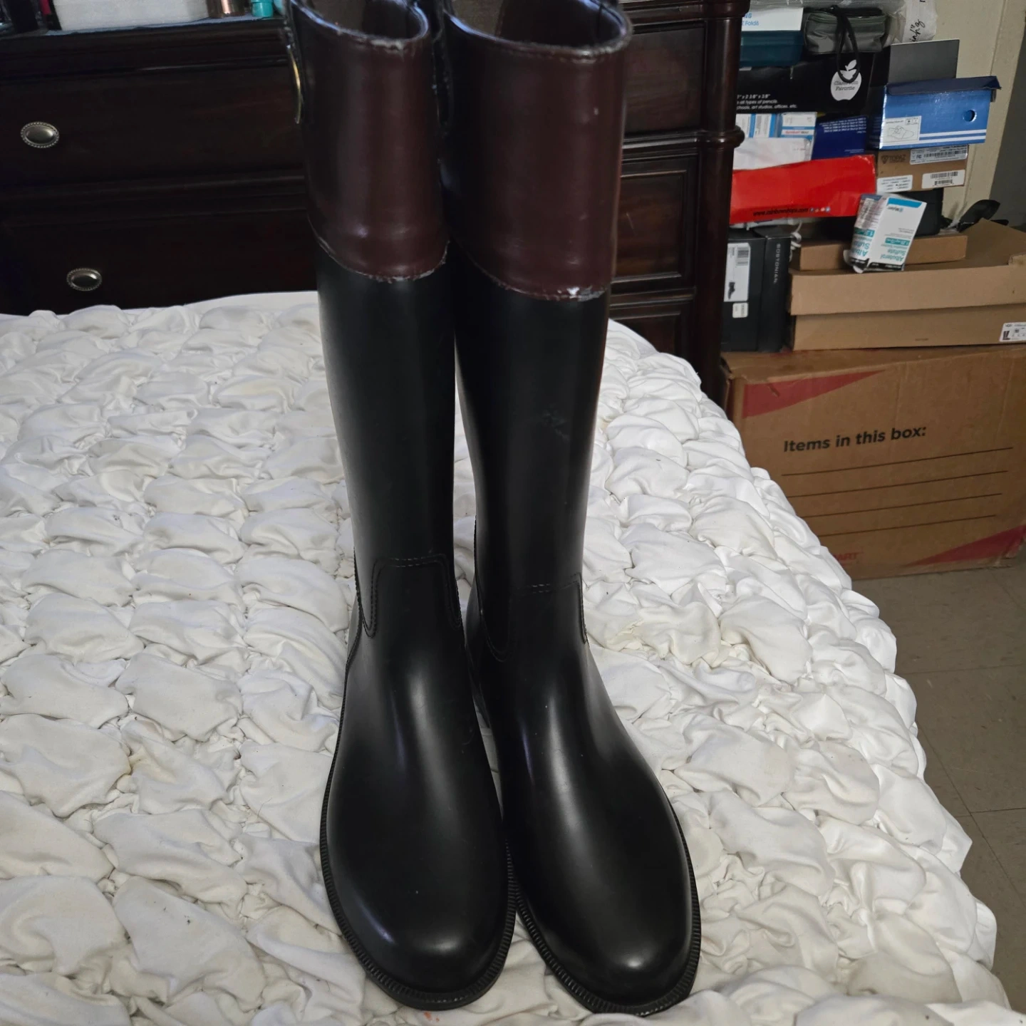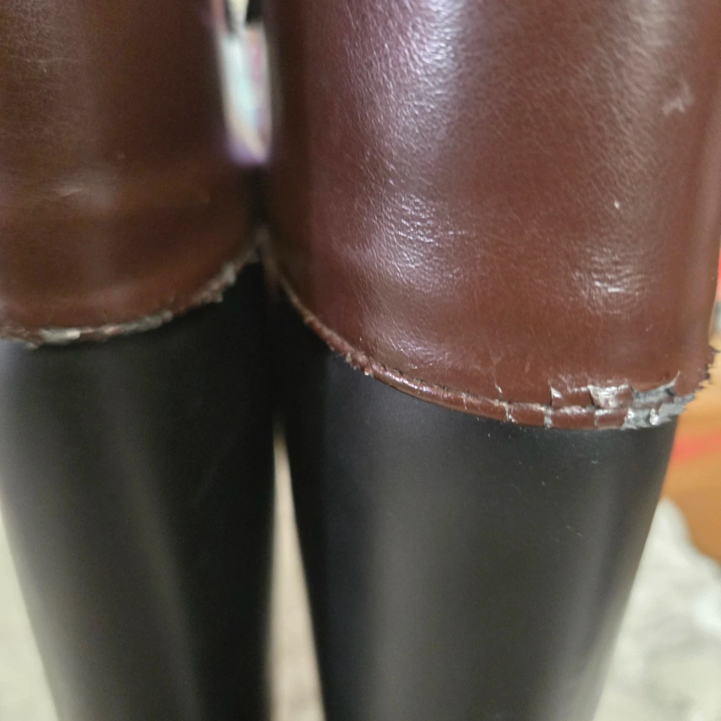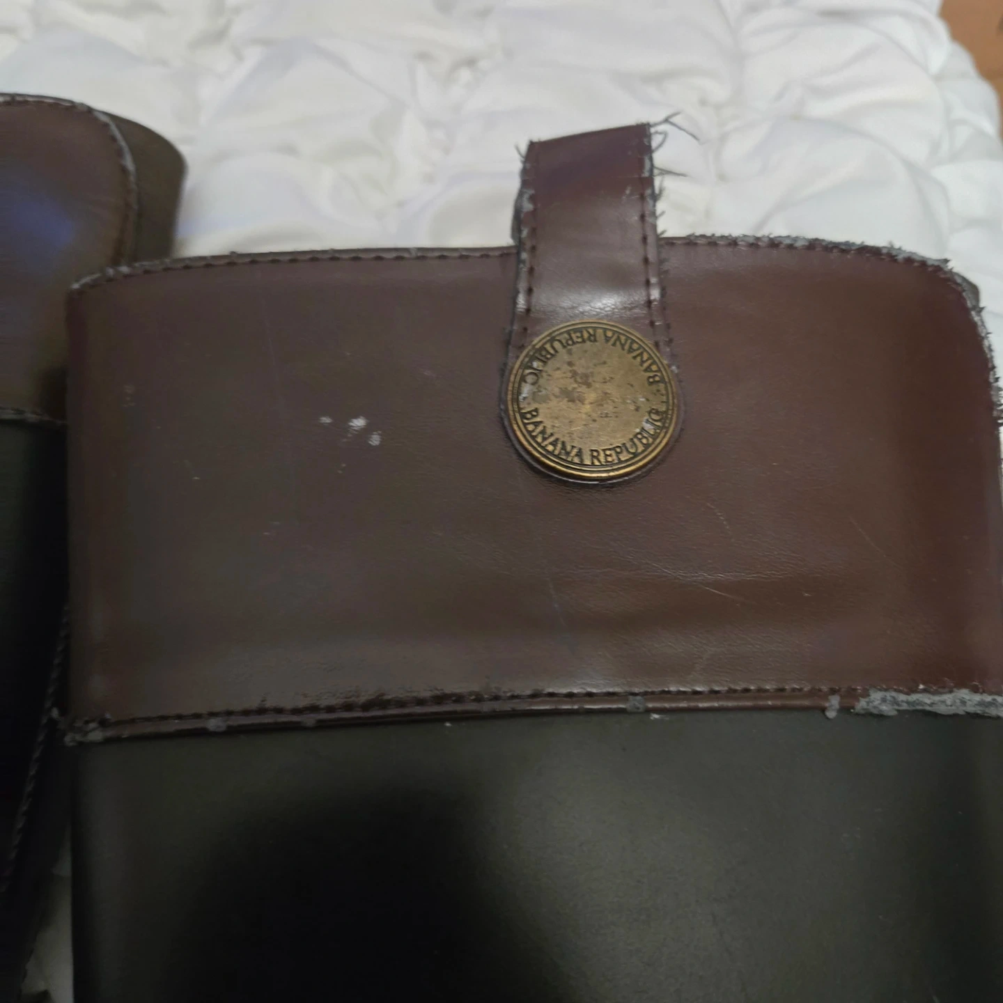 Banana Republic riding boots with a brown and black color scheme. They show some signs of wear, but are still in good condition for everyday use! Inside needs to be fixed scratches on top.