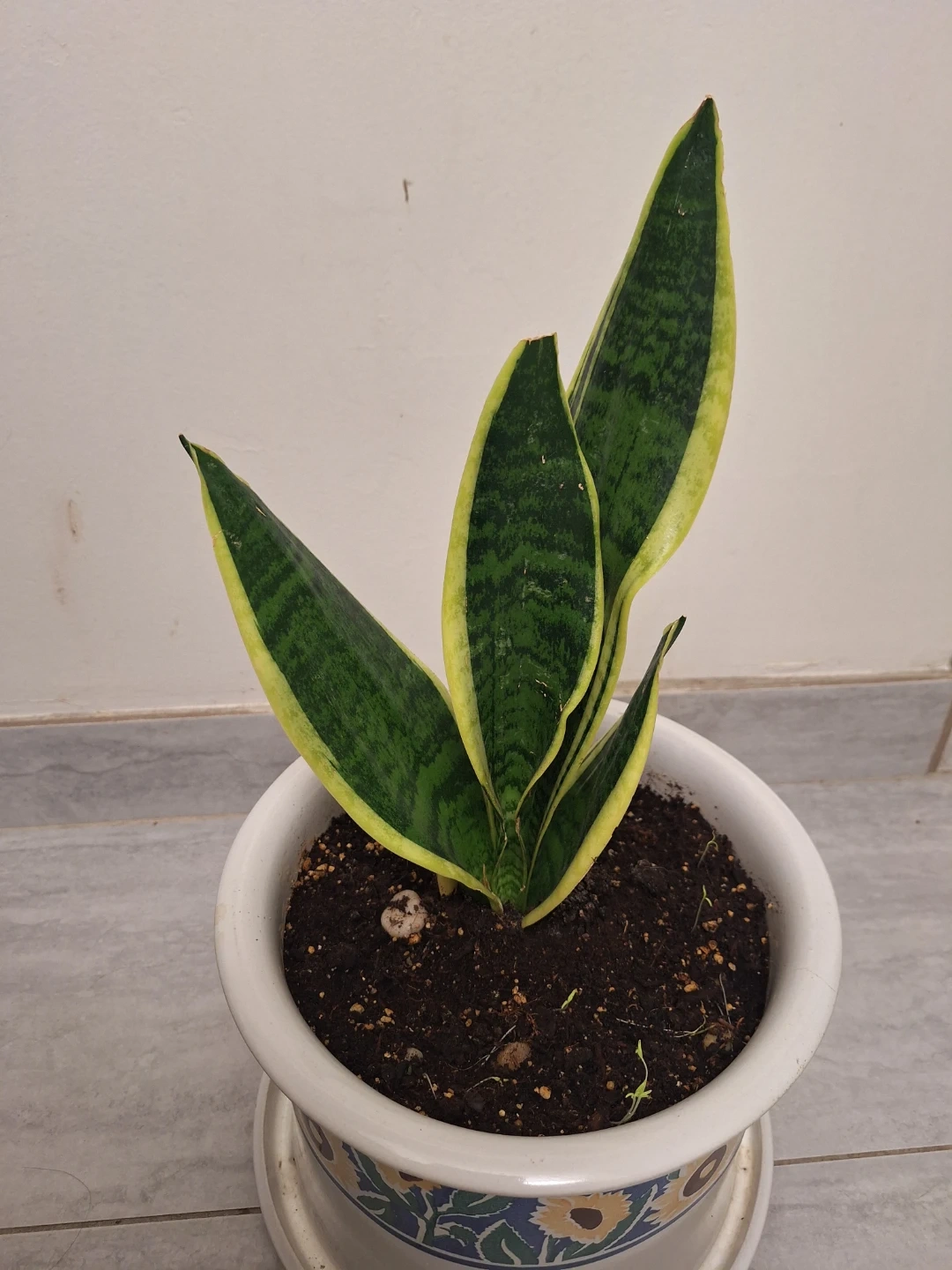 I'm selling a healthy snake plant in a decorative white pot! It's perfect for adding a touch of greenery to your home. The pot has a lovely sunflower design around the rim. It's easy to care for it. Pickup only