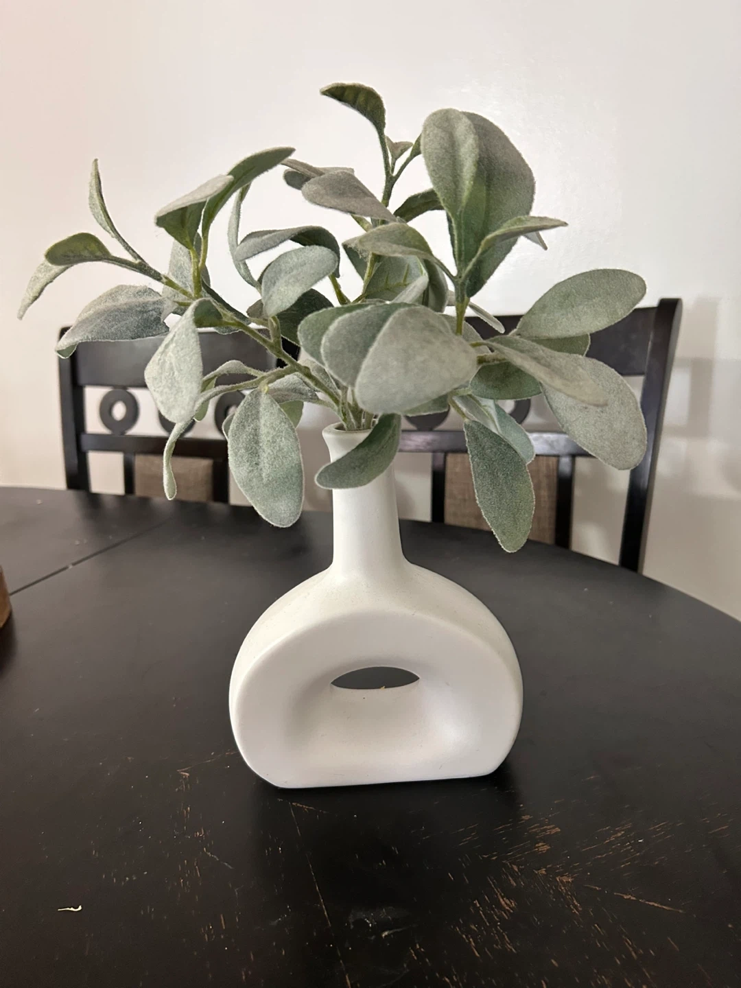 I'm selling a lovely white decorative vase, perfect for adding a touch of elegance to any room. It comes with faux lambs ear, creating a charming and low-maintenance floral arrangement. The vase has a unique design with a hole in the center, making it a standout piece. It's in great condition and ready to enhance your home decor!