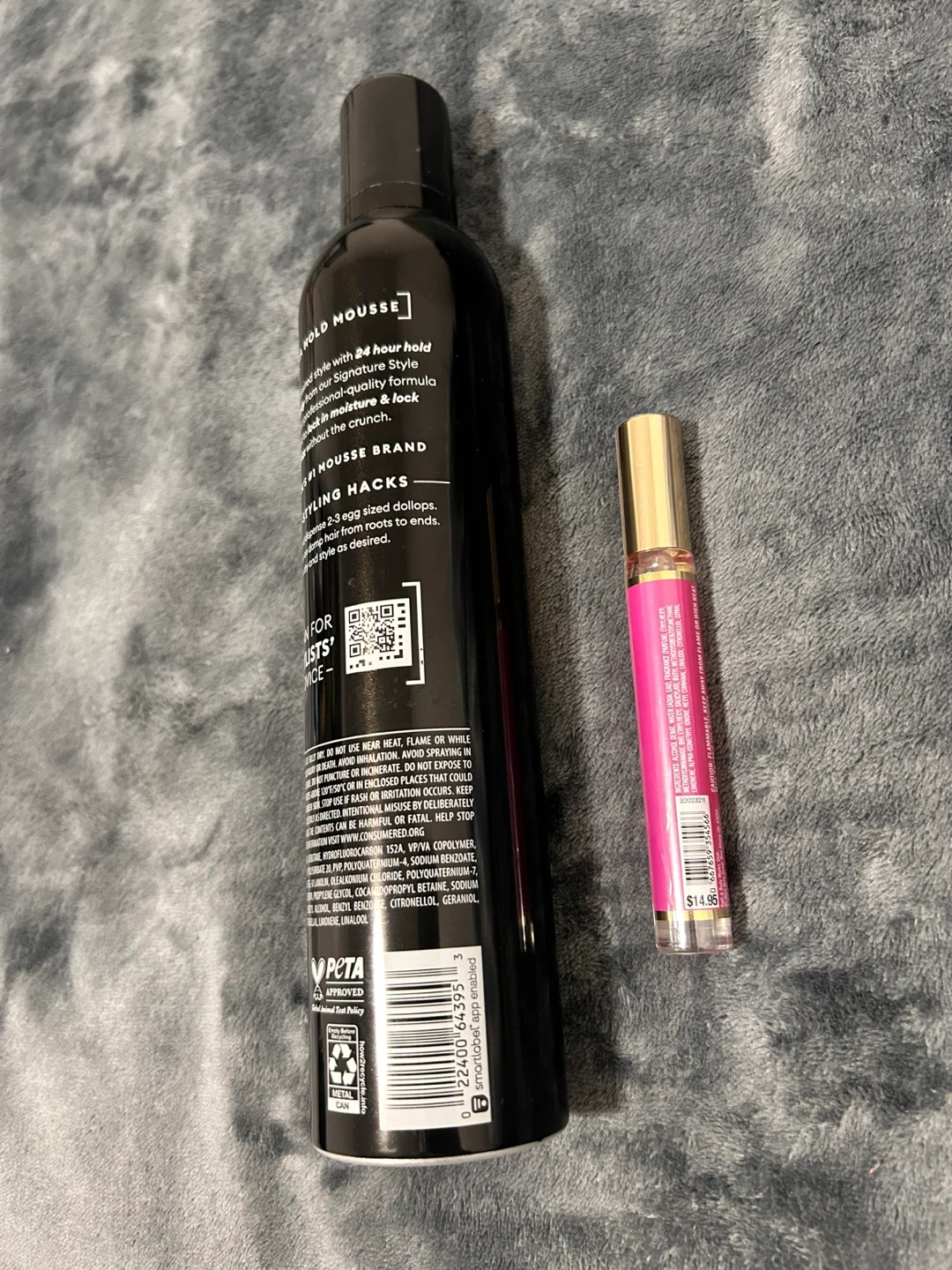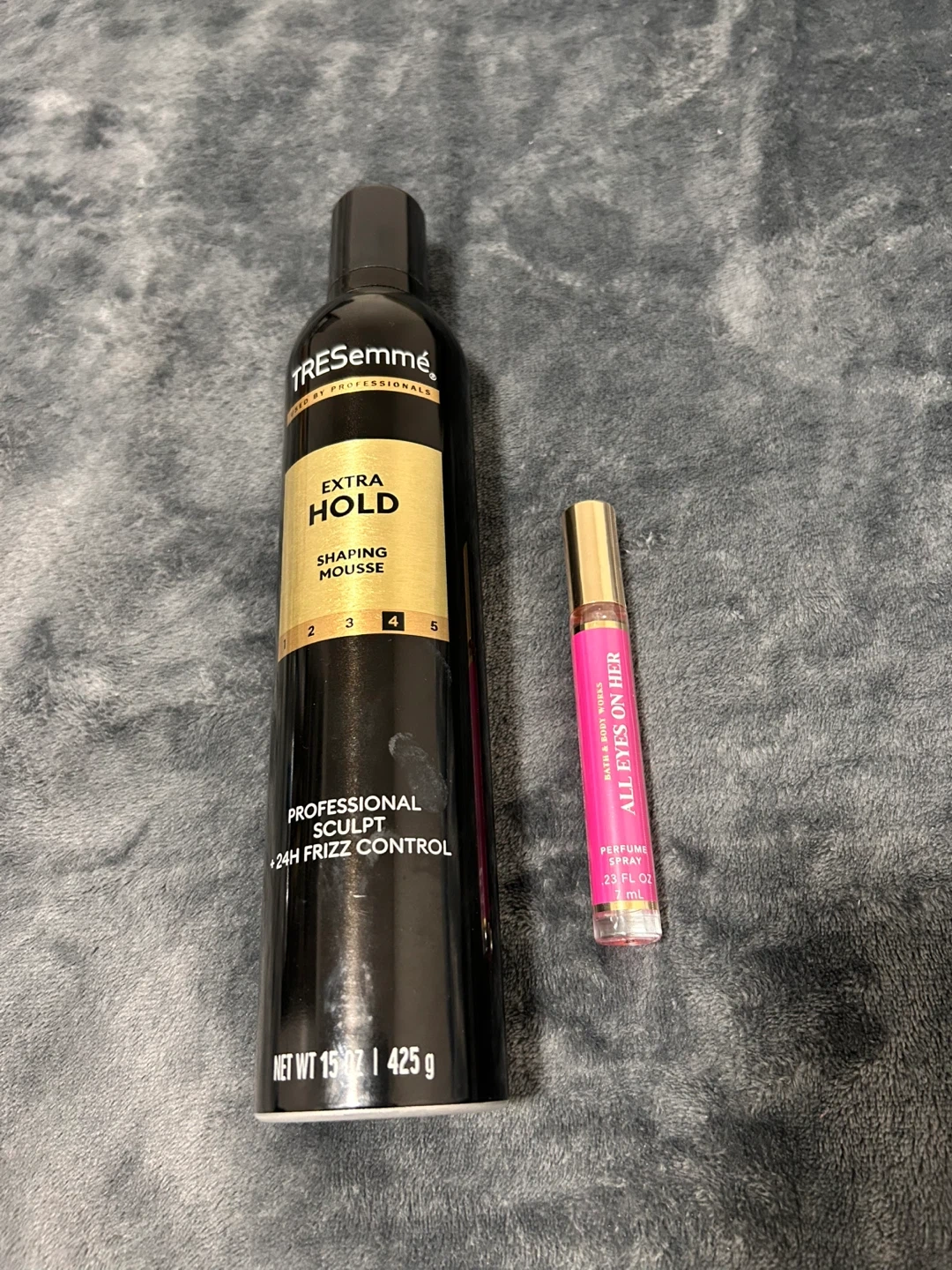 Selling a TRESemmé Extra Hold Shaping Mousse and a perfume spray. The mousse is for professional sculpt and 24h frizz control. Net weight 15 oz / 425 g purse perfume and mousse all new