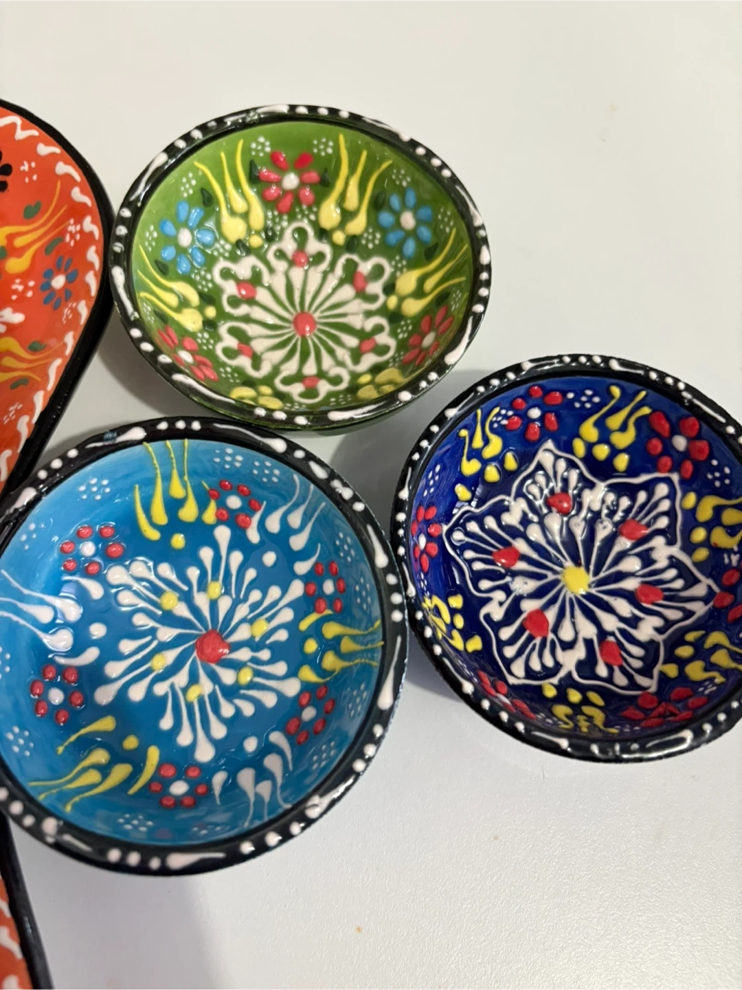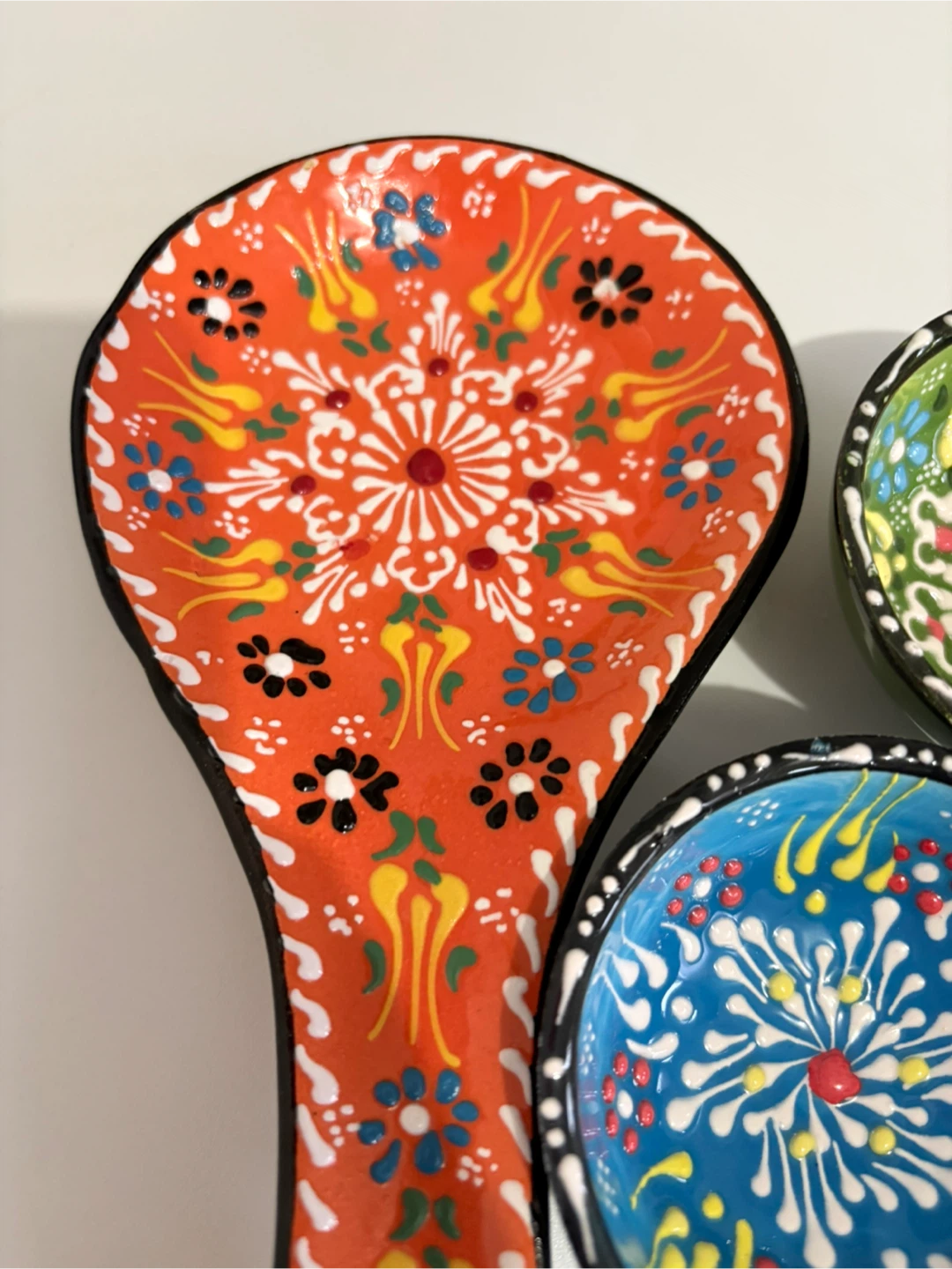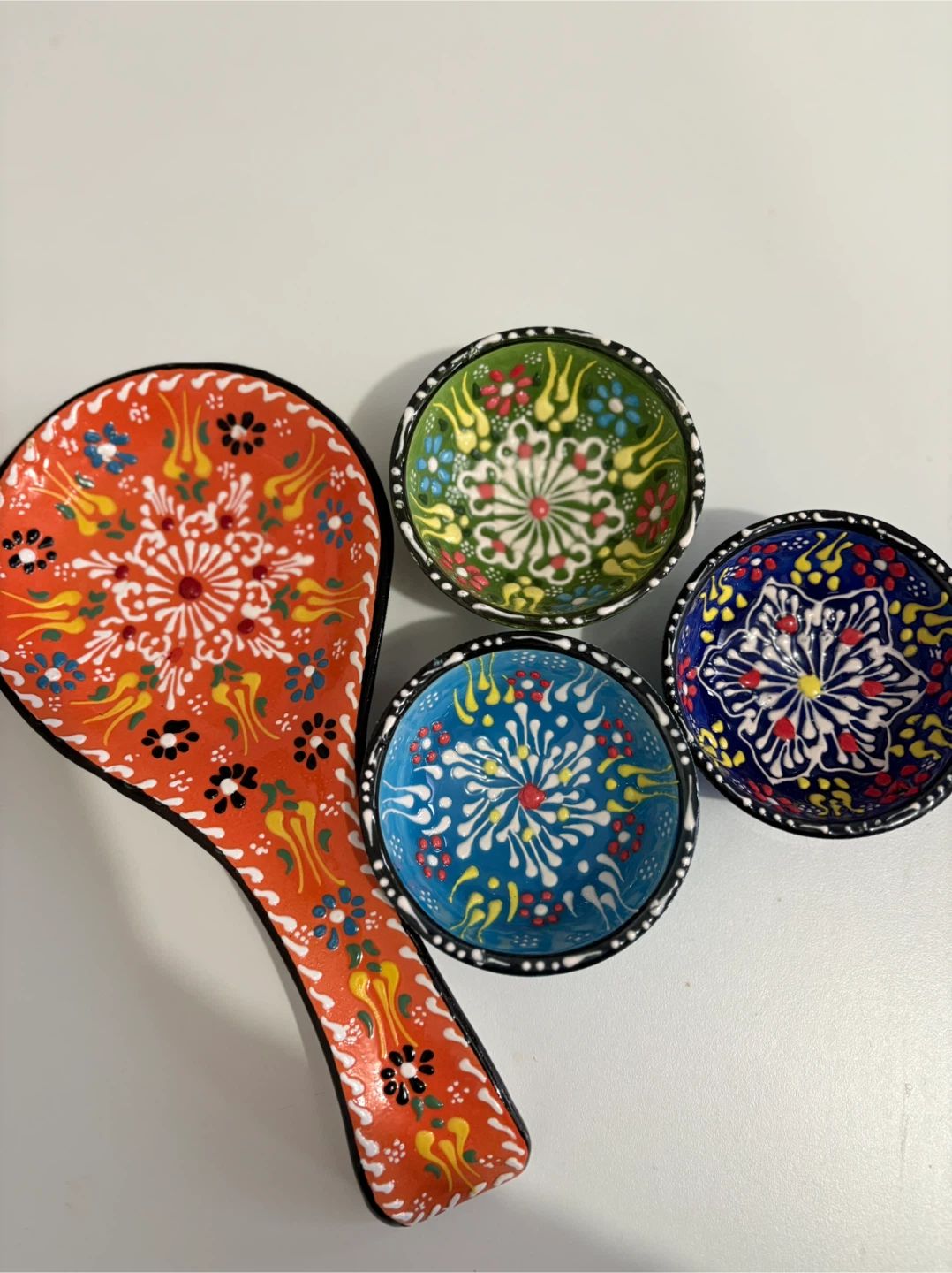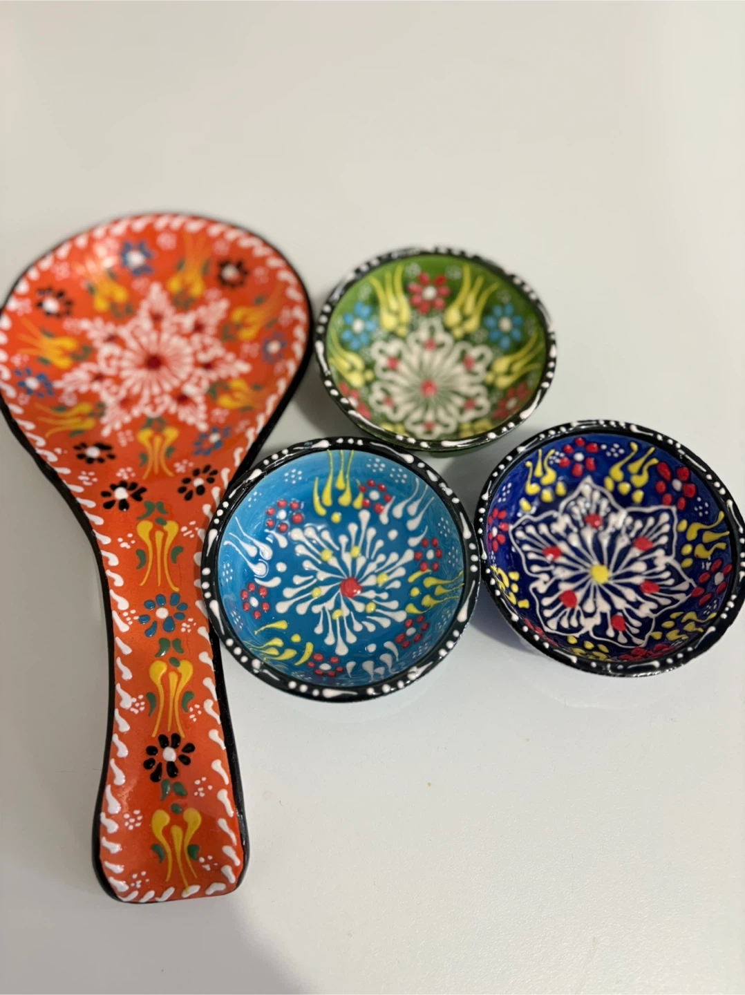 Selling a set of handmade Turkish ceramic saucers and a spoon rest. The saucers come in a variety of colours, including blue, green, and navy. The spoon rest is orange with a floral design. These are perfect for adding a touch of colour to your kitchen or dining room!