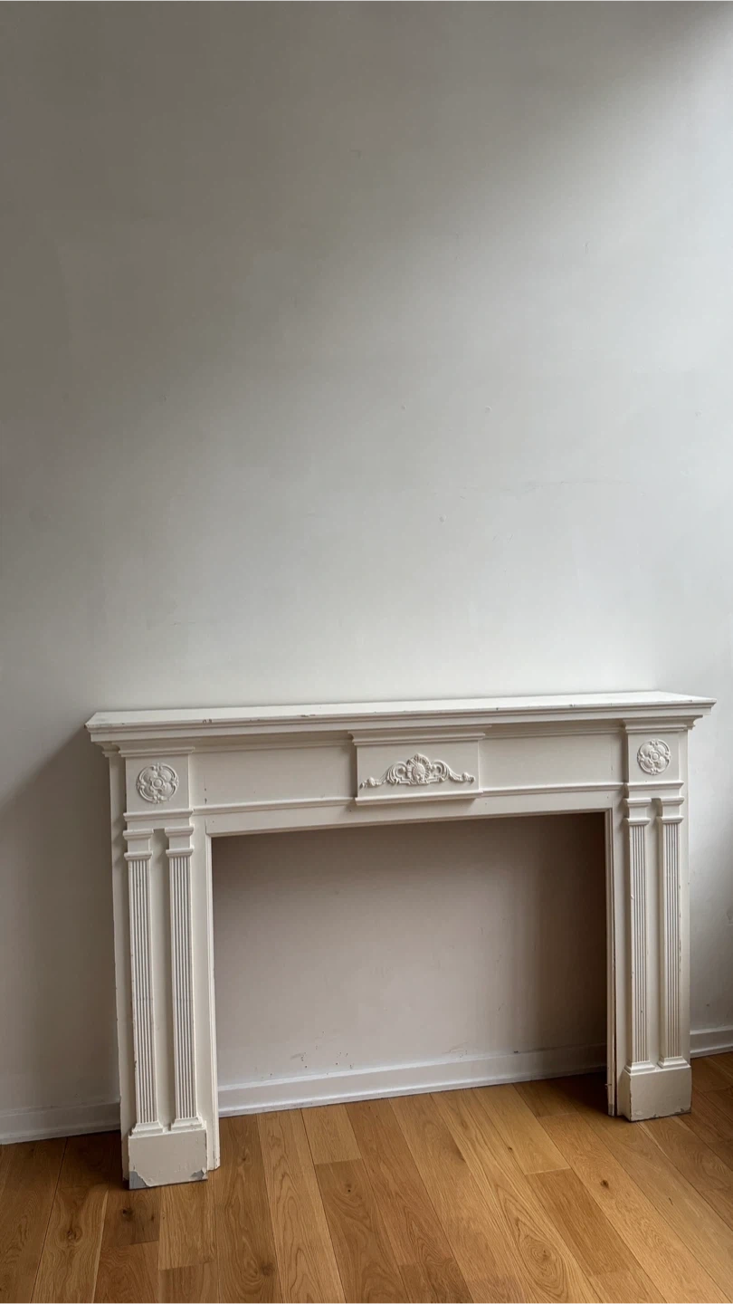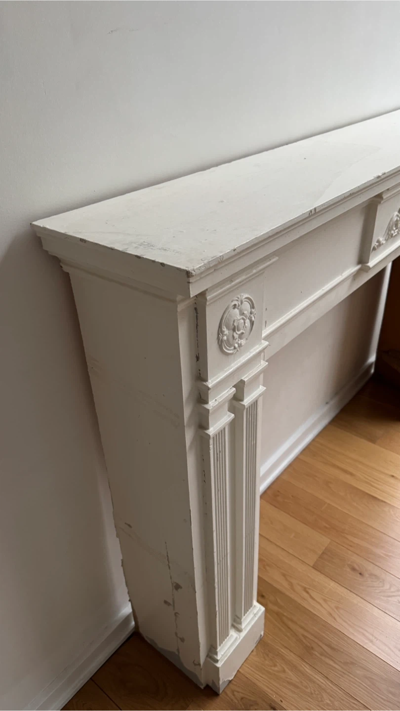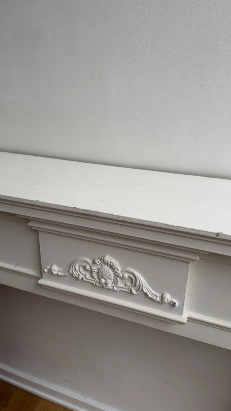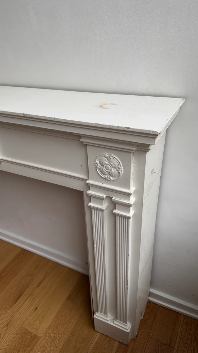 Selling a vintage fireplace mantel in white. It has some signs of wear and tear, as seen in the photos, but the wood is sturdy and good quality. It would be a great addition to any home!