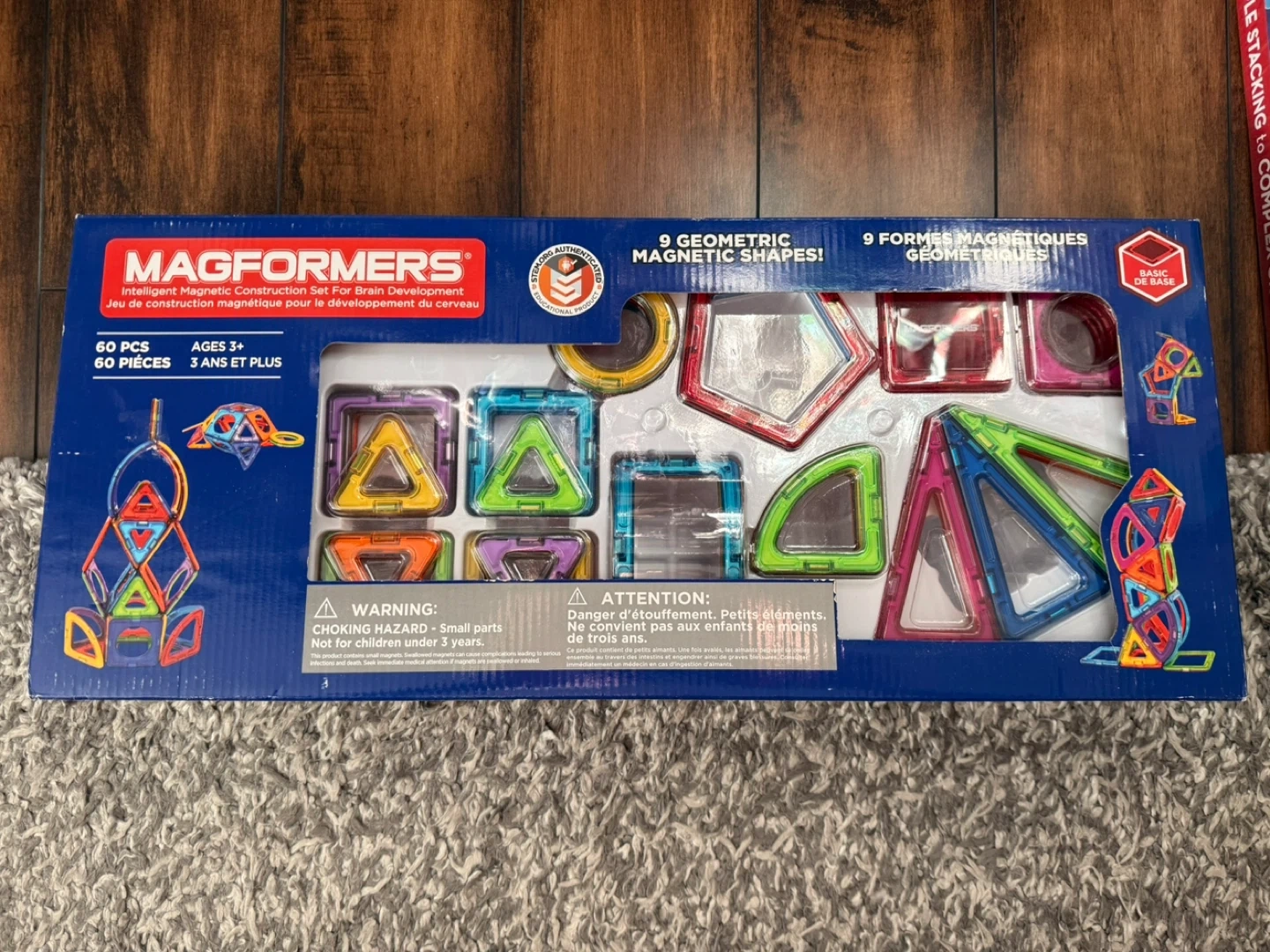 Selling a Magformers Intelligent Magnetic Construction Set for brain development! This set comes with 60 pieces and is suitable for ages 3+. It includes 9 geometric magnetic shapes to build with. Perfect for educational fun!