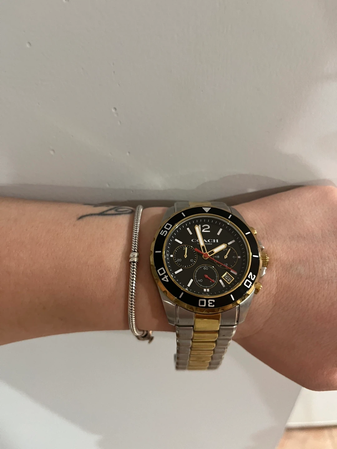 Selling a Coach watch with a gold and silver band. It features a black face with chronograph details. Stylish and in good condition