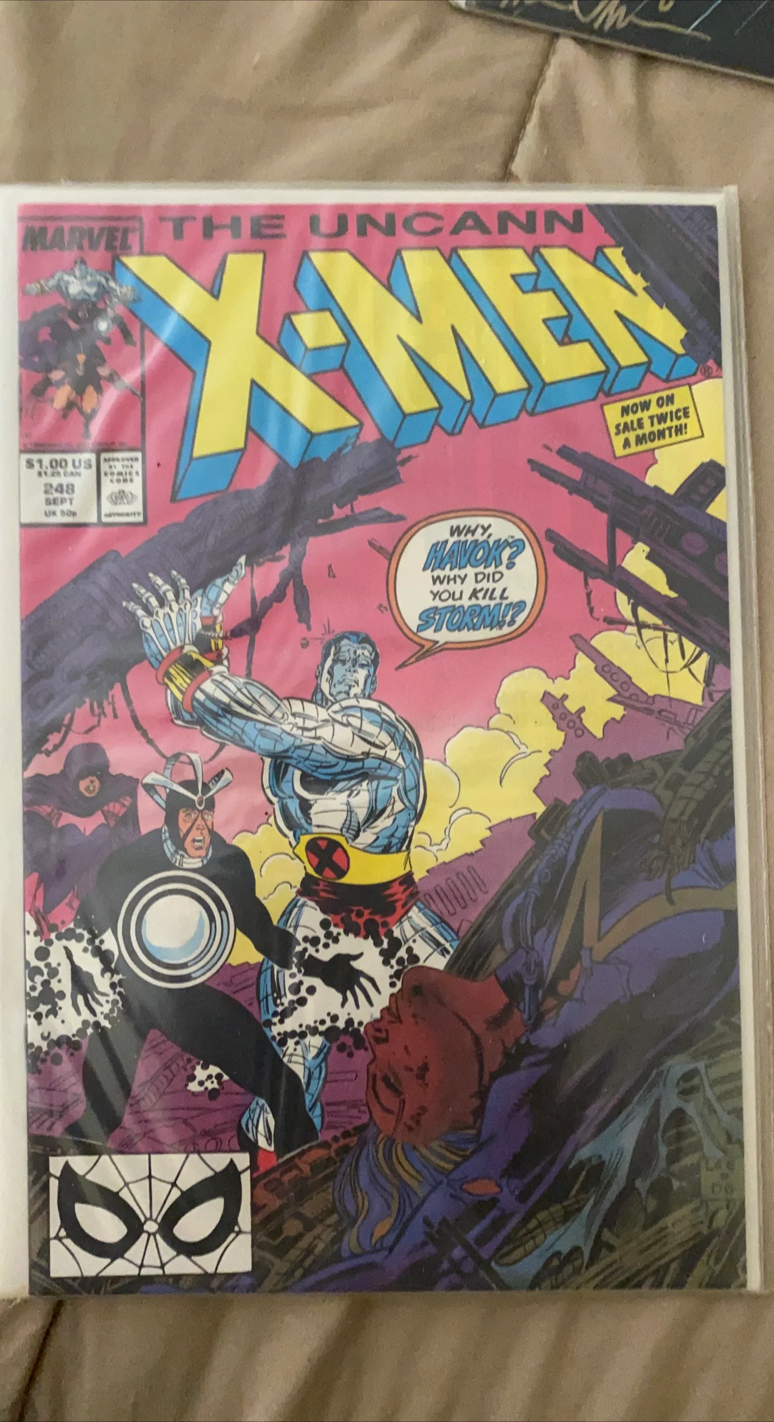 Selling a copy of The Uncanny X-Men comic book, issue #248. This Marvel comic is from September, and the cover price was $1.00 US / $1.25 CAN. It's in great shape for its age!