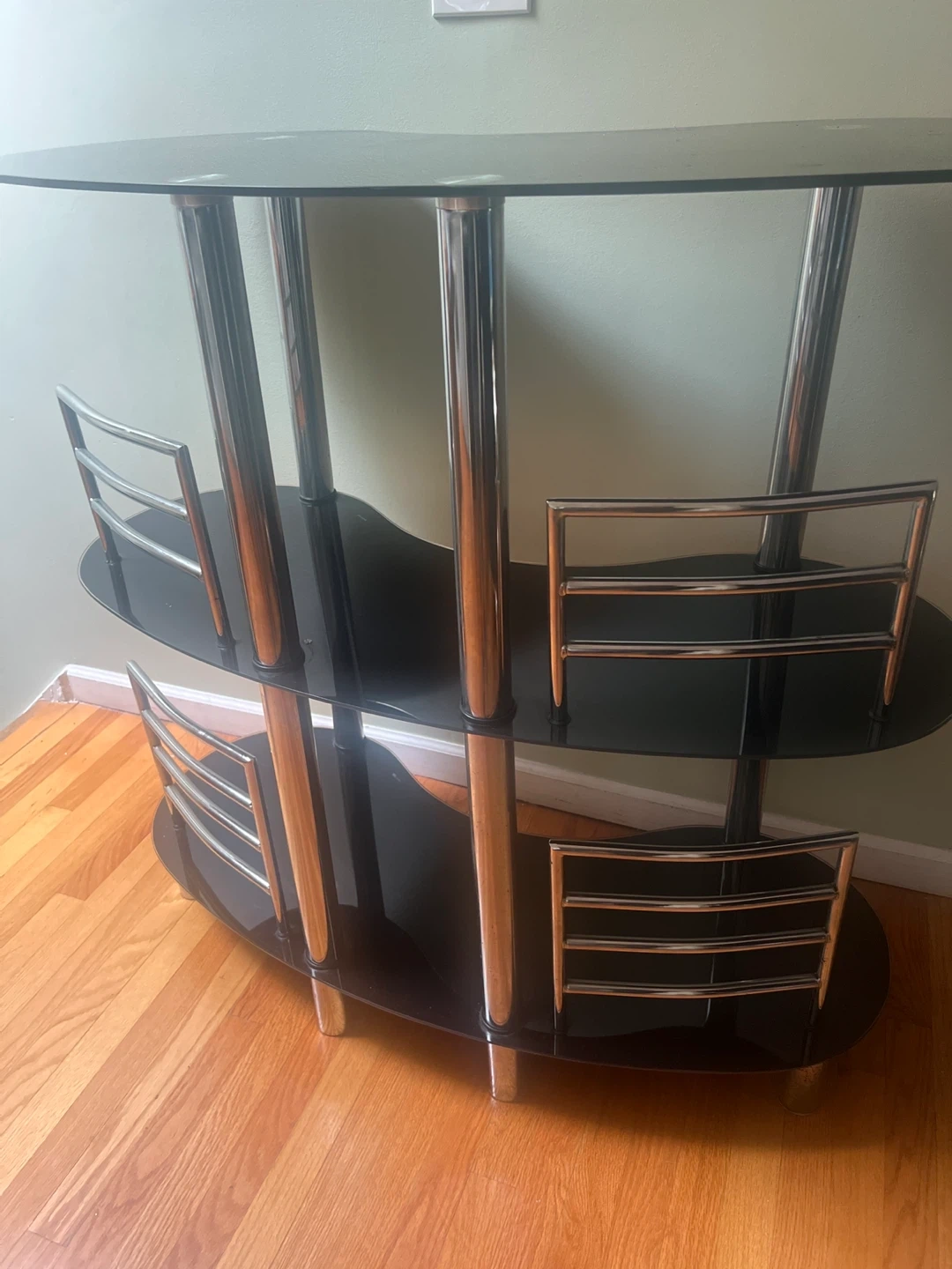 Selling a stylish black glass bar cart! It features a sleek design with multiple tiers for storage and display. The chrome accents add a touch of modern elegance. It's perfect for entertaining or adding a sophisticated touch to your home