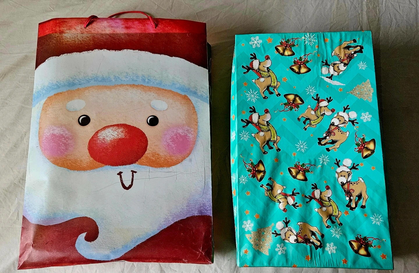 Two festive gift bags from the holiday season! One features a classic Santa Claus design, and the other has a fun pattern with reindeer and bells.