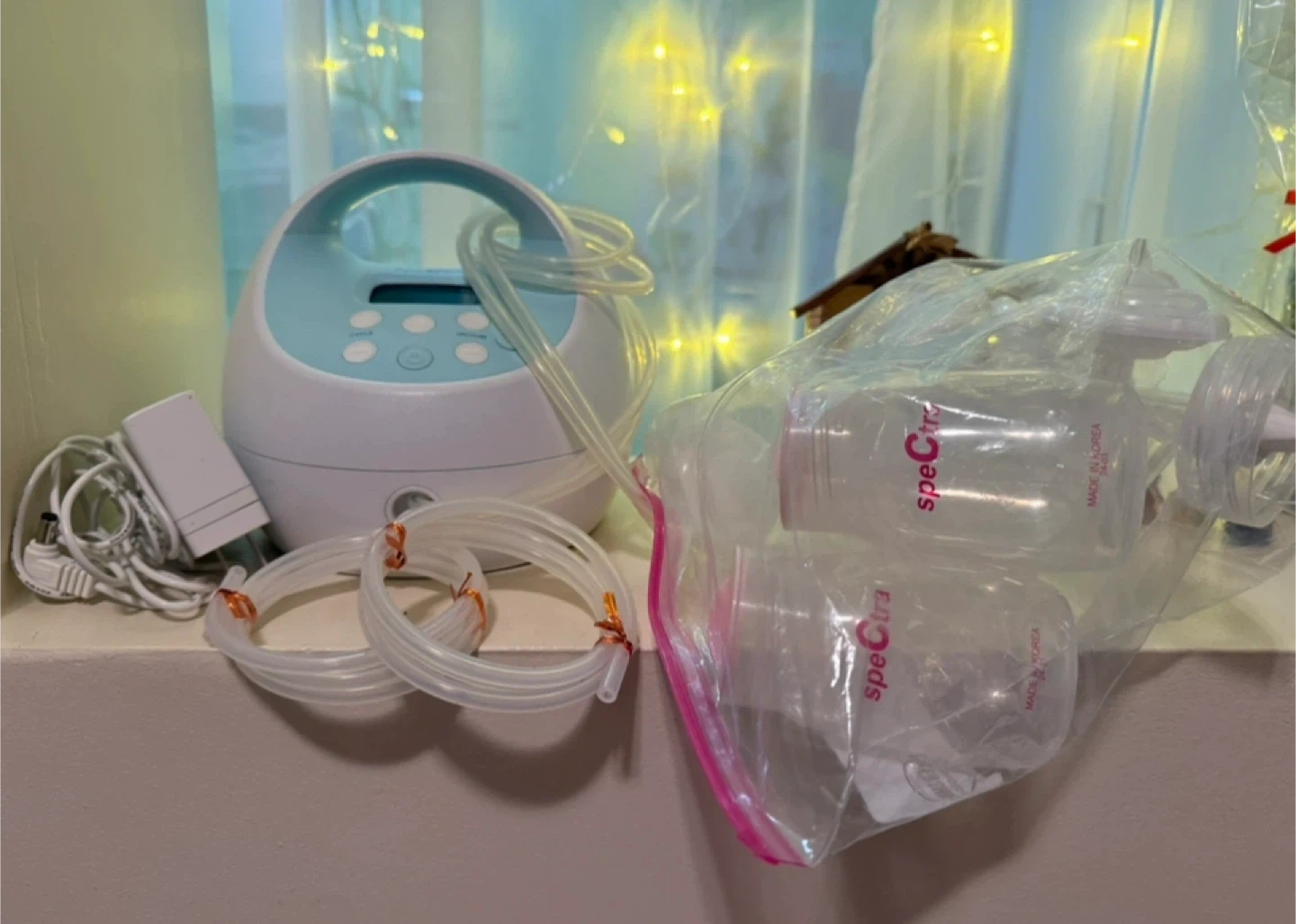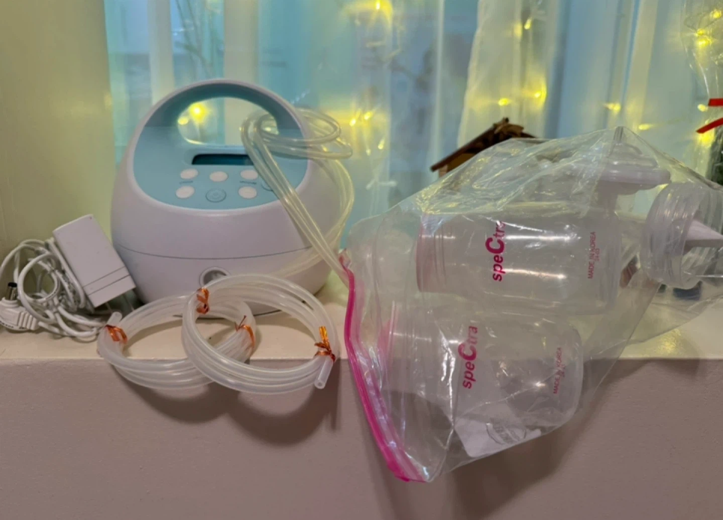 I'm selling a Spectra breast pump. It comes with all the components you see in the picture, including the pump itself, bottles, tubing, and the power adapter. Great for new moms!