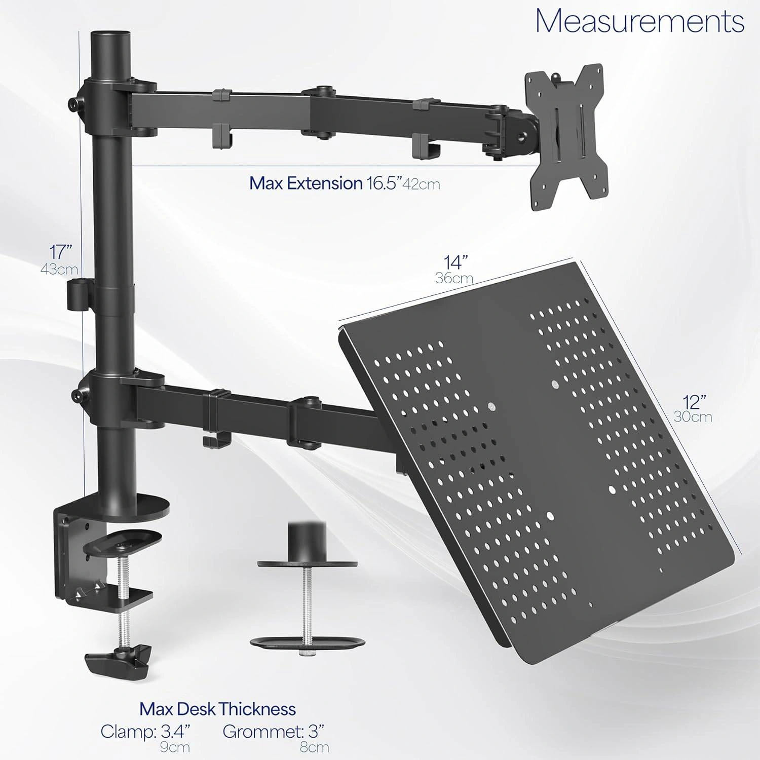 Black Fully Adjustable 13 to 32 inch Single Computer Monitor and Laptop Desk Mount Combo, Stand with Grommet Option, Fits up to 17 inch Laptops STAND-V002C