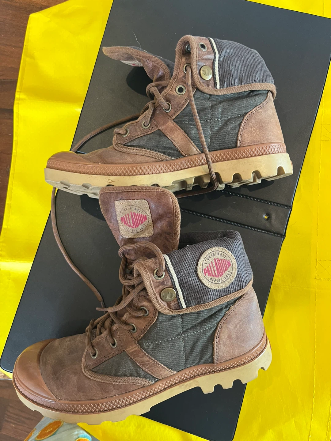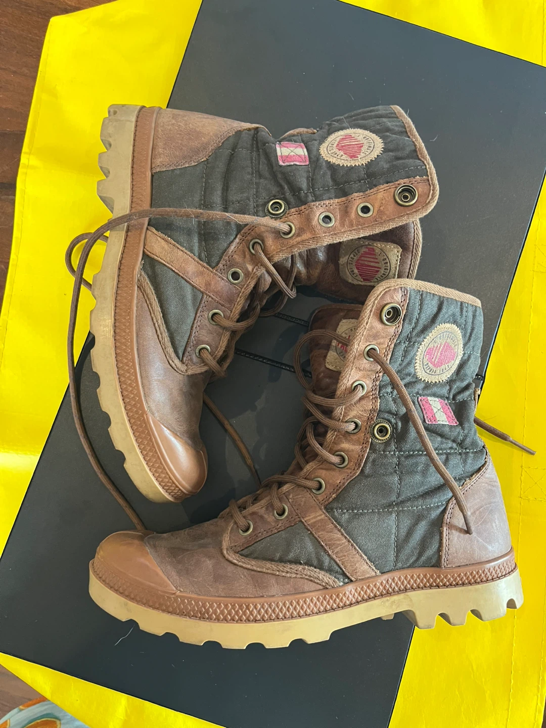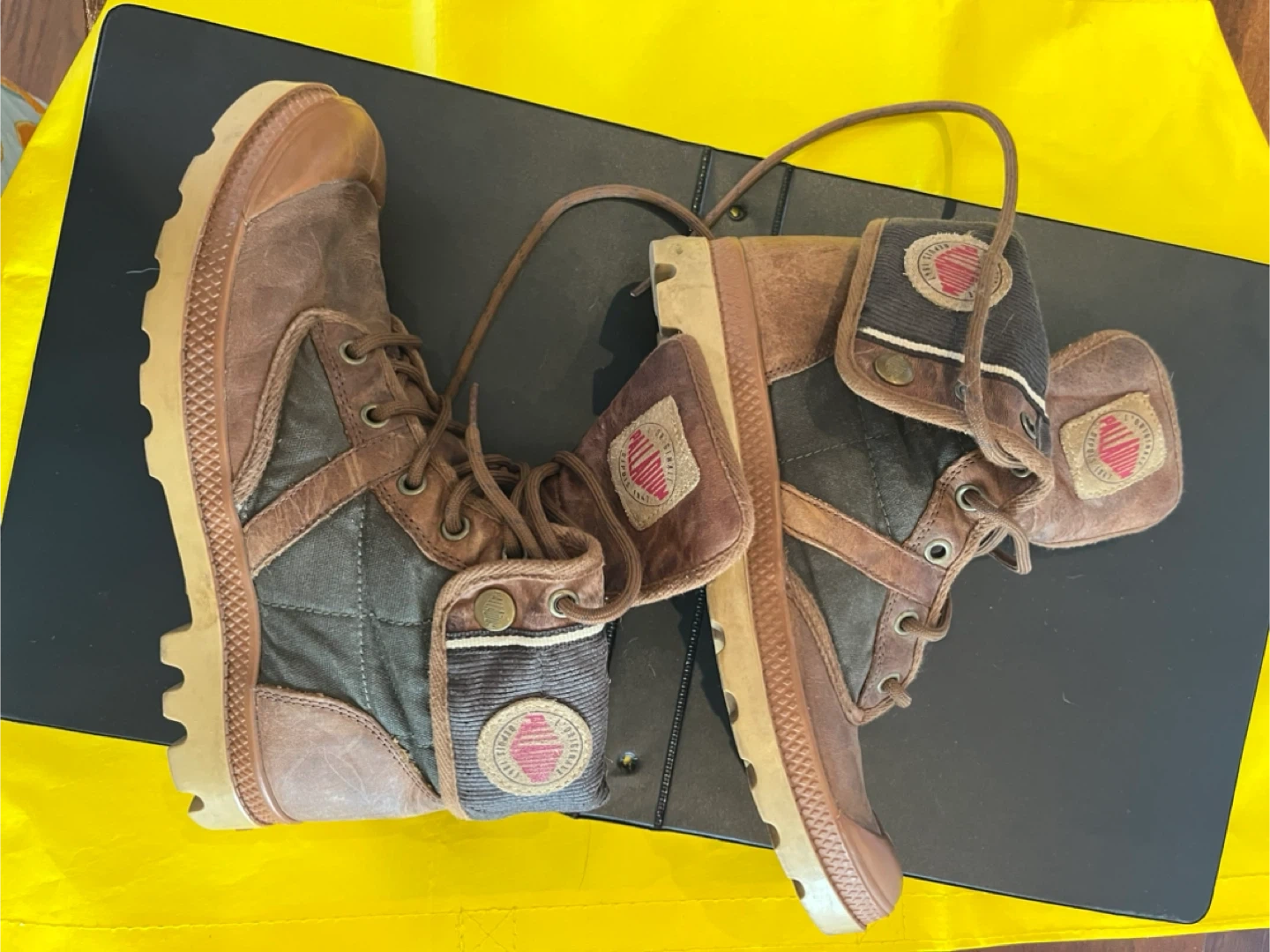 Palladium boots. They are brown and have a unique design! They show signs of wear, but still have lots of life left.