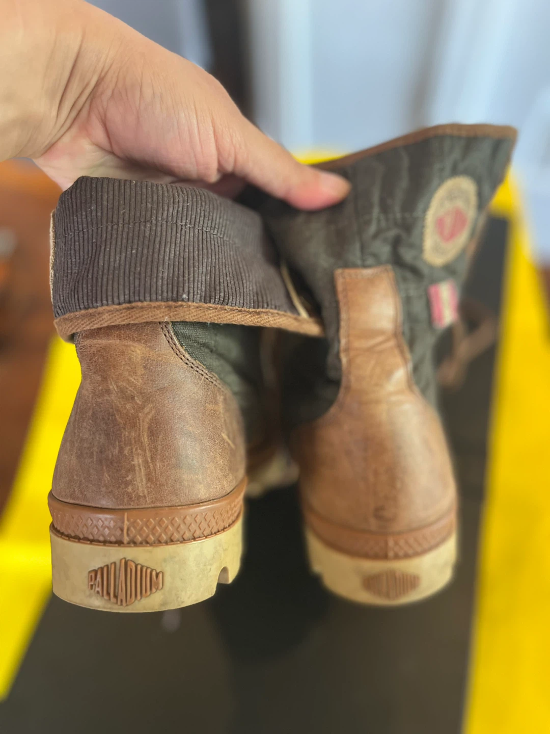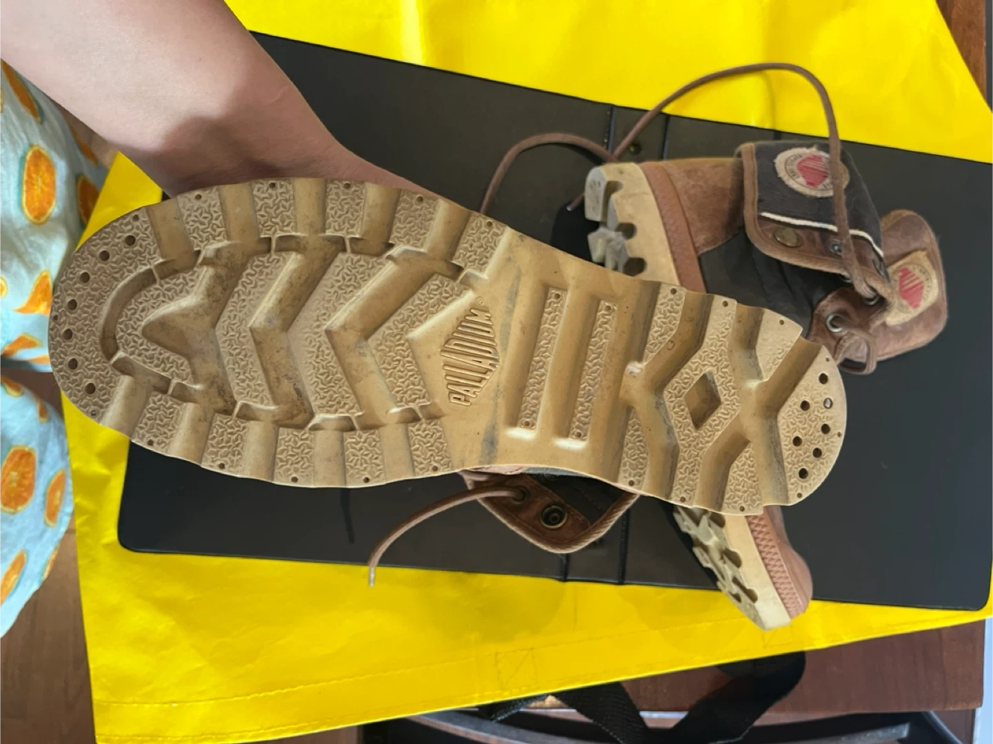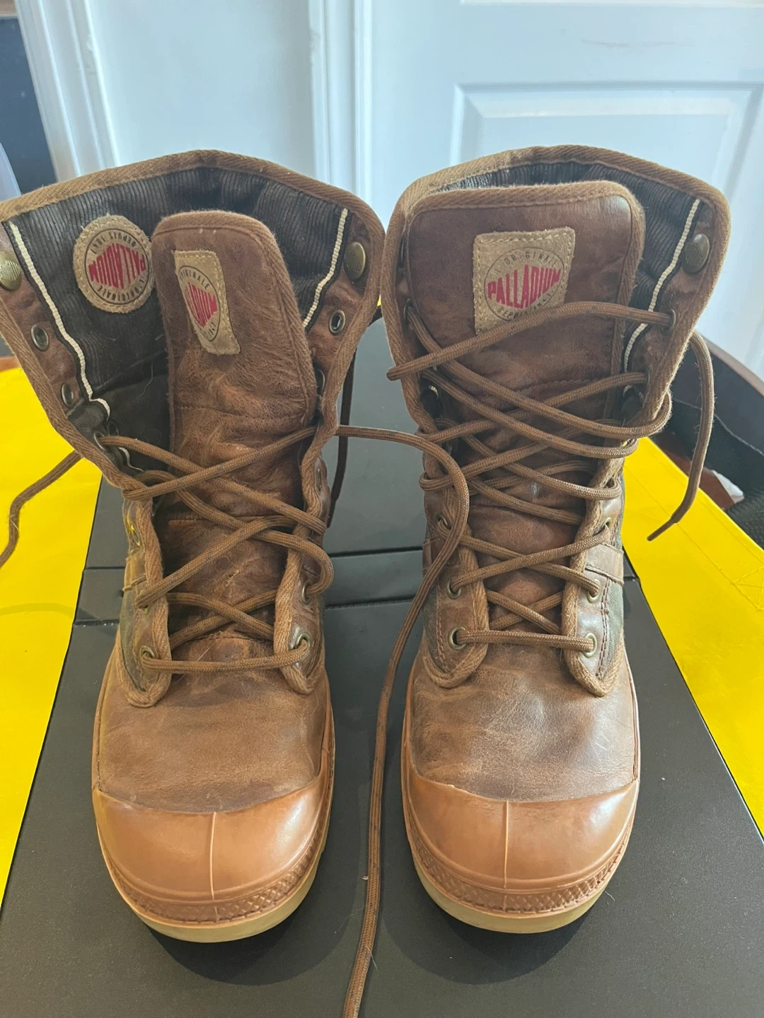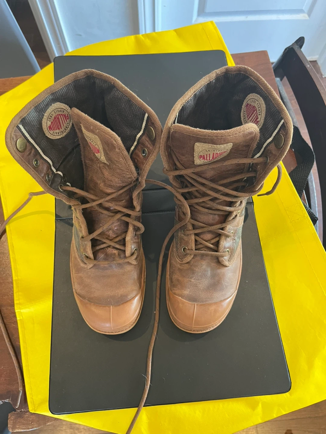 Palladium boots. They are brown and have a unique design! They show signs of wear, but still have lots of life left.