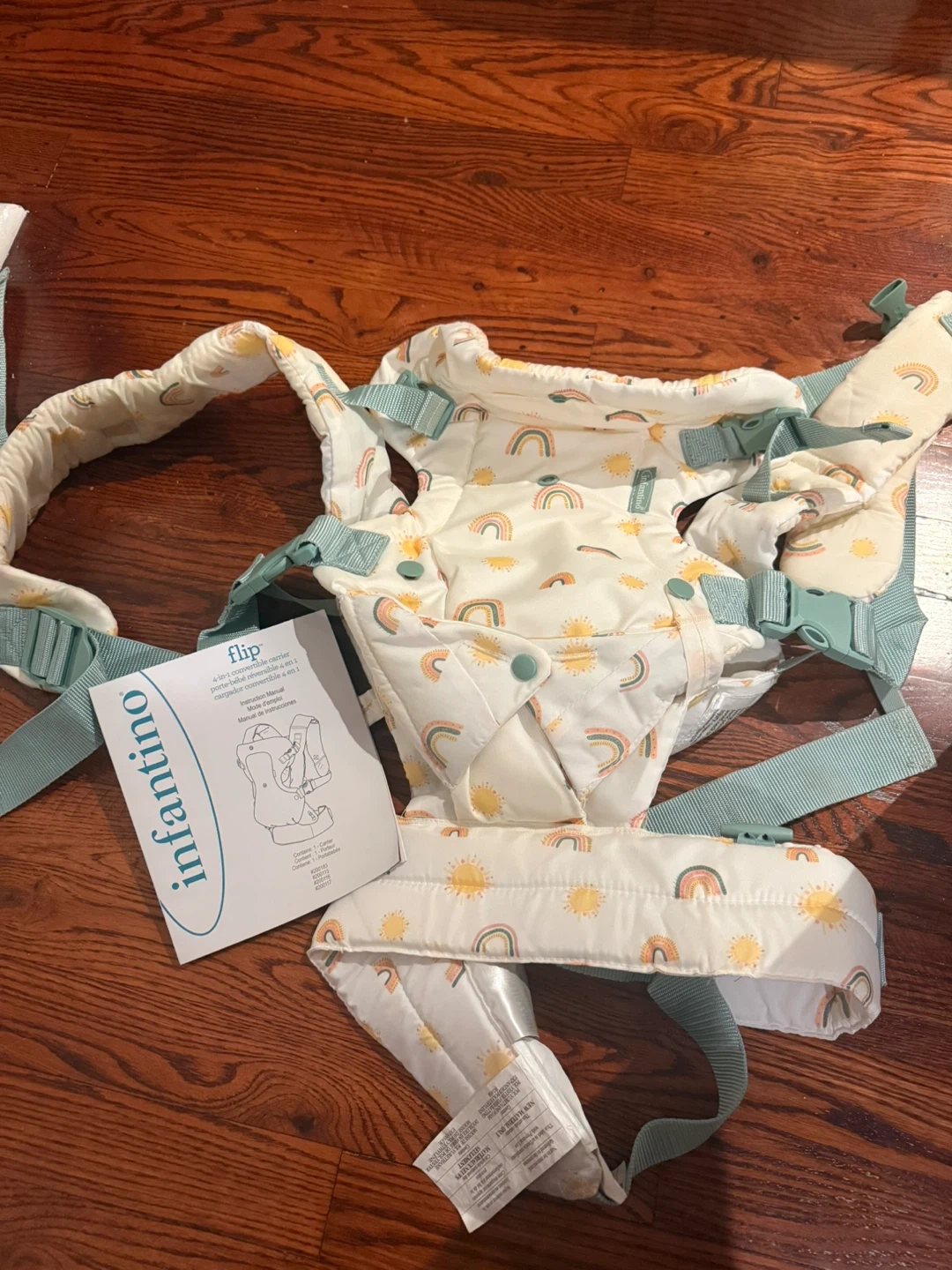 I'm selling an Infantino Flip 4-in-1 convertible carrier! It's in great condition and ready for a new little one. The carrier features a cute rainbow pattern. It also comes with the instruction manual
