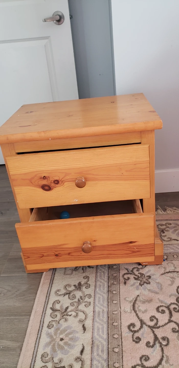 Selling a wooden nightstand with two drawers. It's in good condition and would be a great addition to any bedroom. It has a natural wood finish, perfect for adding a touch of warmth to your space 21 x 17 and 23" tall