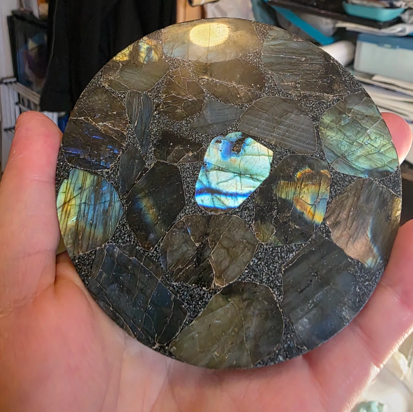 Here is a beautiful labradorite stone plate. It's approximately 4 inches in diameter. The plate features stunning flashes of blue and gold throughout the stone. Perfect for adding a touch of natural beauty to your space! From my own personal collection. Pickup is in my building 5 min from High park station.