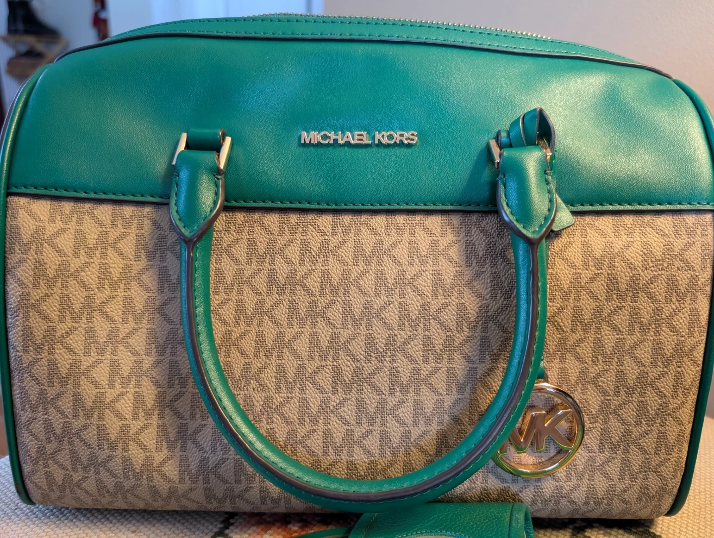 Selling a beautiful Michael Kors satchel and matching sandals! The satchel features the classic MK logo pattern with striking green accents. The sandals are a size 9M and have the MK logo on the straps. They're the perfect set for a stylish summer look!