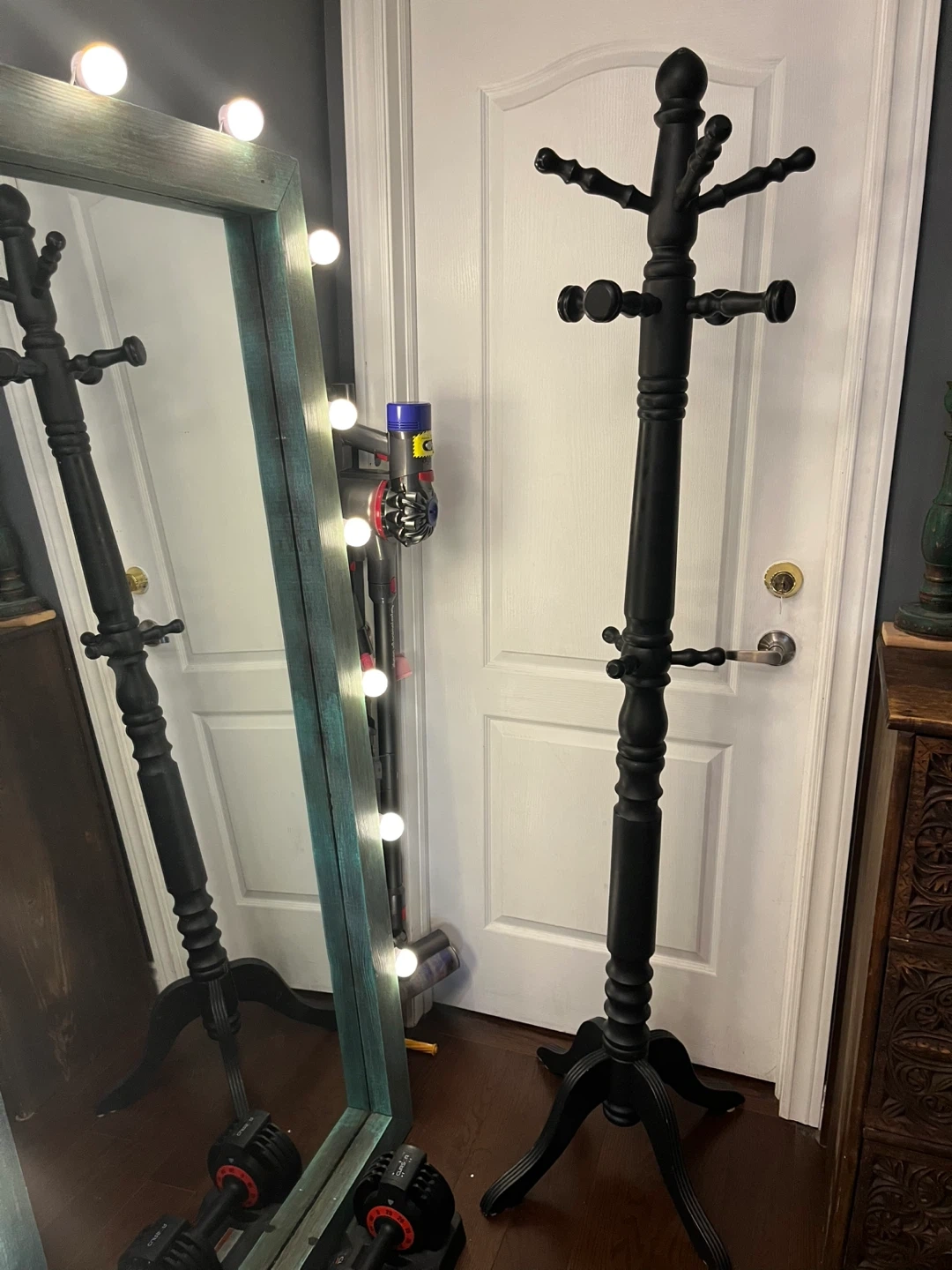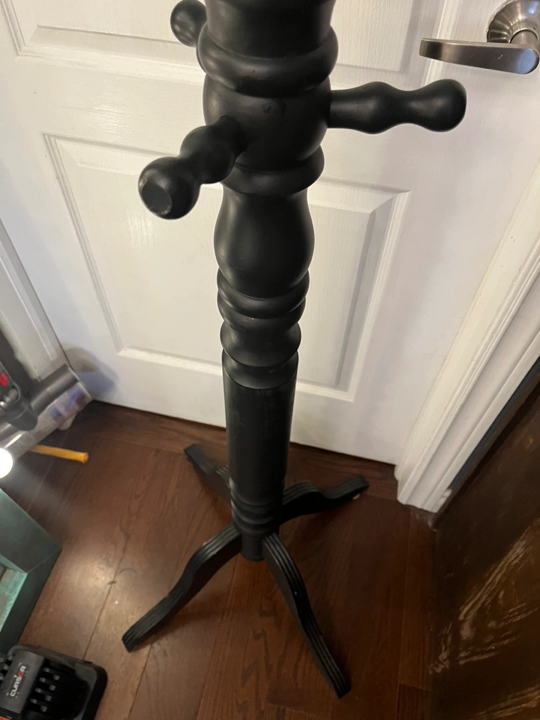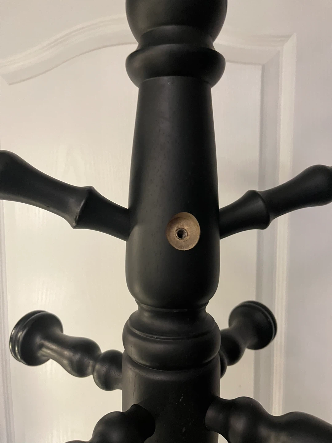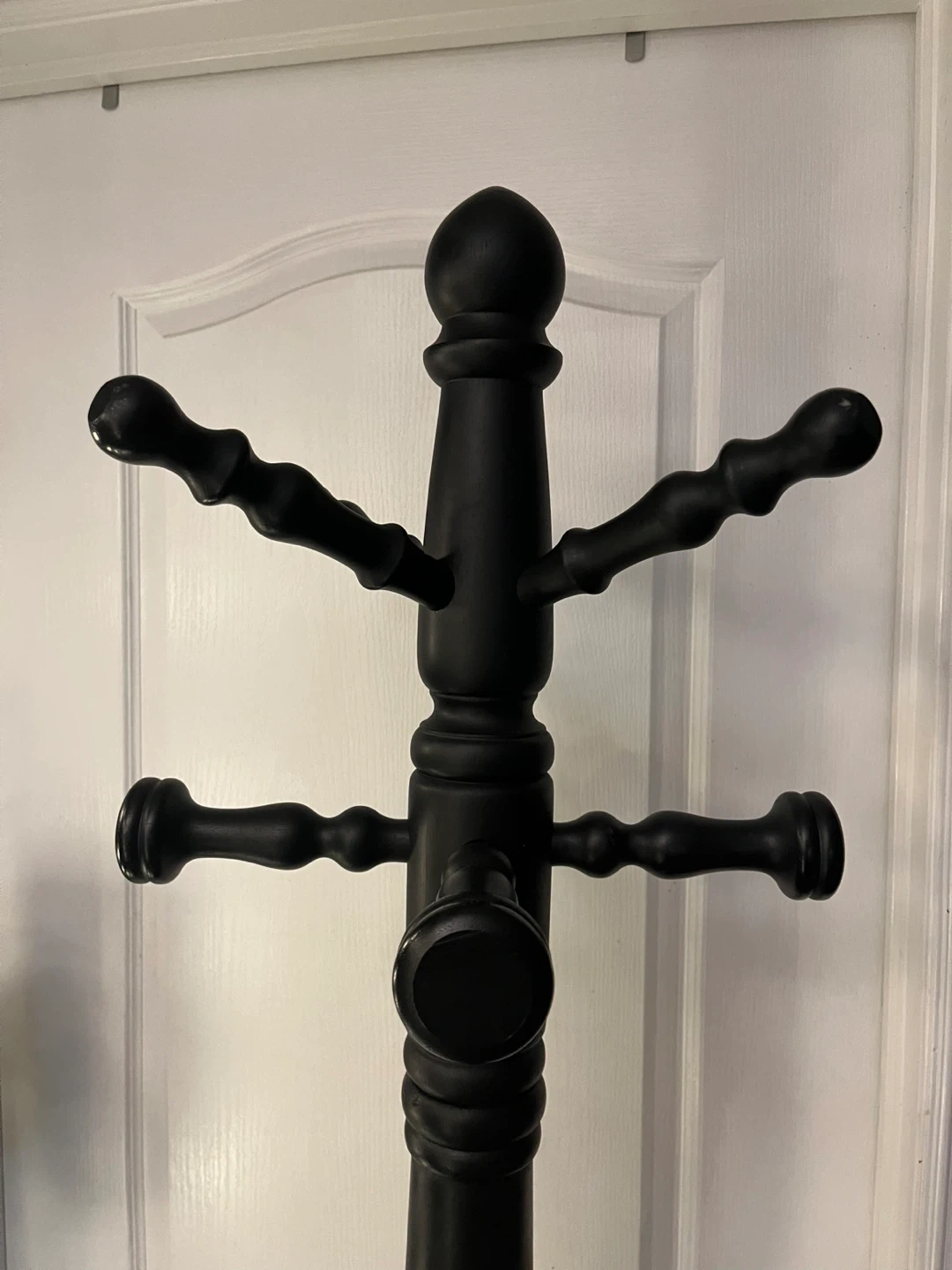 This is a black wooden coat rack stand! It's perfect for hanging coats, hats, and other accessories. It has a classic design and would look great in any entryway or bedroom. It has a rotating top , makes things easy to access. Has one nob missing as in the photos.