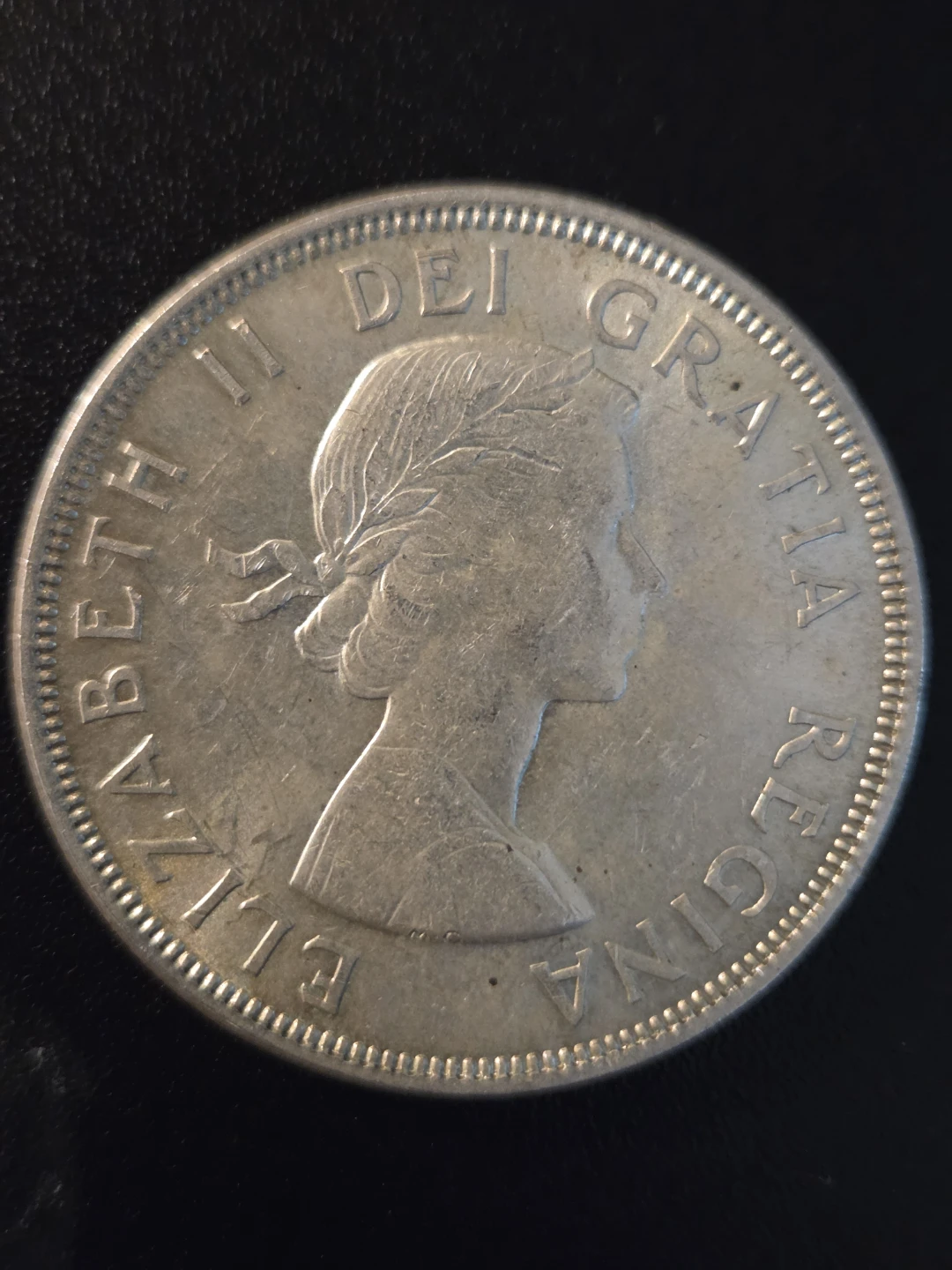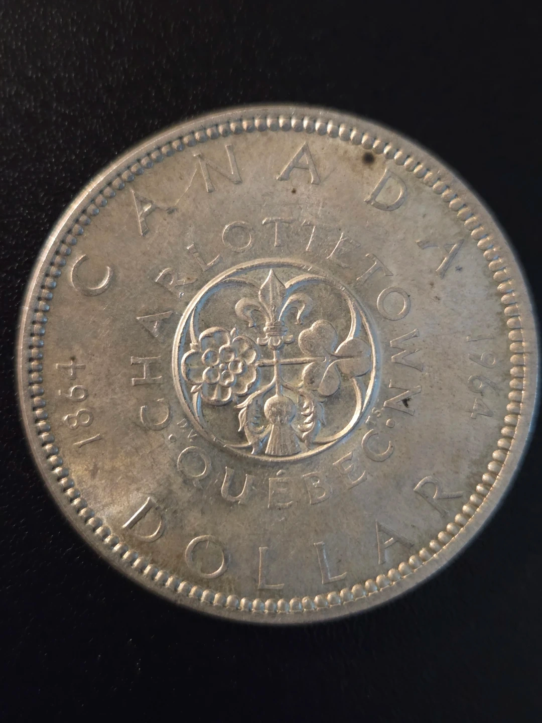 The reverse of the 1964 silver dollar carried a special design marking the centennial of the 1864 meetings in Charlottetown, P.E.I. and Quebec City, Quebec, which prepared the way for Confederation in 1867. The design depicts, conjoined within a circle, the French fleur-de-lis, the Irish shamrock, the Scottish thistle, and the English rose.