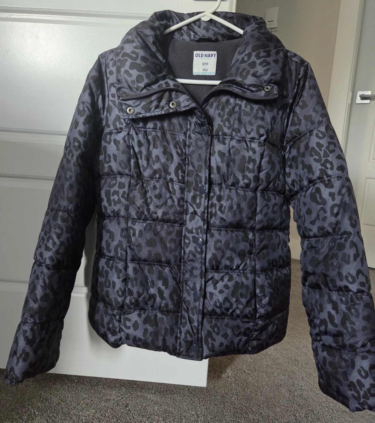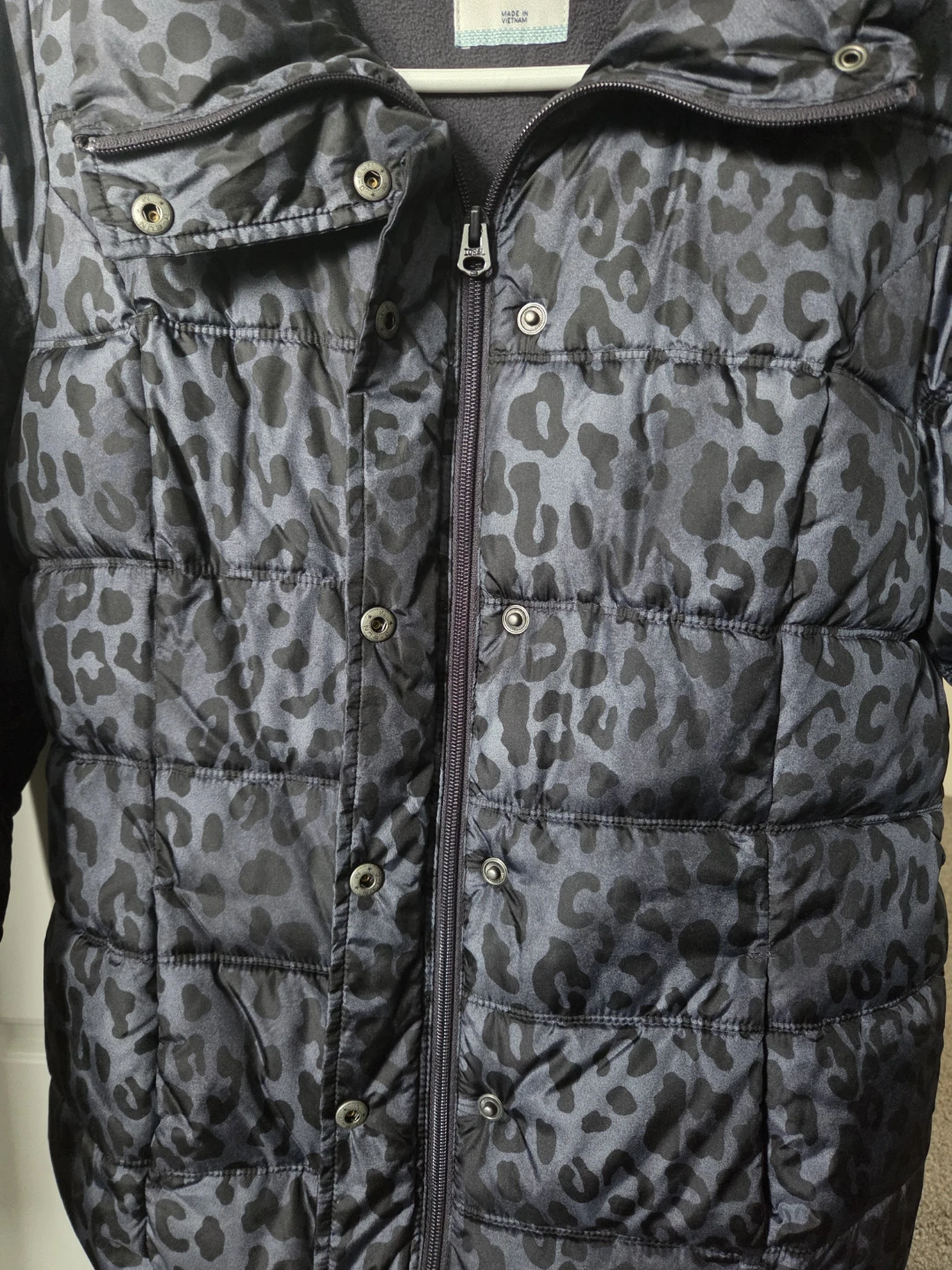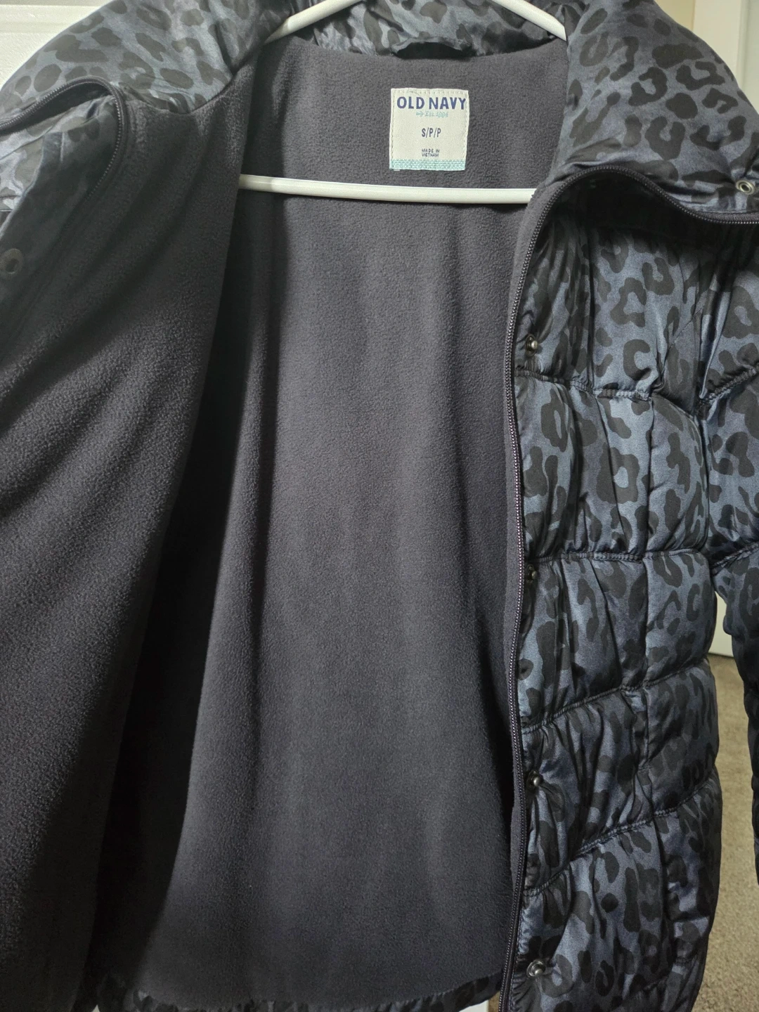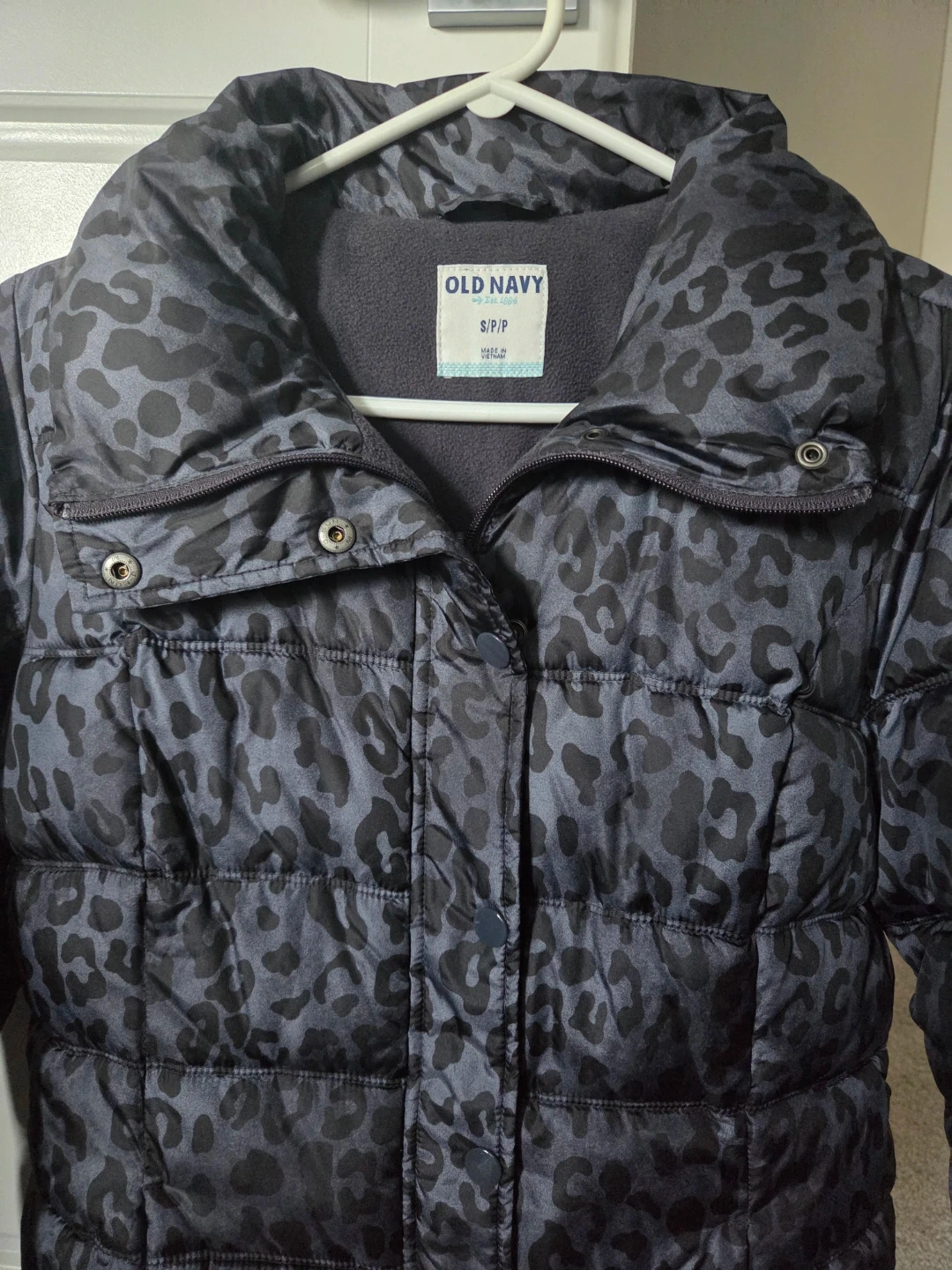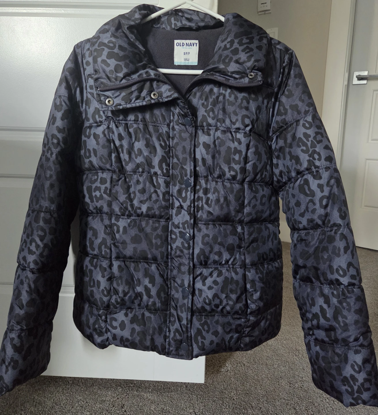 Hardly worn cozy & stylish old navy puffer jacket in gray & black leopard print. Zip closure, side pockets and warm quilted design.