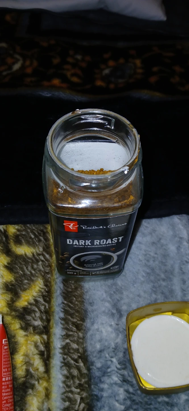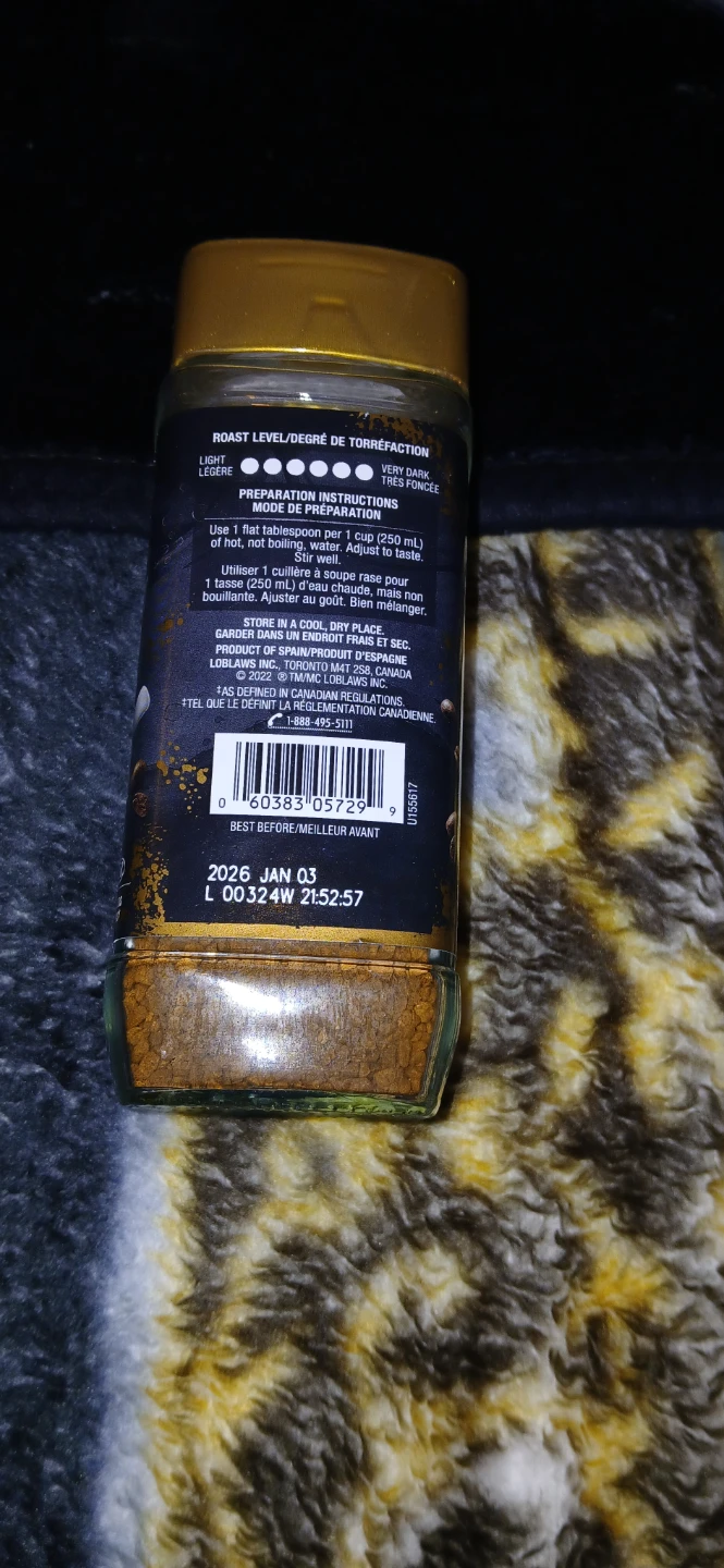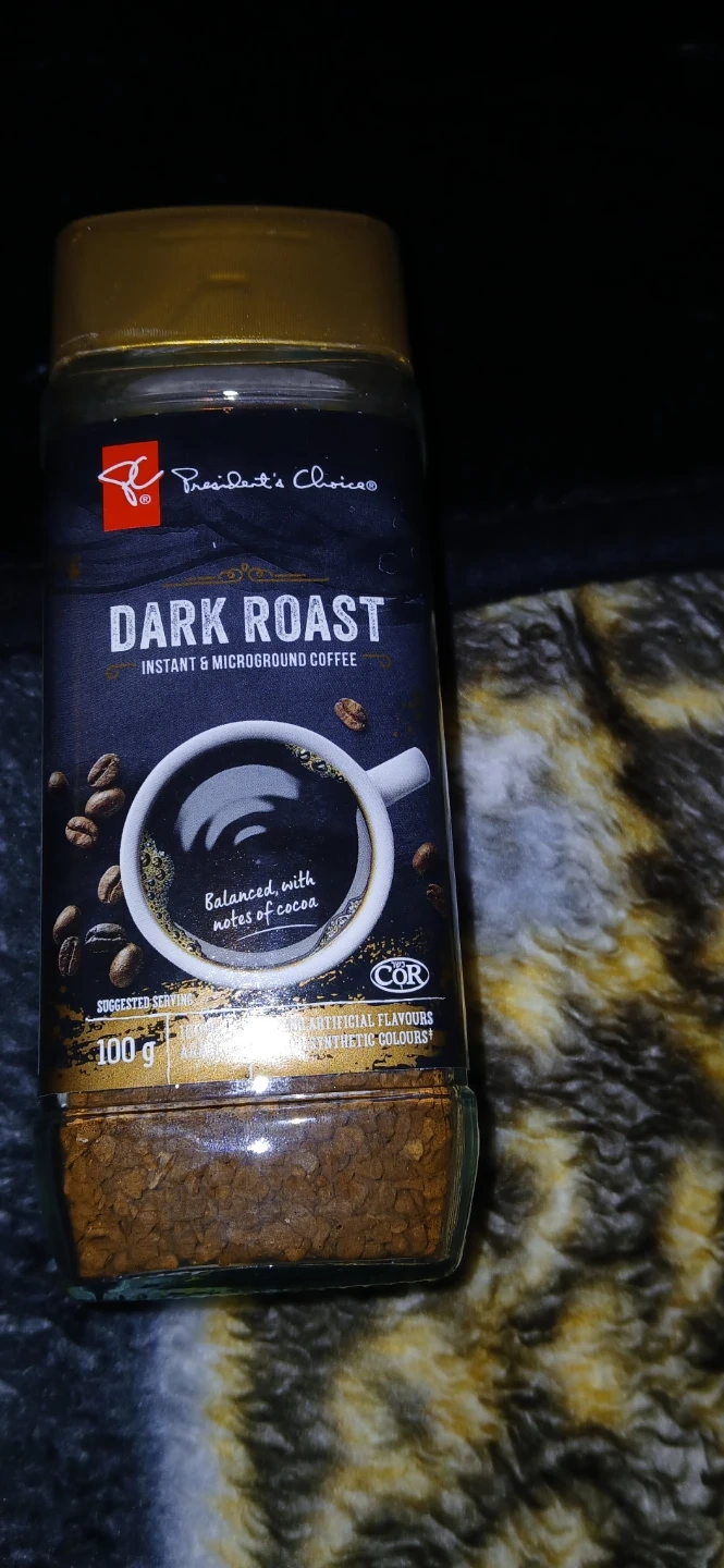 Selling a jar of President's Choice Dark Roast instant and microground coffee. It's balanced with notes of cocoa and contains no artificial flavours or synthetic colours. The jar contains 100g of coffee and has a best before date of 2026 January 03. still 98% full
