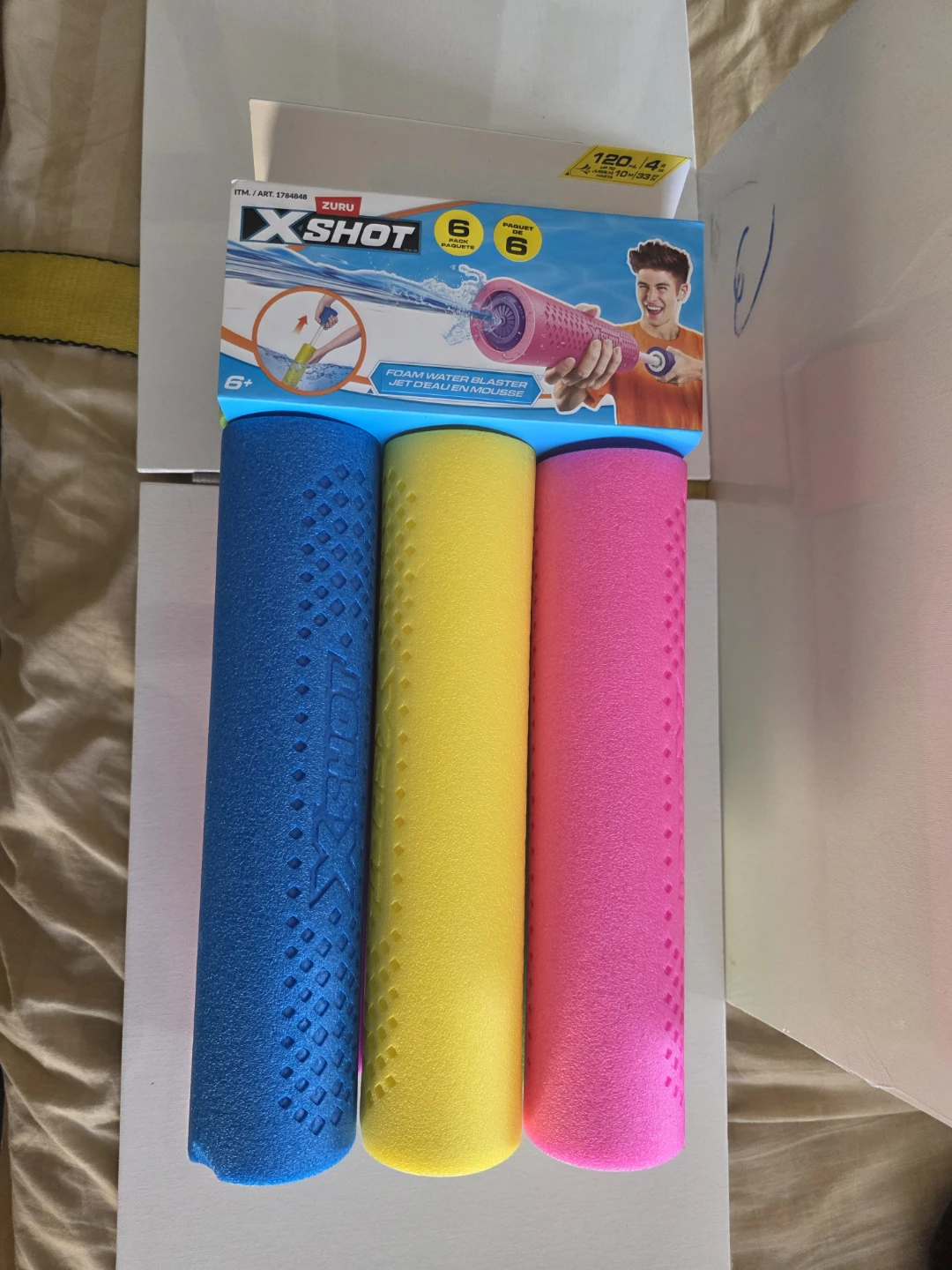Selling a set of six Zuru X-Shot foam water blasters! They're perfect for some summer fun in the sun. The box says they're recommended for ages 6+