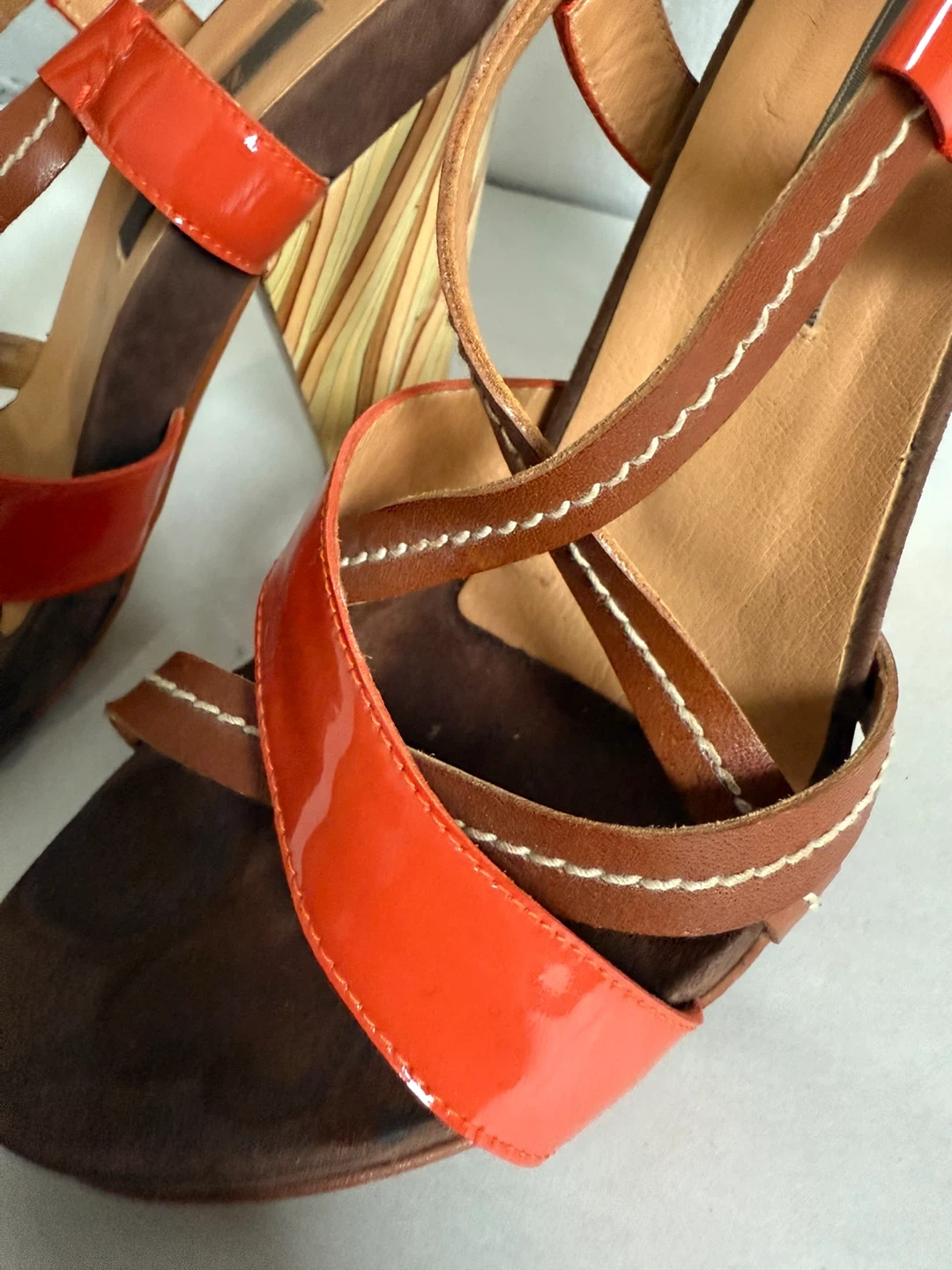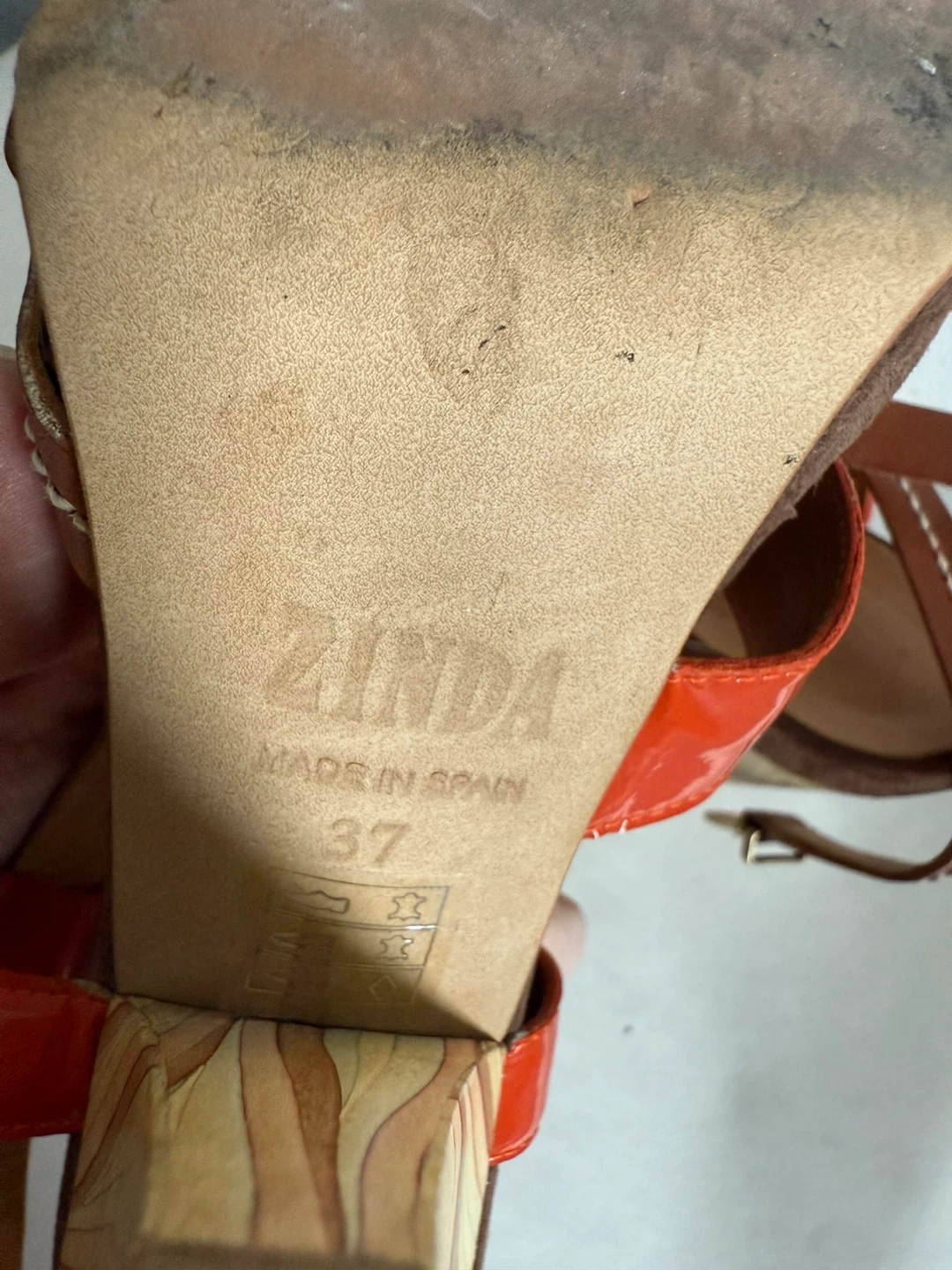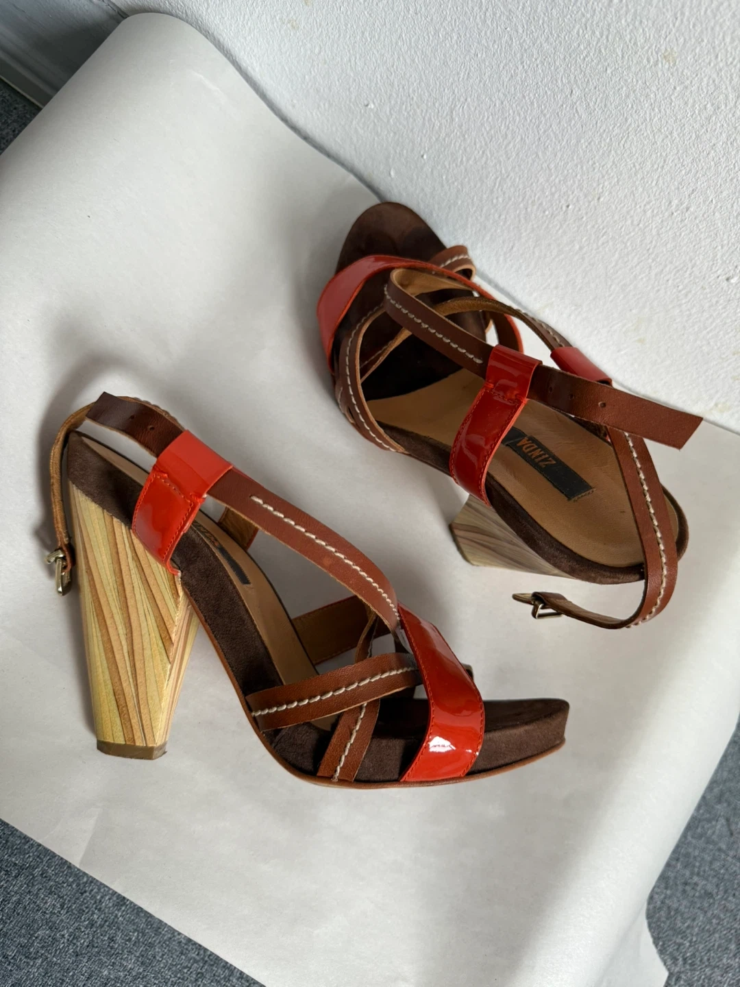 Stylish Zinda heels in a mix of orange and brown leather! These heels are a European size 37, which translates to a US size 7. Perfect for adding a pop of colour to your outfit