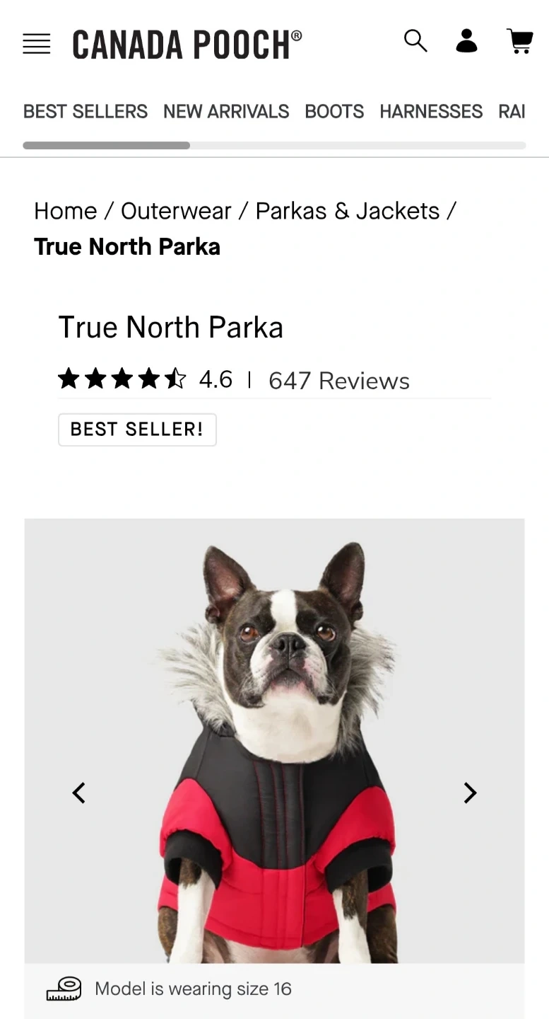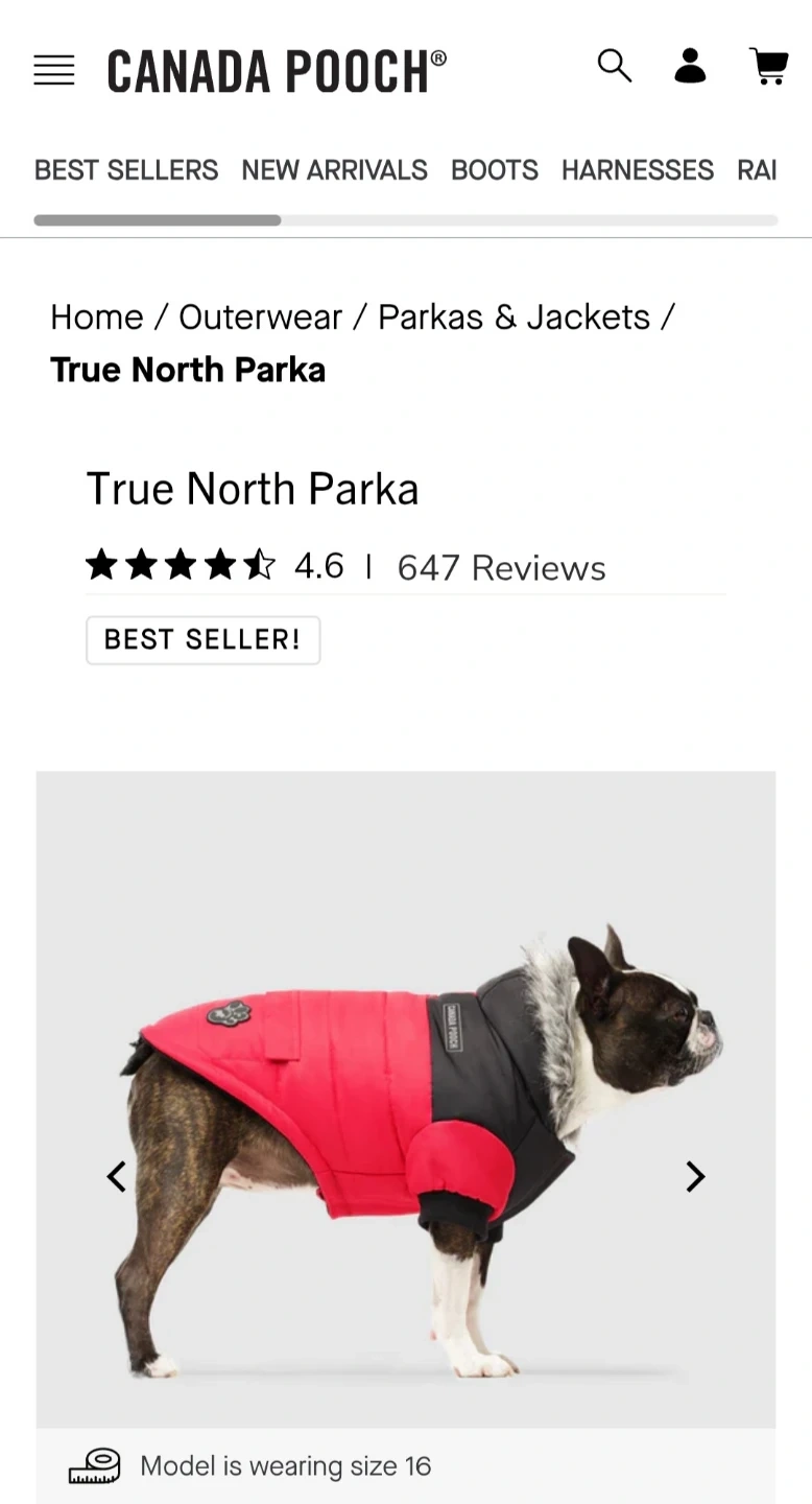 Selling Canada Pooch True North Parka! The size is 14. It's in perfect condition (used just a couple of times). Pictures of the real parka I am selling and some taken from Canada Pooch website. Please check measurements in the picture or on the website for size 14.