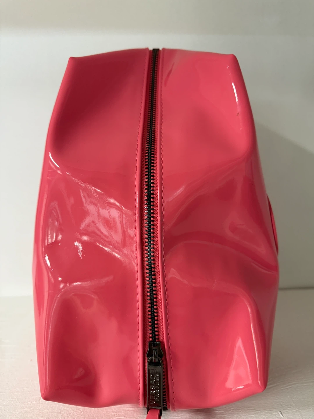 Here's a vibrant pink Versace Parfums cosmetic bag! It's perfect for storing your makeup and toiletries in style. The bag features the iconic Versace logo and a durable zipper closure