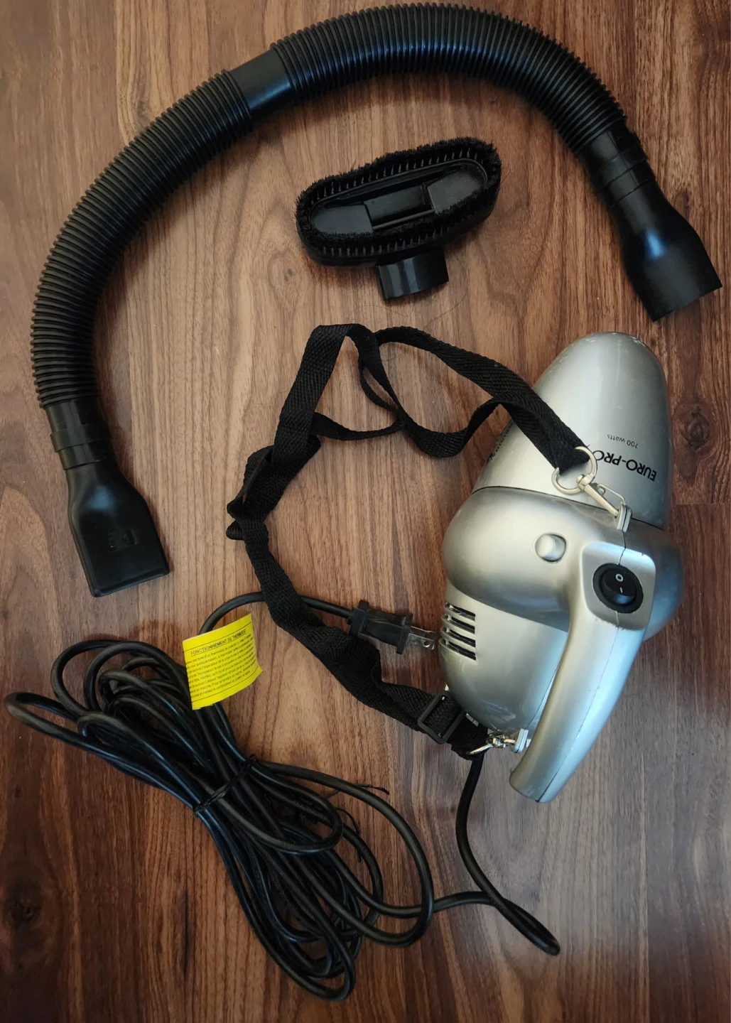 Handheld vacuum with attachments and a long cord.
