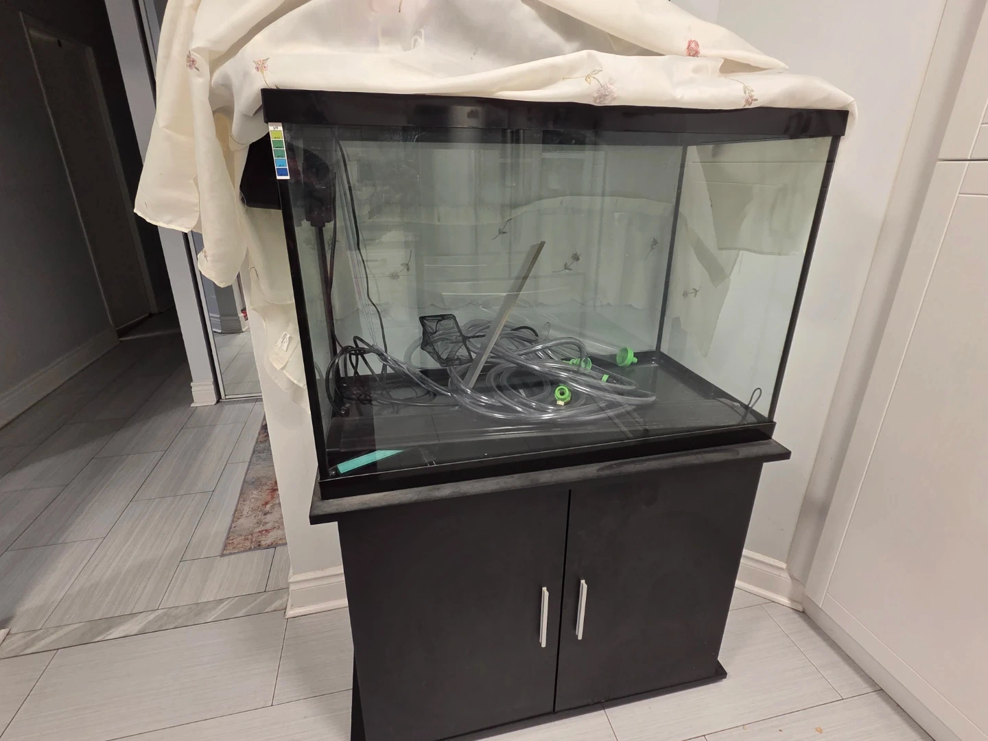 Selling a mildly used fish tank with a black cabinet attached. It comes with all the accessories shown in the pictures. Perfect for setting up your aquarium!