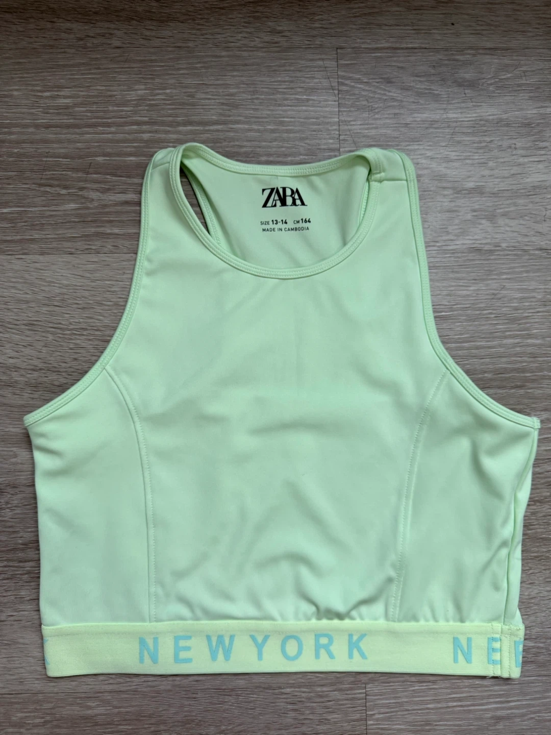 Girls' active tank top from Zara in size 13-14 (CM 164). It has a sporty design with 'NEW YORK' printed on the bottom band. Perfect for active