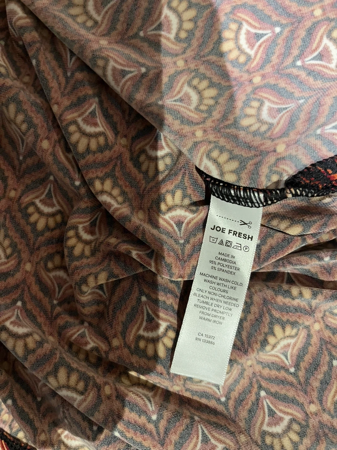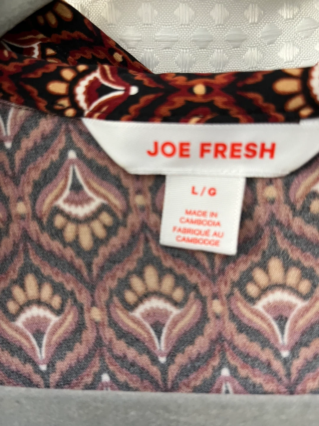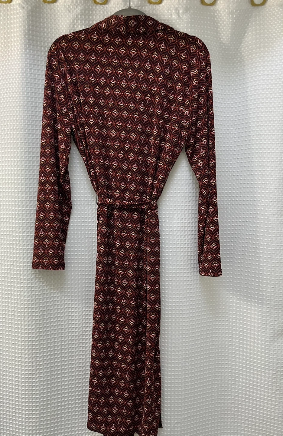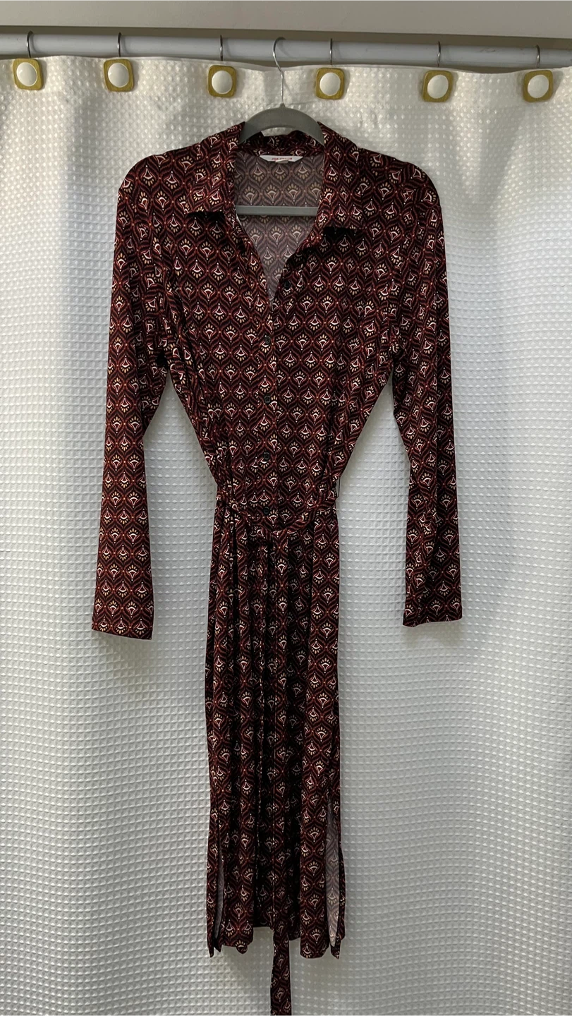 I'm selling a Joe Fresh dress in size L. It's a burgundy colour with a lovely pattern. The material is 95% polyester and 5% spandex, making it comfortable to wear. It has long sleeves and a tie at the waist and 2 small side slits. In new condition!