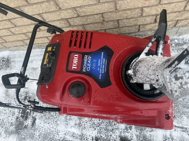 This is a Toro Power Clear 721E, 21-inch, 7 hp electric start snowblower, ready to tackle winter's challenges. It's in used condition, but still performs like new. New paddles and scraper at beginning of season. New spark plug and fresh oil. Nice clean machine.