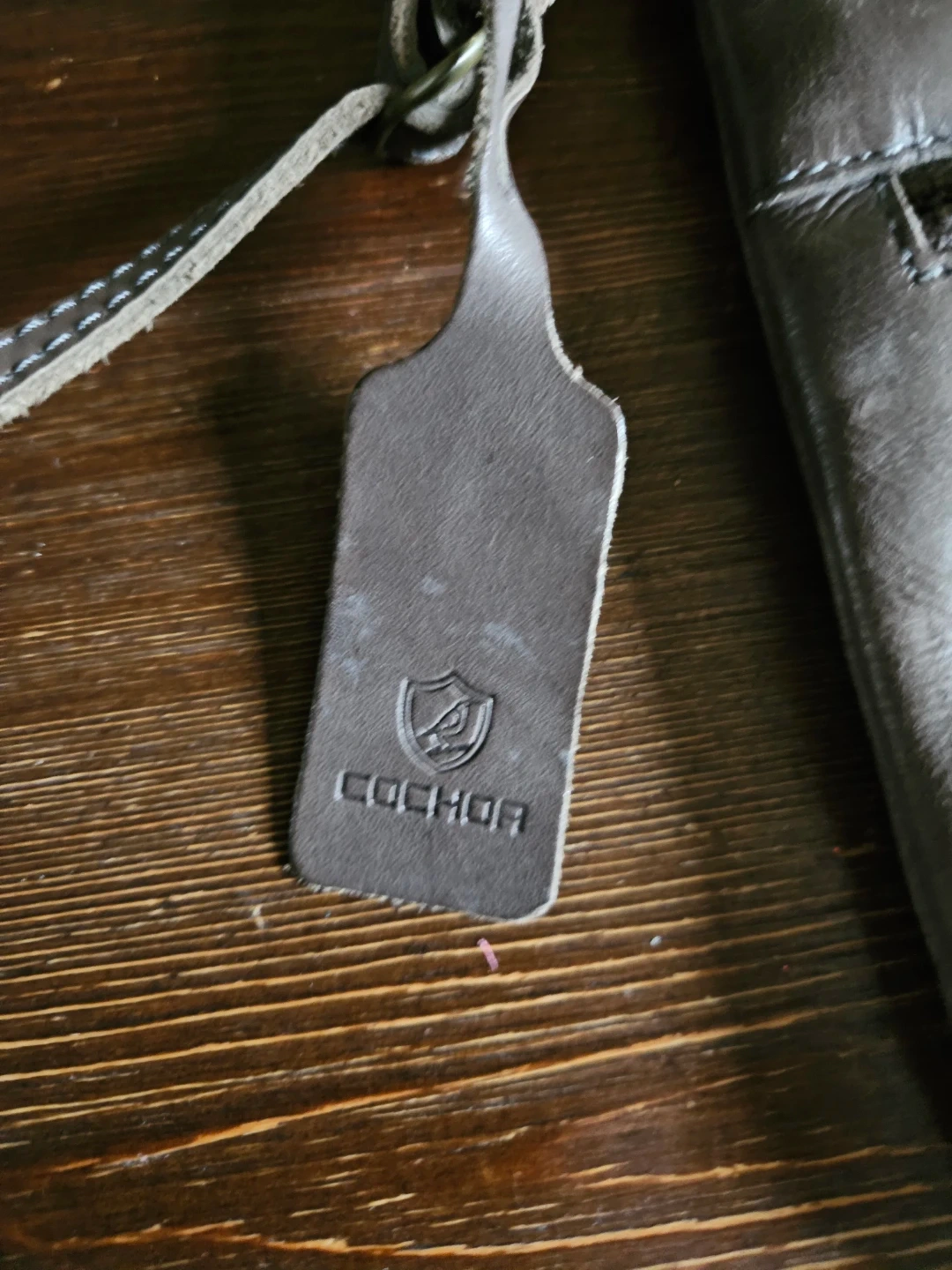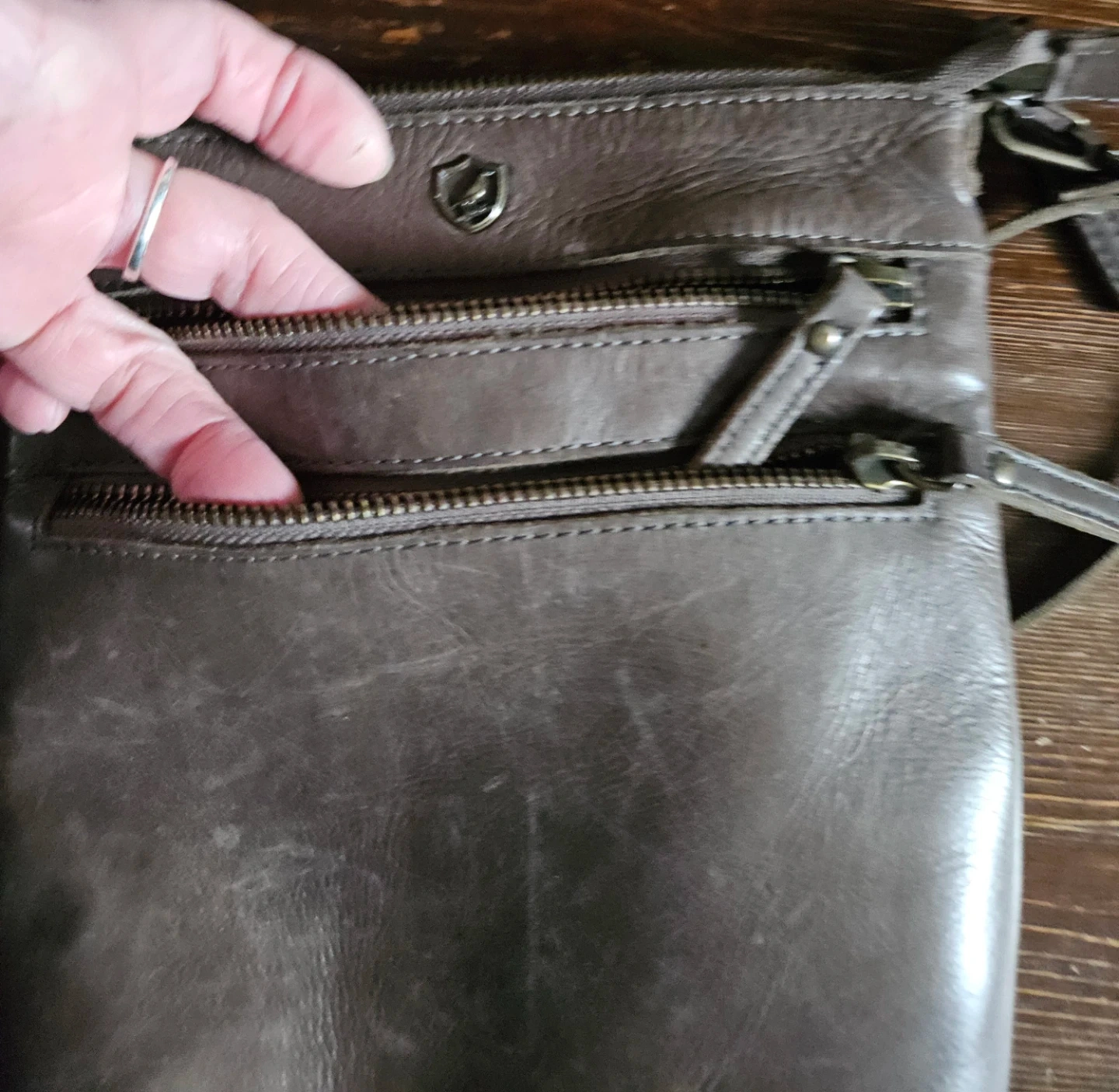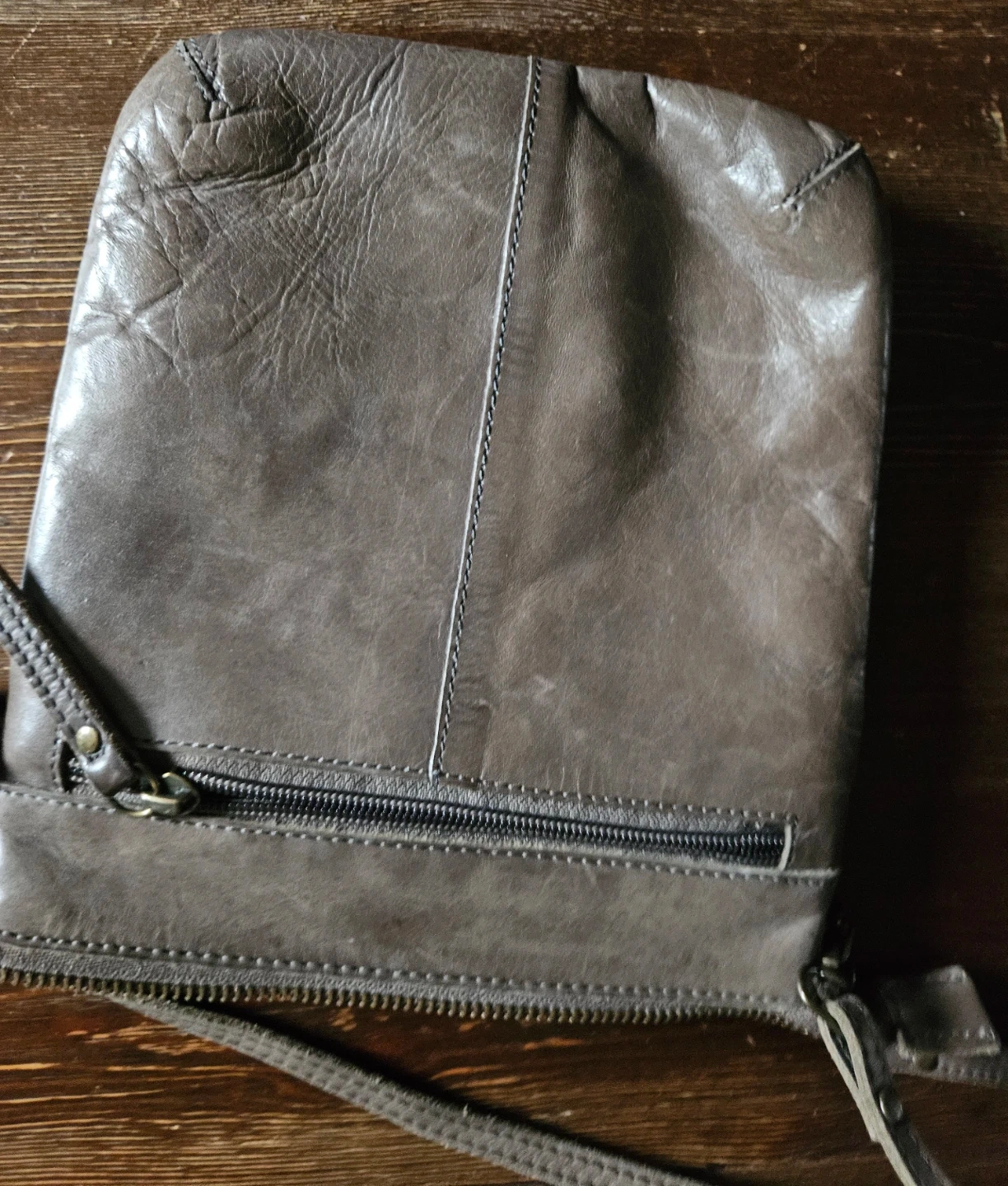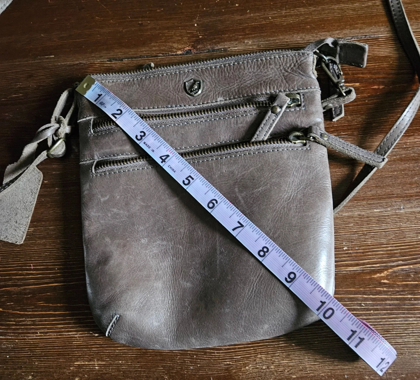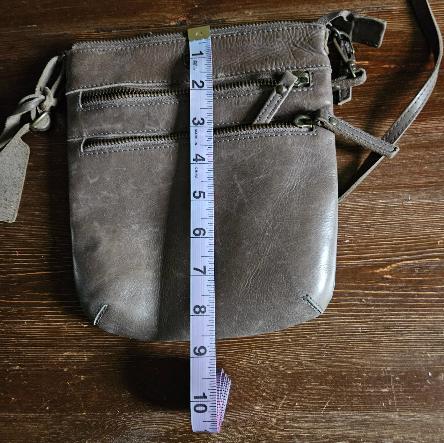 Here's a small new Cochor leather crossbody bag in grey. . It's approximately 10 inches tall and 11 inches wide. Great for everyday use! Numerous zippered pockets, and is adjustable. Pick up east mountain
