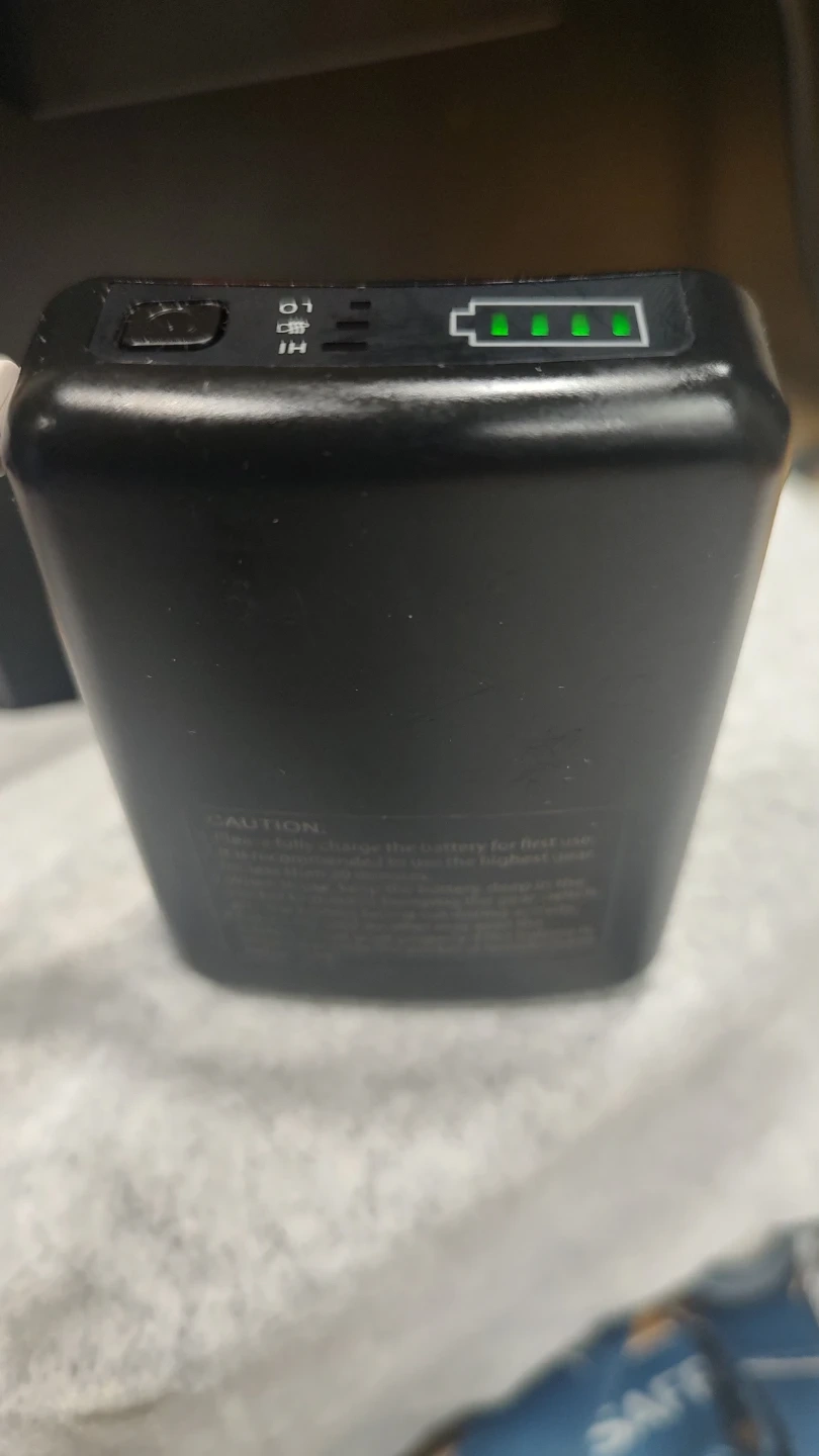 Selling a black battery pack. It has a low and high setting. Please fully charge the battery for first use. It is recommended to use the highest gear for less than 20 minutes at a time. When the battery is deep in the pocket and the battery fails during activity, extremely cold weather may cause the battery to not work properly if the battery is exposed outside the pocket at temperatures below 20°C