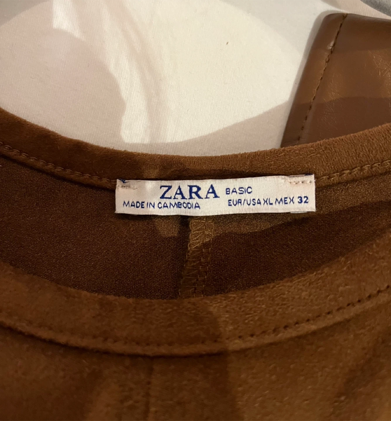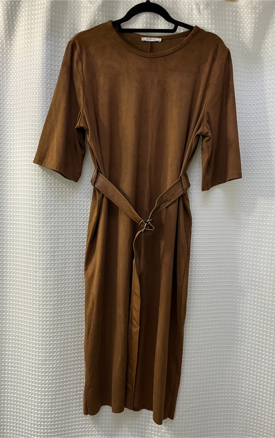 Selling a Zara belted dress in a lovely brown colour. It's a size XL and in great condition! The material has a soft, suede-like feel. Perfect for a casual or dressed-up look. Has a belt too!
