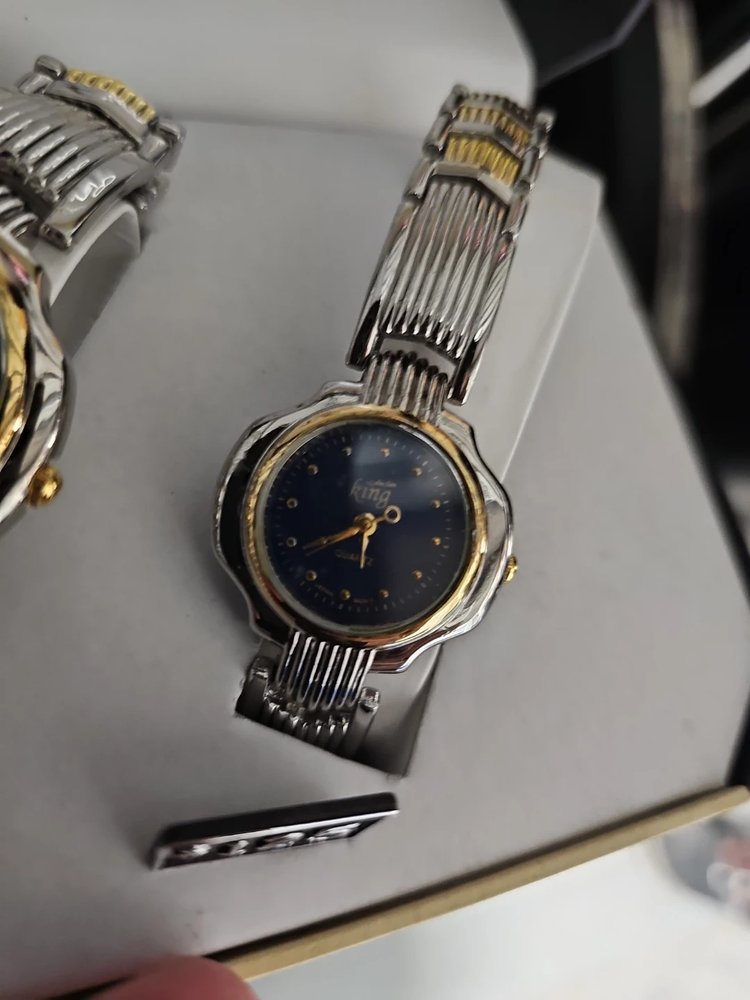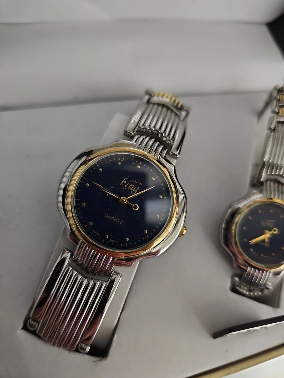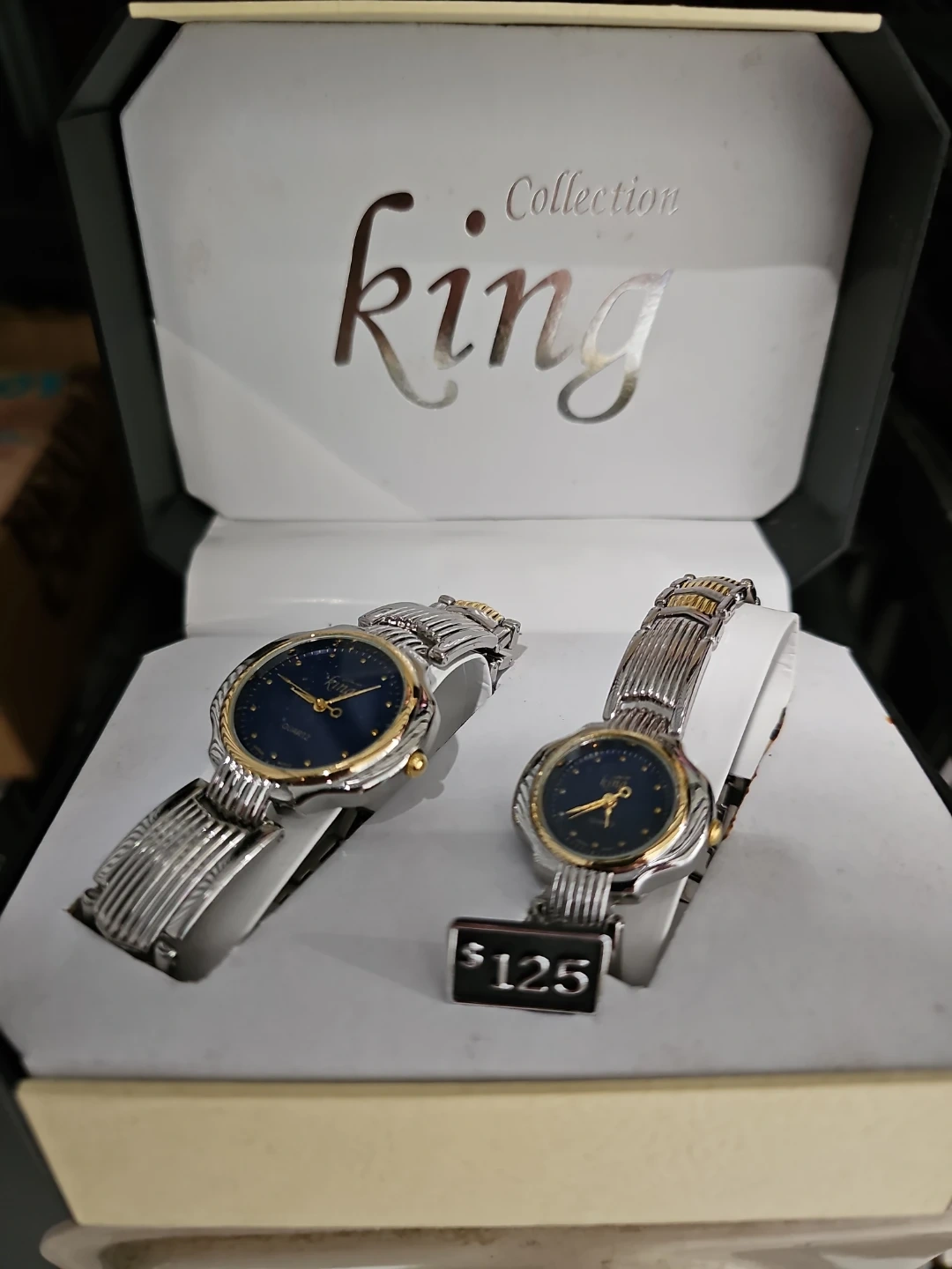 Selling a King Collection his and hers quartz watch set. The watches are in good condition and come in the original box. The set includes two watches, one for him and one for her. Originally bought for $125