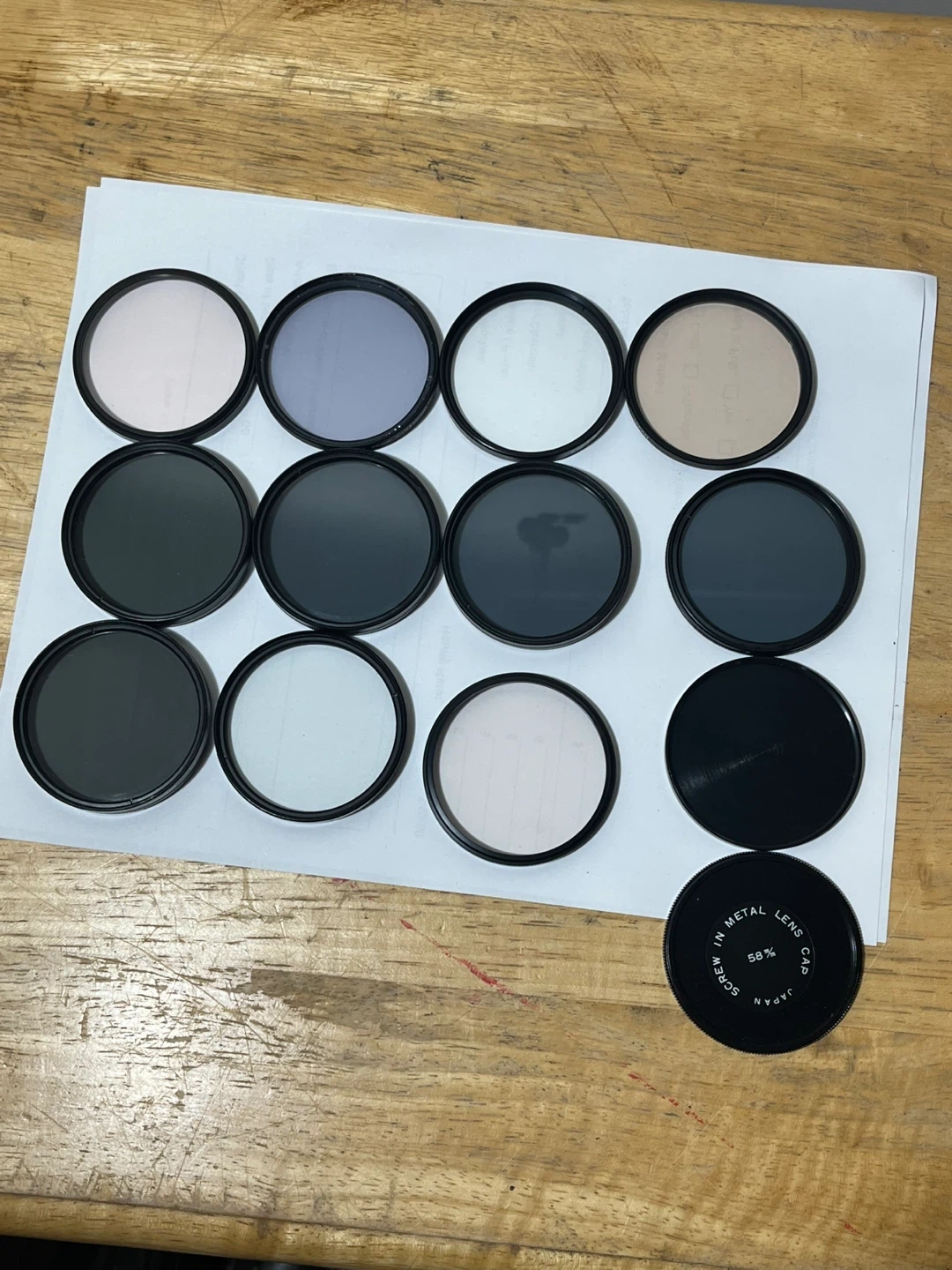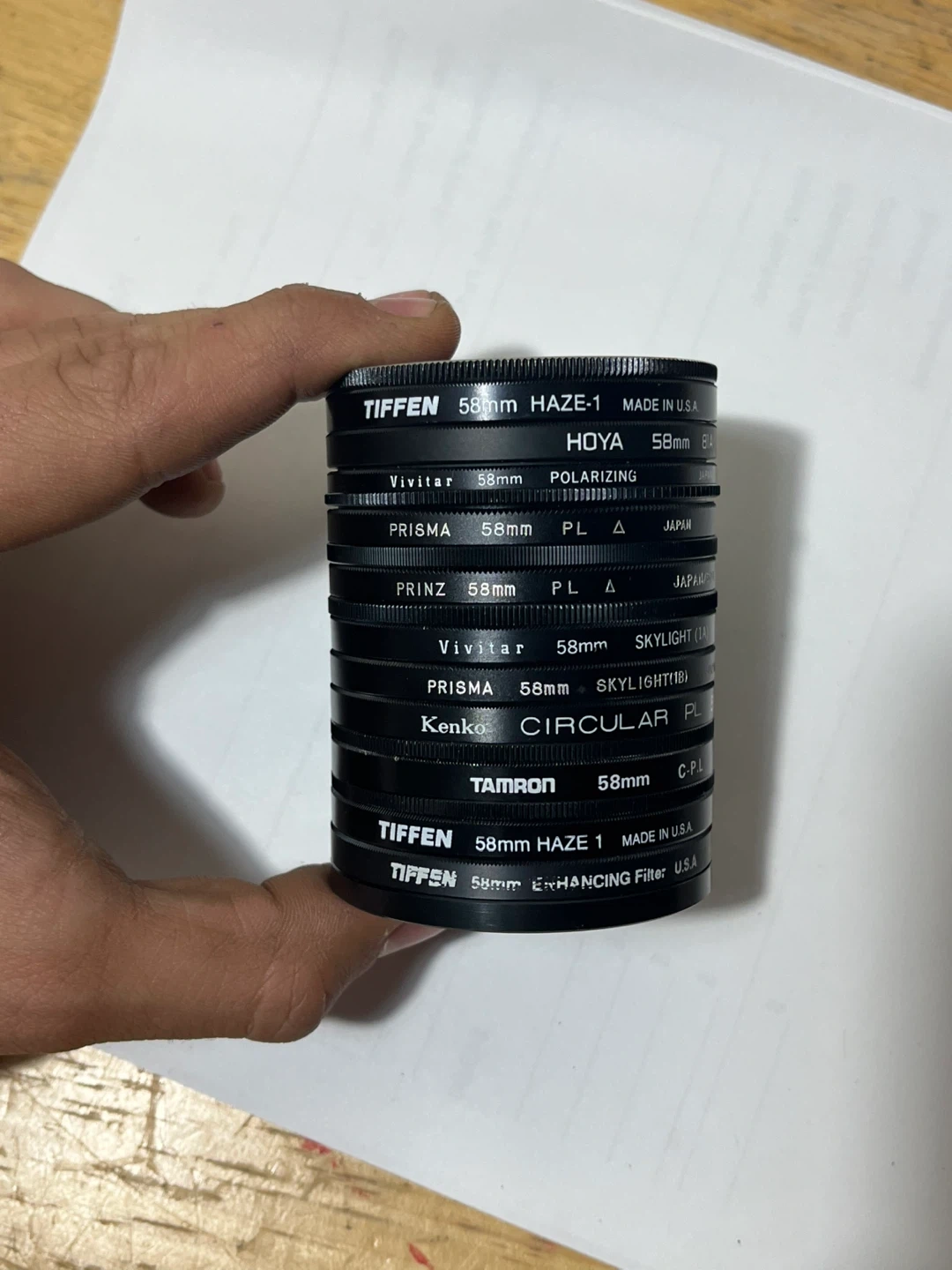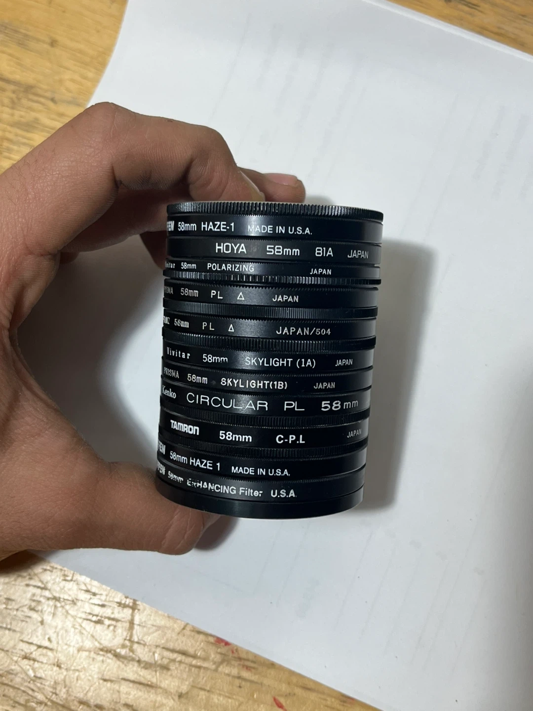 Selling a collection of 58mm camera lens filters. Includes brands like Tiffen, Hoya, Vivitar, Prisma, Prinz, Kenko, and Tamron. Great for experimenting with different effects and enhancing your photography! Comes with caps for top and bottom. All sold together.