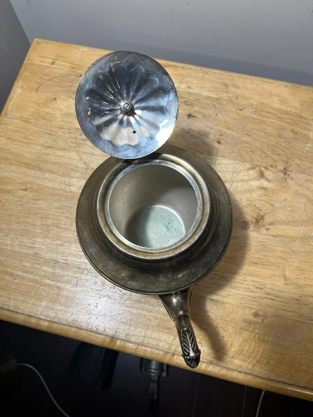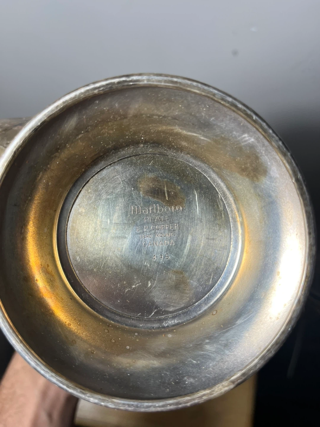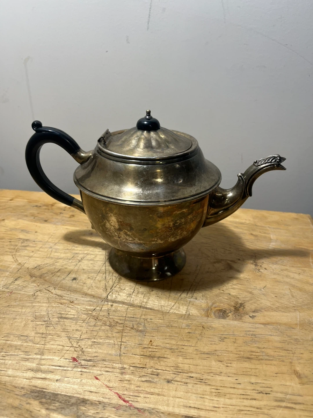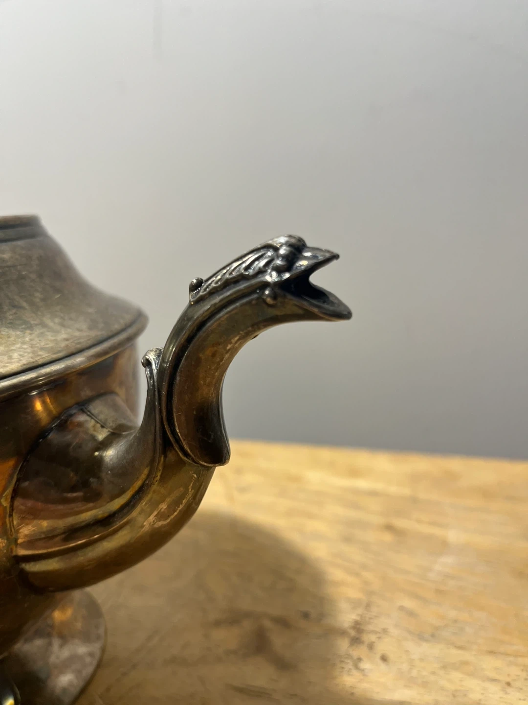 Selling a Marlboro Plate teapot. It's a beautiful piece with a unique dragon-shaped spout and black handle. The bottom is marked "Marlboro Plate E.P. Copper Lead Mounts Canada 335".