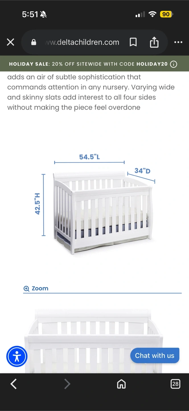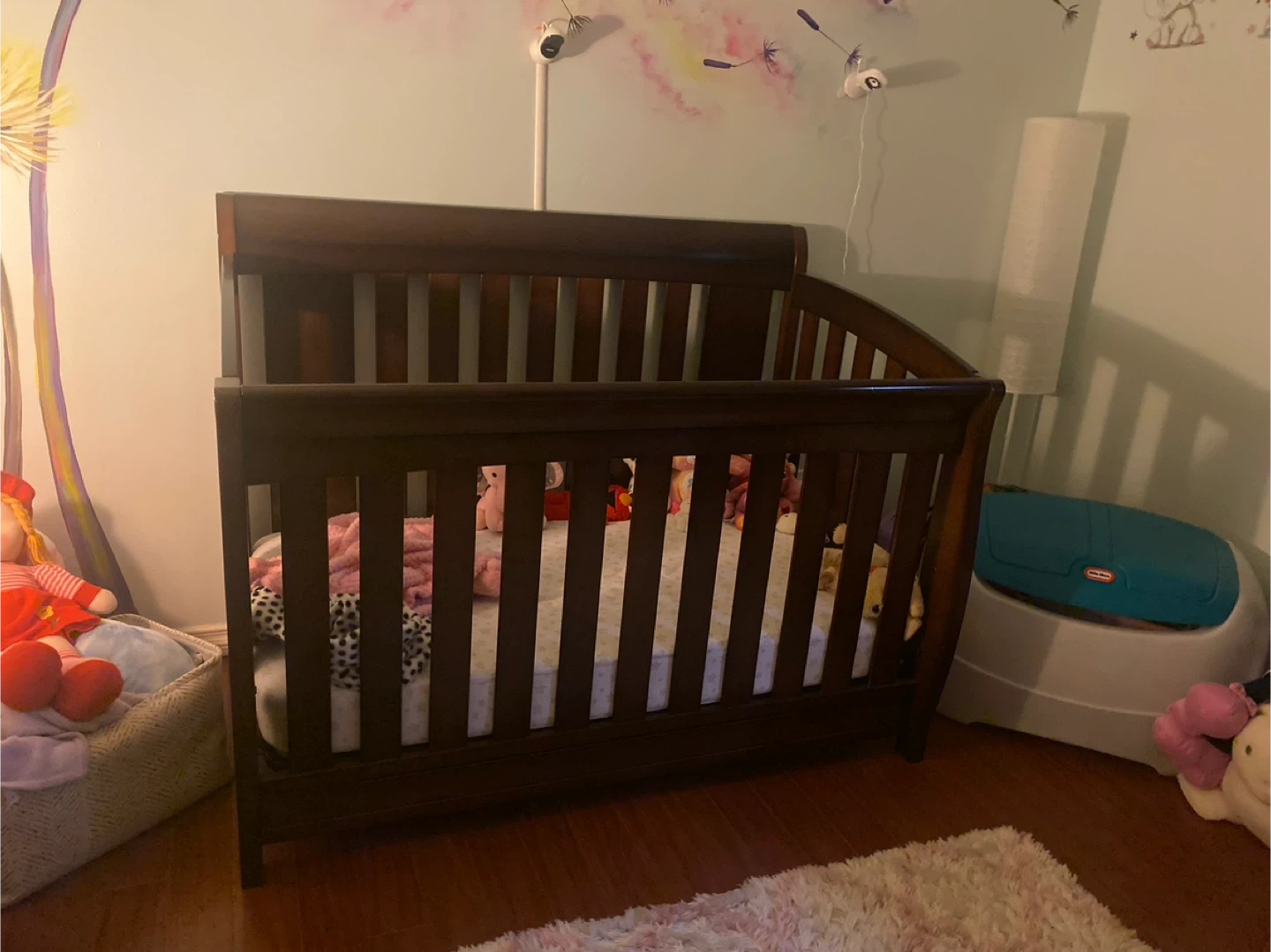Selling a Delta Children crib in dark chocolate colour! It's in great condition and ready for a new home. Dimensions are 54.5" L x 34" D x 42.5" H. Adds an air of subtle sophistication to any nursery with varying wide and skinny slats.