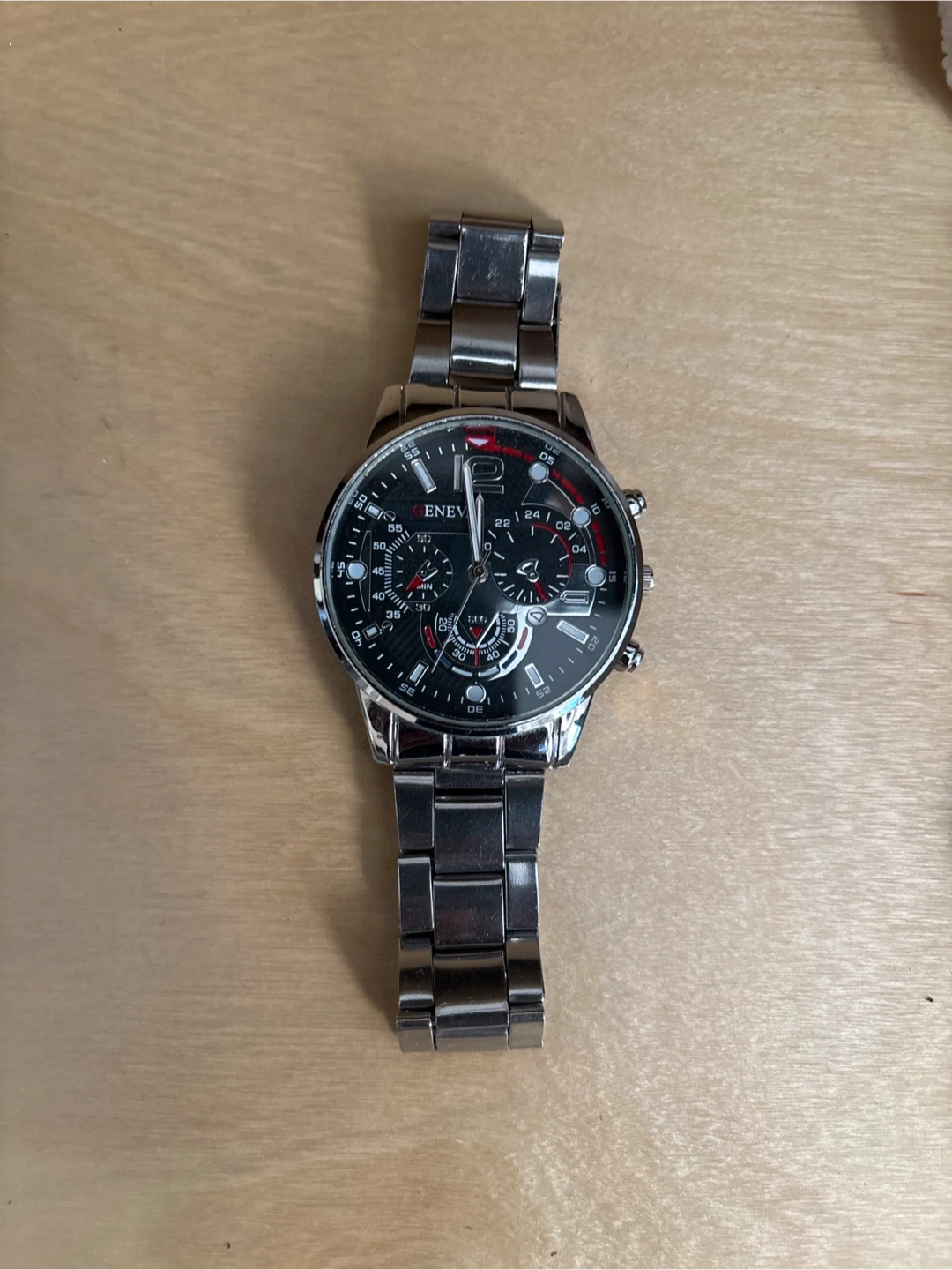 Selling a silver-toned l wrist watch! It has a black face with multiple dials (Only for fashion, doesn’t turn) and a stainless steel band. It's a stylish accessory for everyday wear. Open to negotiations!