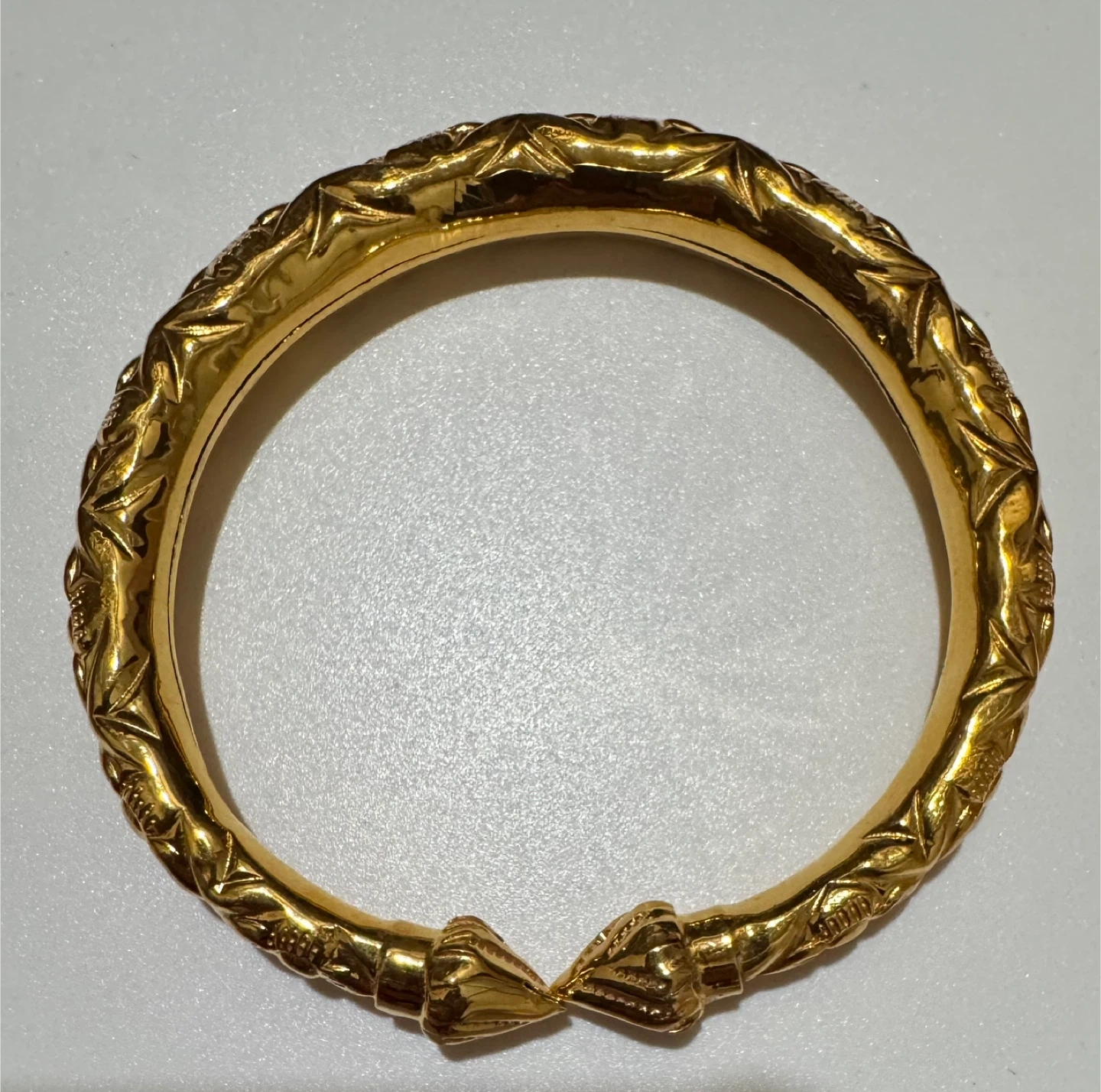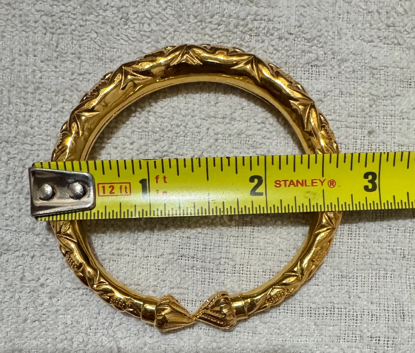 Beautiful gold bangle bracelet with intricate detailing. It weighs approximately 12 grams and has a diameter of about 2.5 inches. This bracelet is in great condition and would make a lovely addition to any jewelry collection