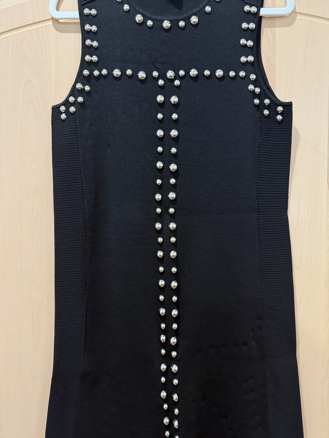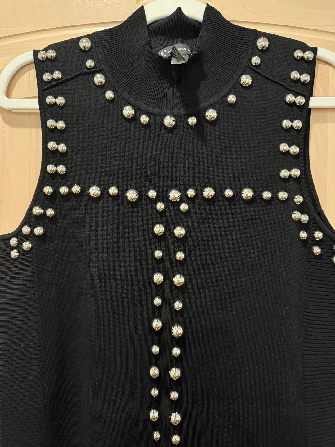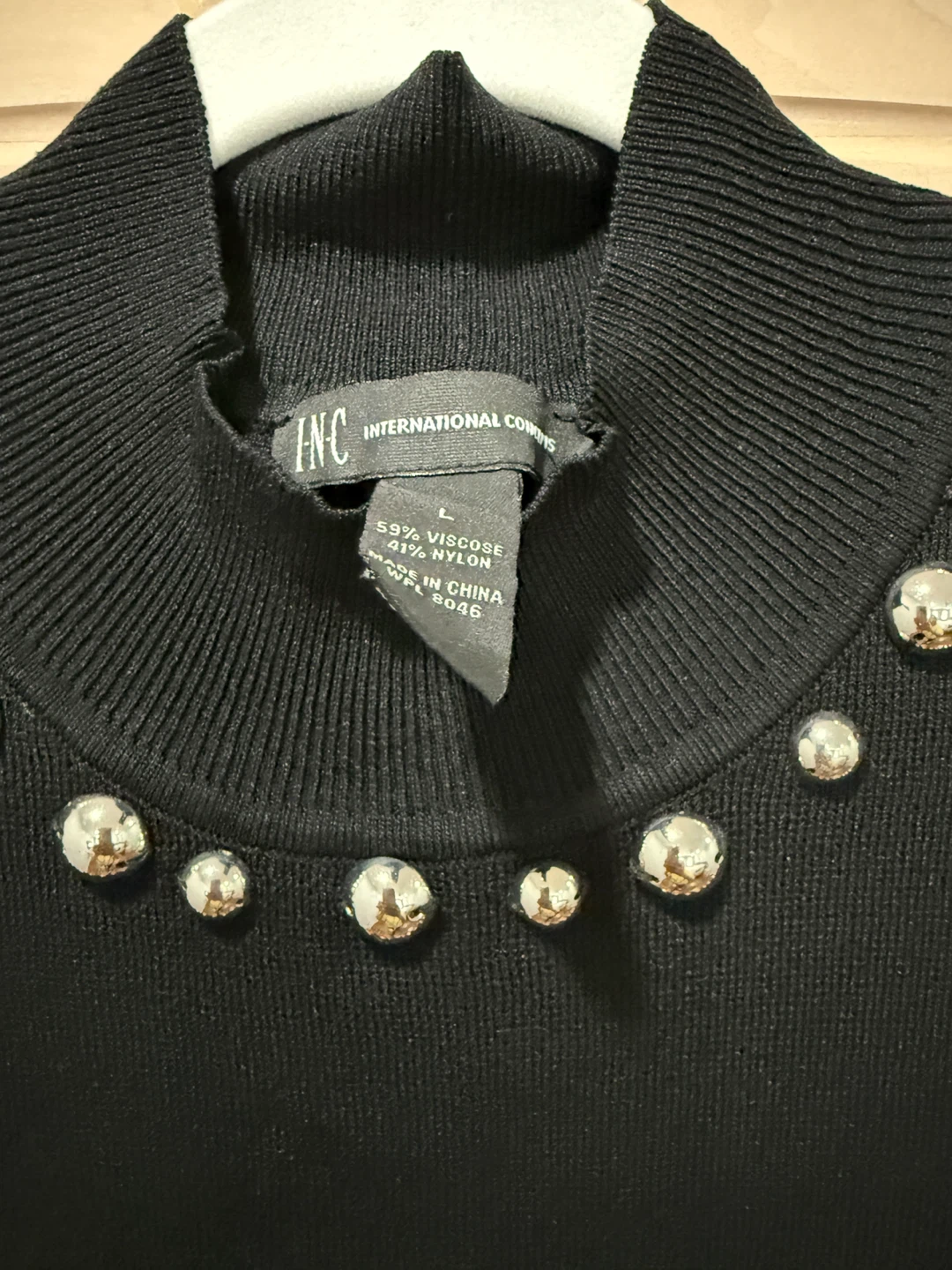 Selling a stylish INC International Concepts black sweater dress. It's a size L and features a unique studded design. The material is a blend of 59% viscose and 41% nylon. Perfect for adding a bit of edge to your wardrobe!