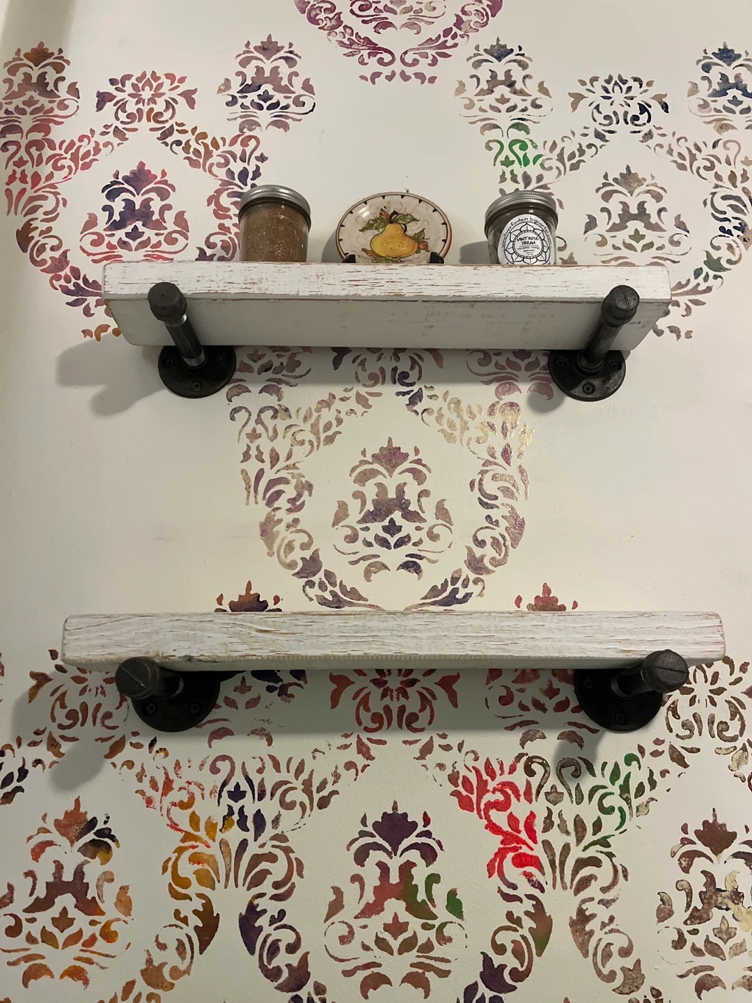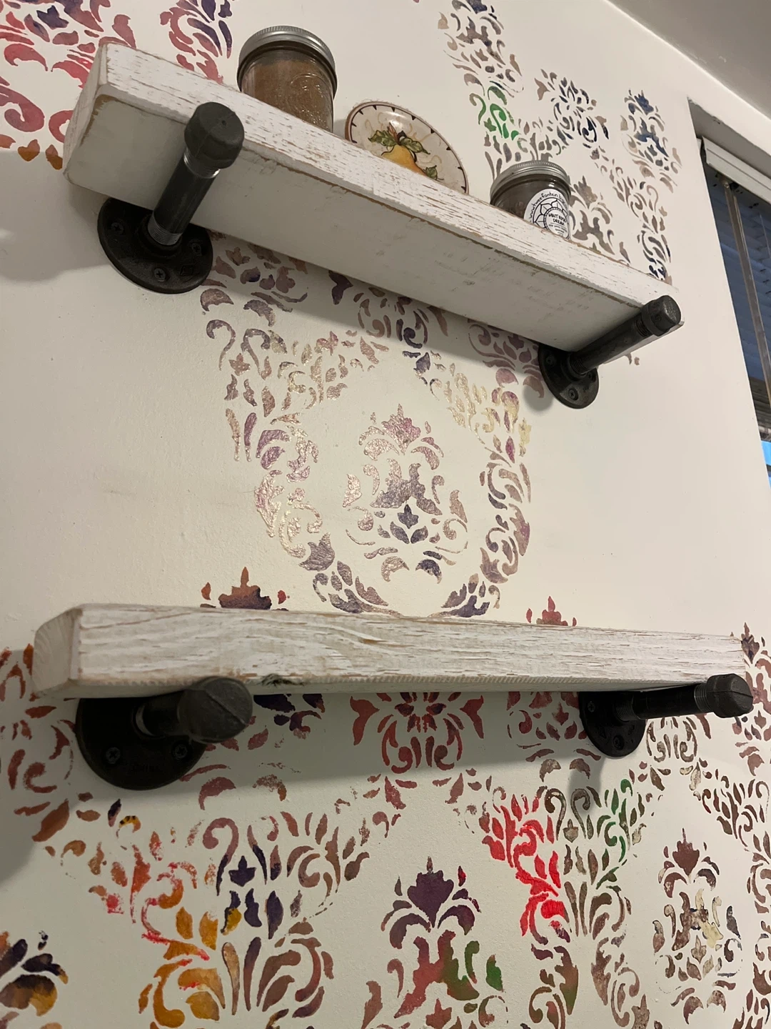 Here are two rustic shelves with a white wood finish and iron pipe supports. They're perfect for adding a touch of industrial charm to any room. They're in great condition and ready to be installed!