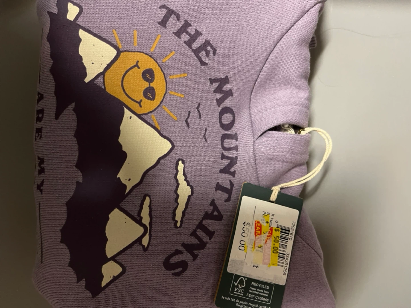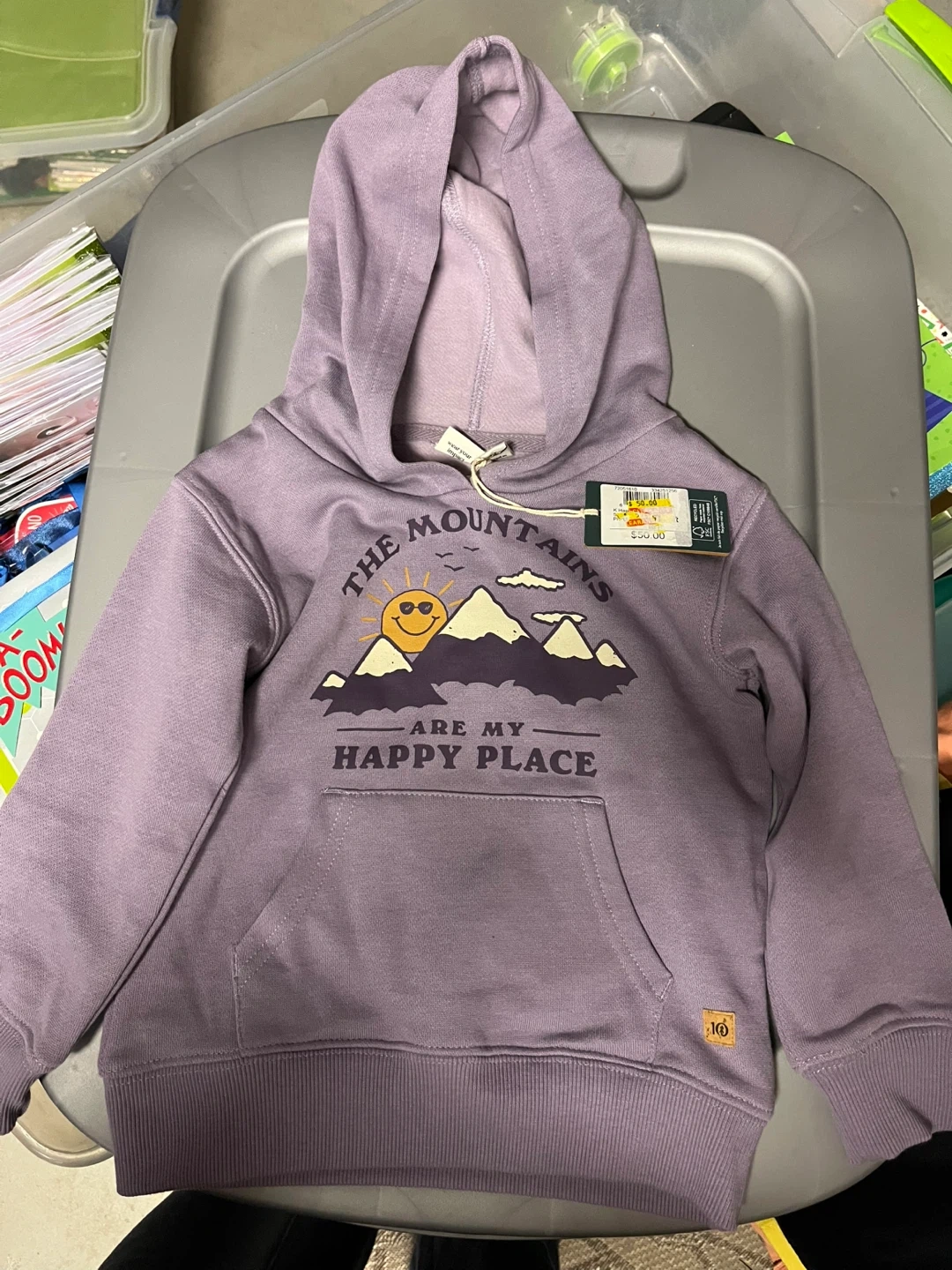 I'm selling a size 3 brand new kids hoodie with the tag still attached! It features a cute design with mountains and a smiling sun. The original price was $50.00.