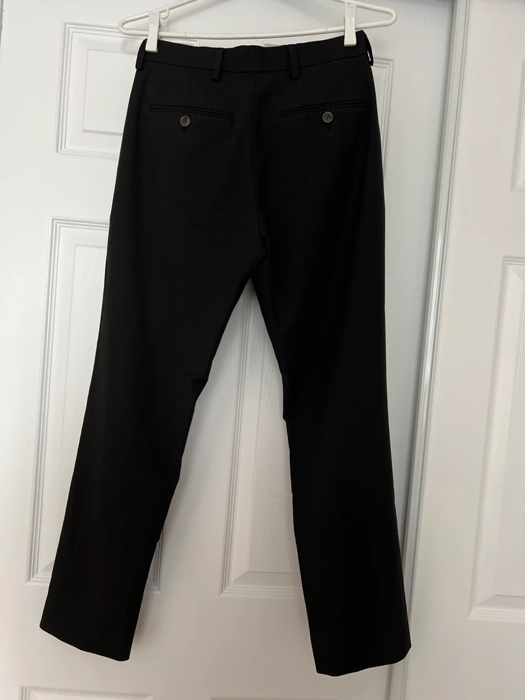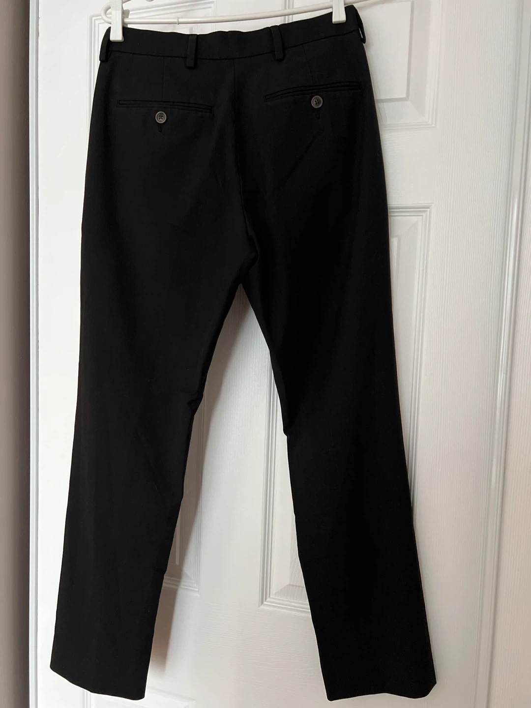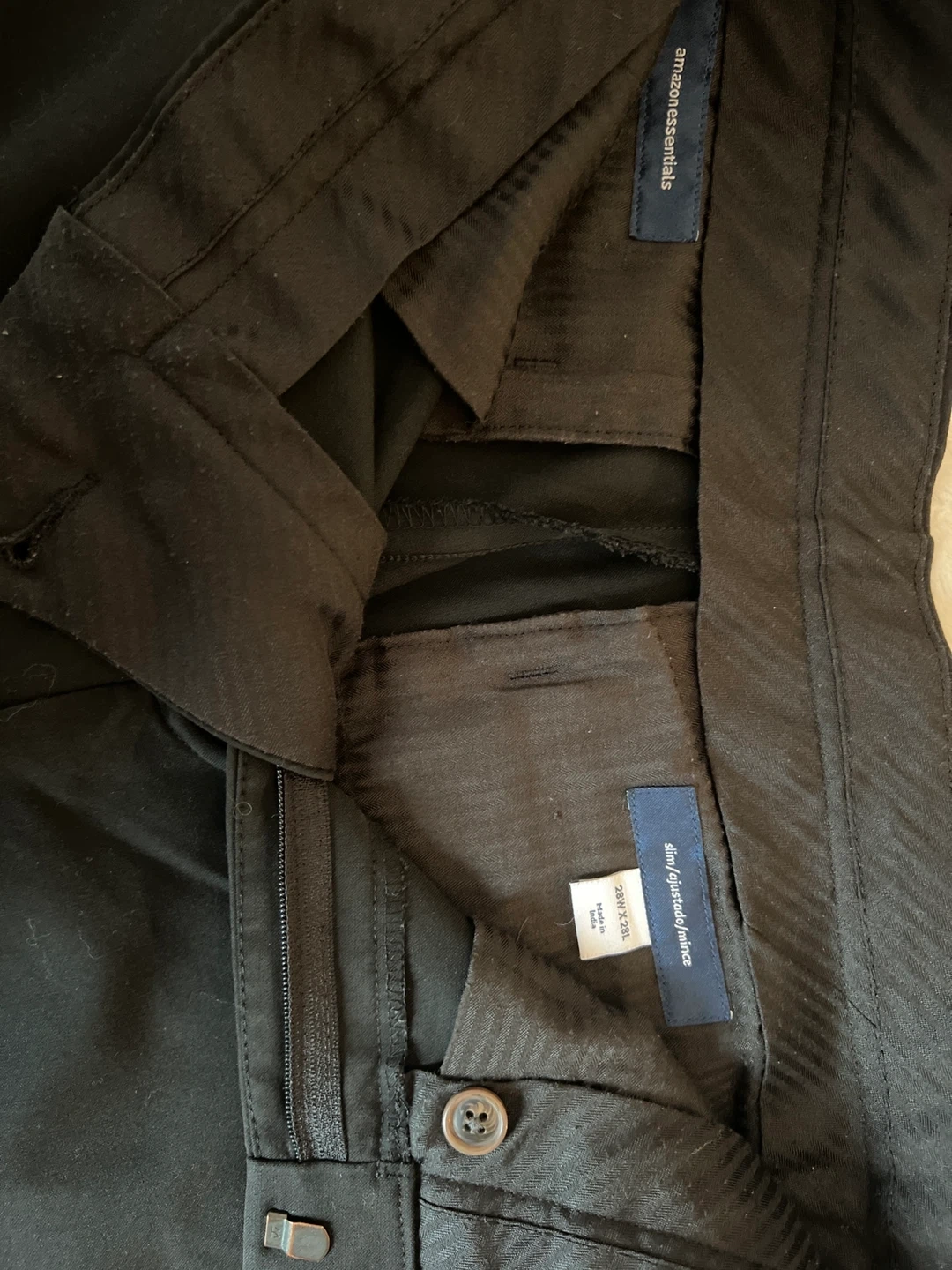 Selling a pair of Amazon Essentials dress pants in black. The size is 28W x 32L. They are in perfect condition and ready for a new wardrobe