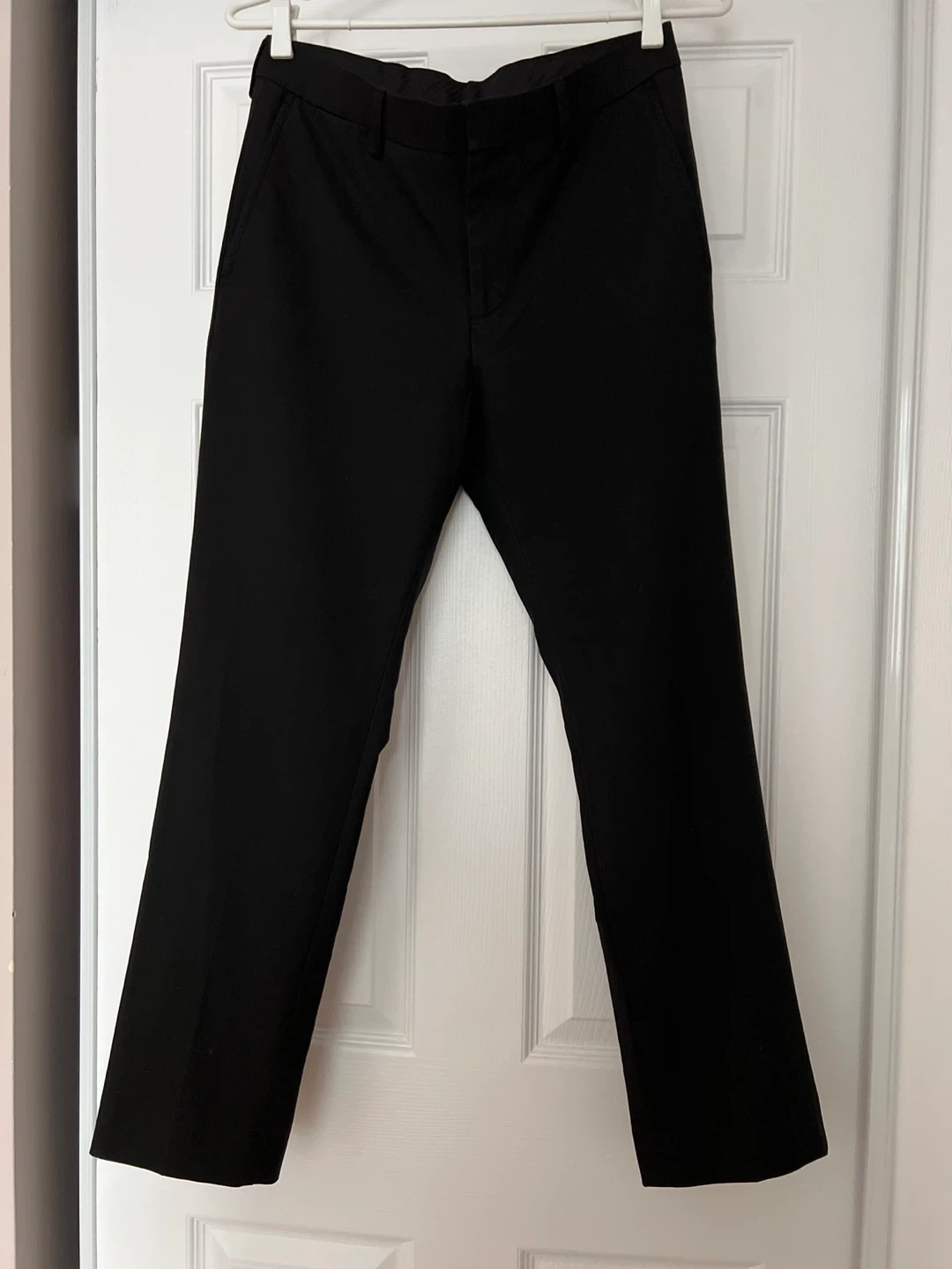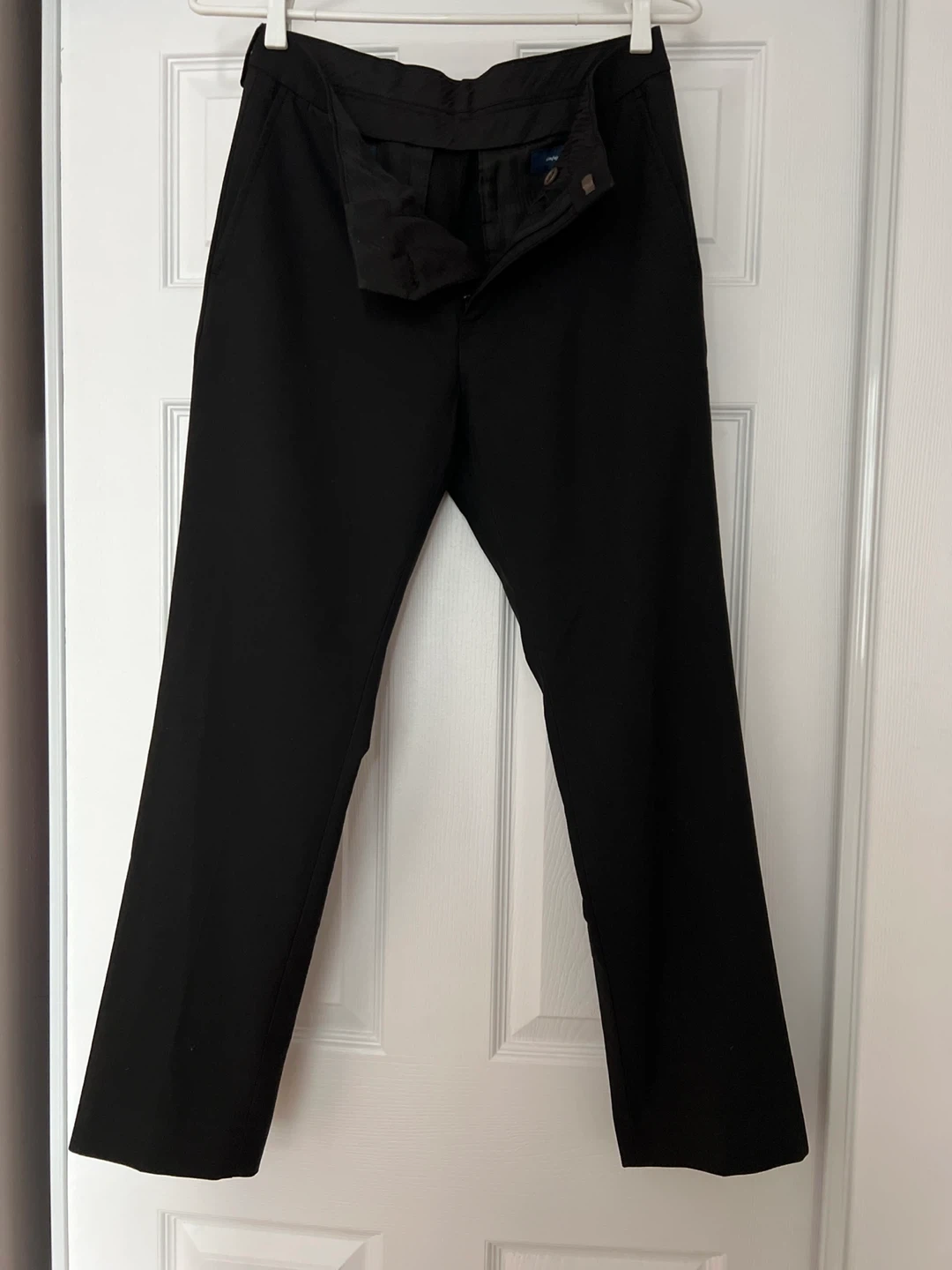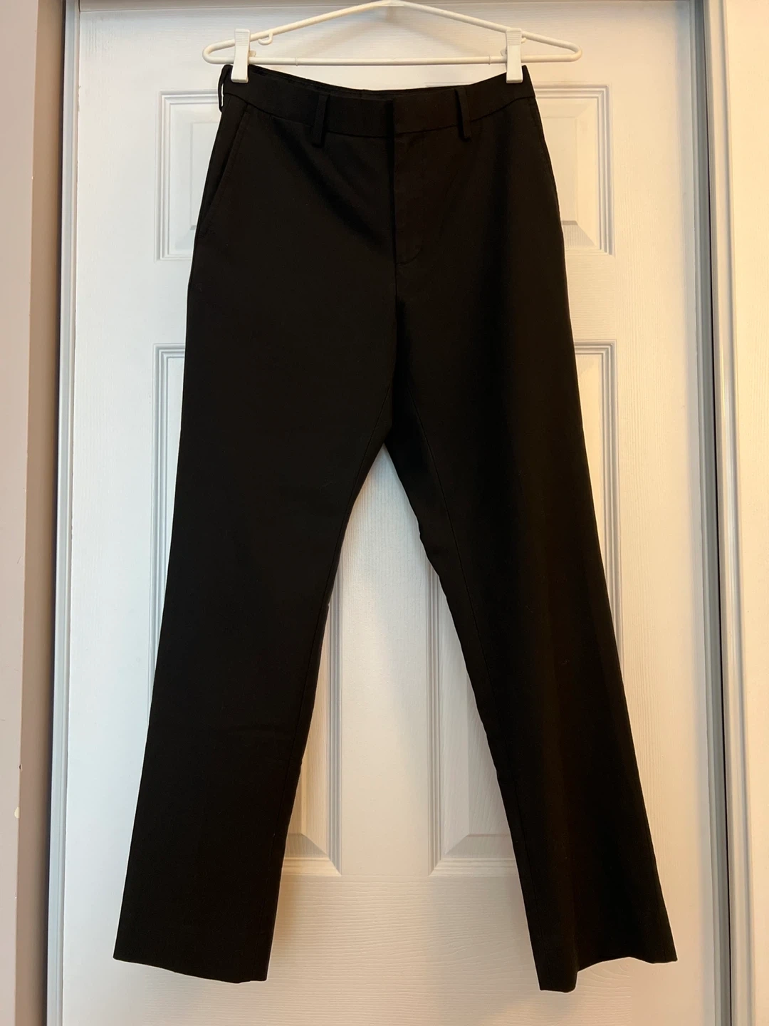 Selling a pair of Amazon Essentials dress pants in black. The size is 28W x 32L. They are in perfect condition and ready for a new wardrobe