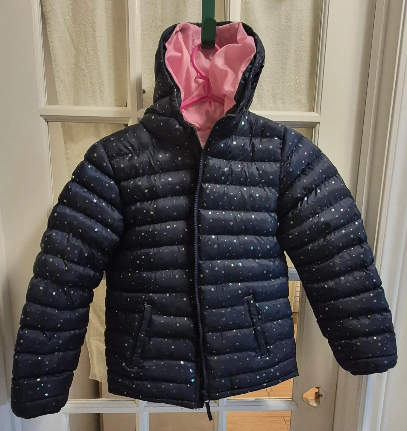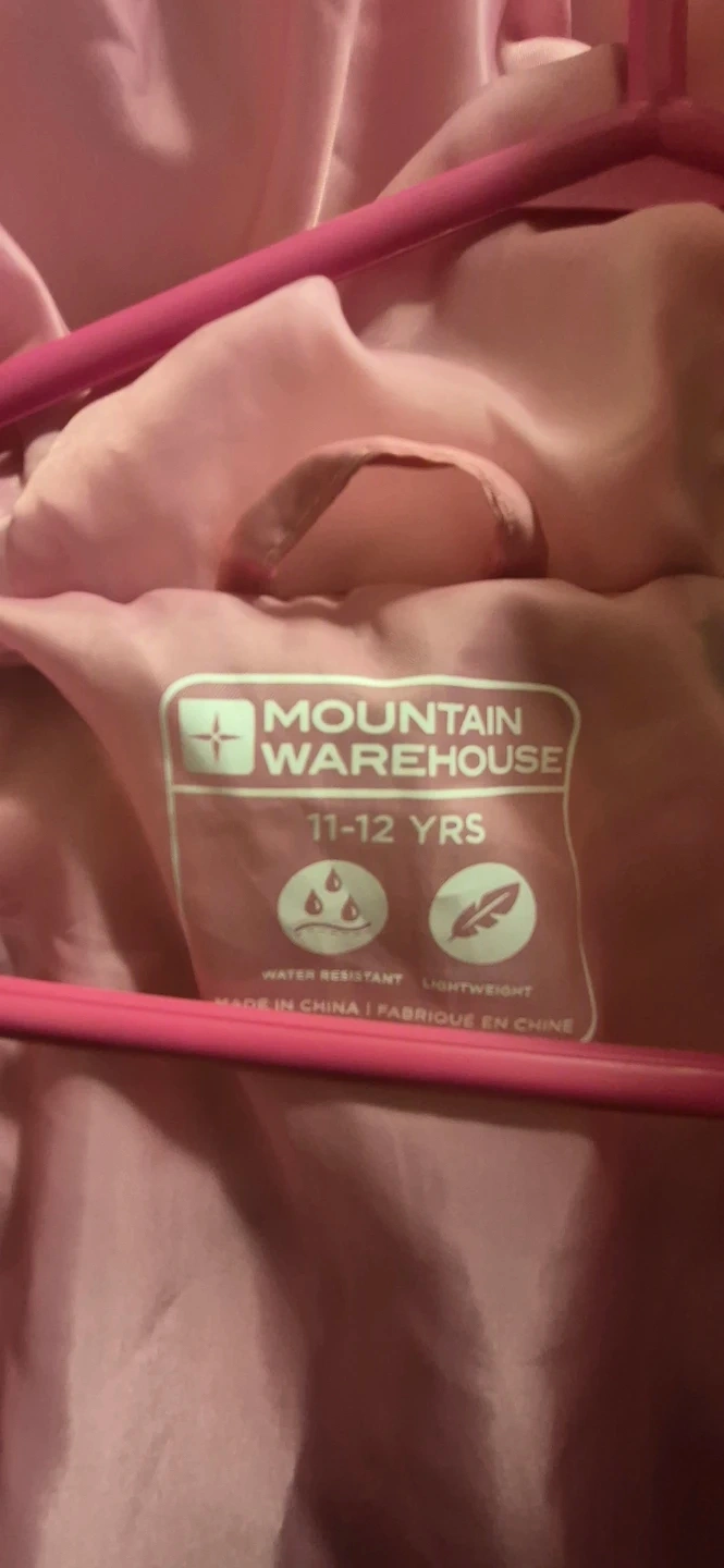 This Mountain Warehouse puffer jacket is perfect for keeping your little one warm and cozy! It's a size 11-12 years, and it's water resistant and lightweight. The jacket features a stylish design with a navy blue exterior and a pink interior.