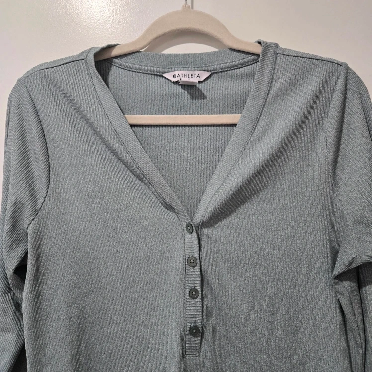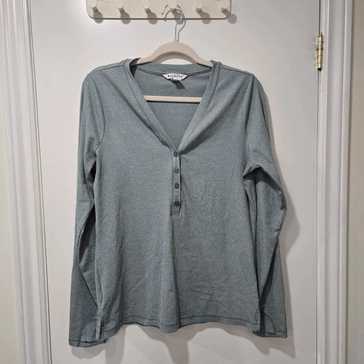 Light teal ribbed athletic material. Longsleeved. Henley neckline with buttons on the front. Thumbholes at the wrists. Longer length body.