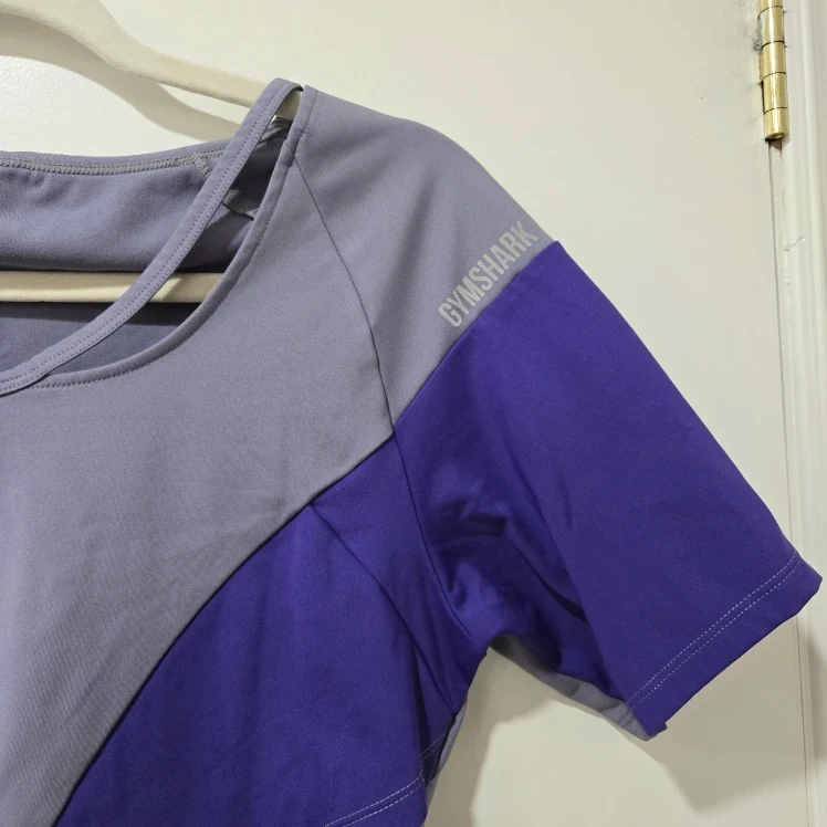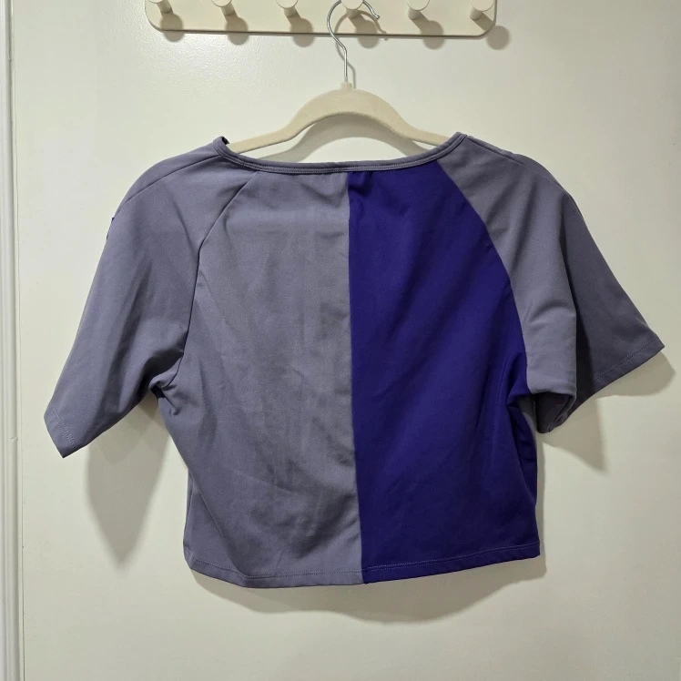 Flattering form fitting cropped t-shirt. Longer length sleeves. Asymmetric cut out details on the side. Colourblock panels grey-purple and royal blue.